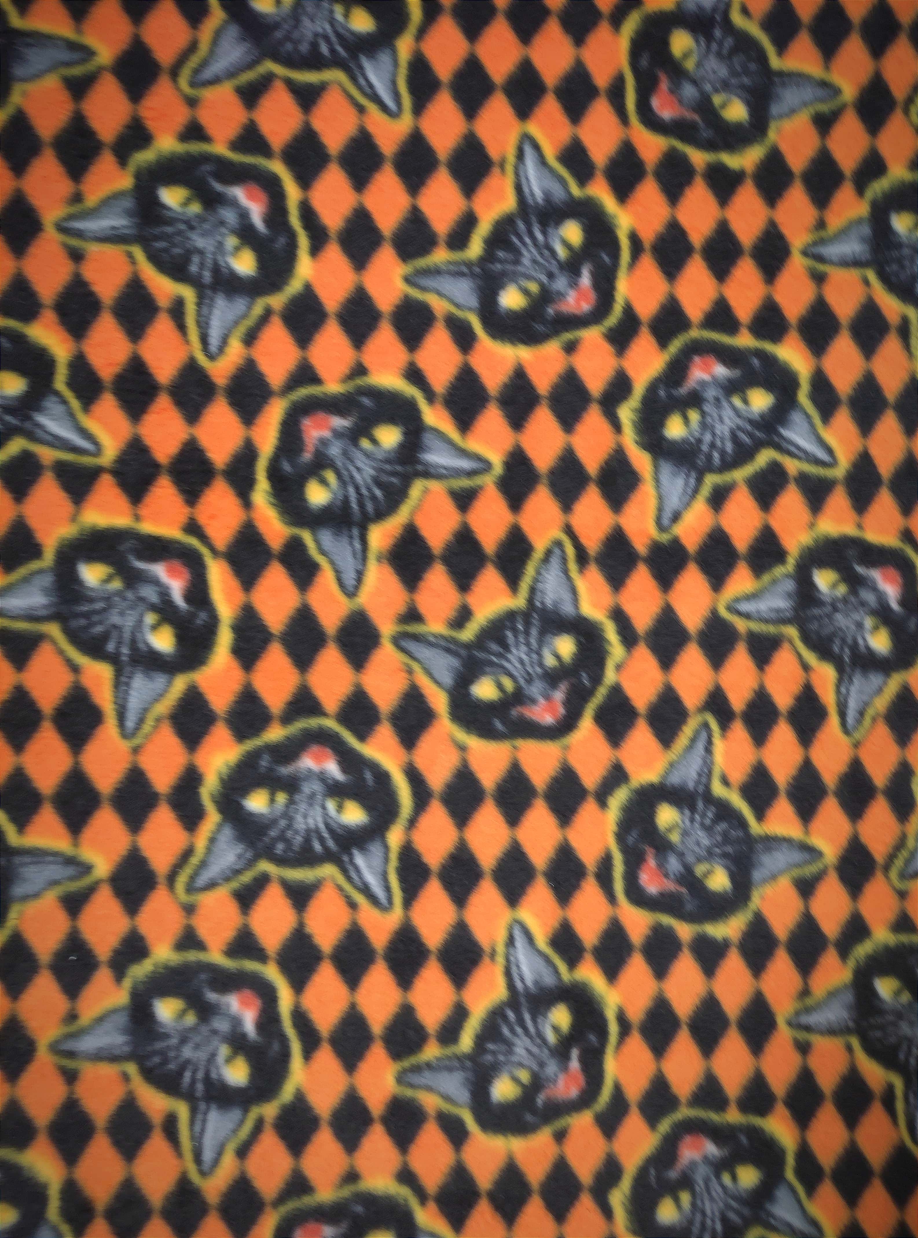 This is a soft medium weight stretchy fleece with angry black cats on black and orange harlequin patterned background.