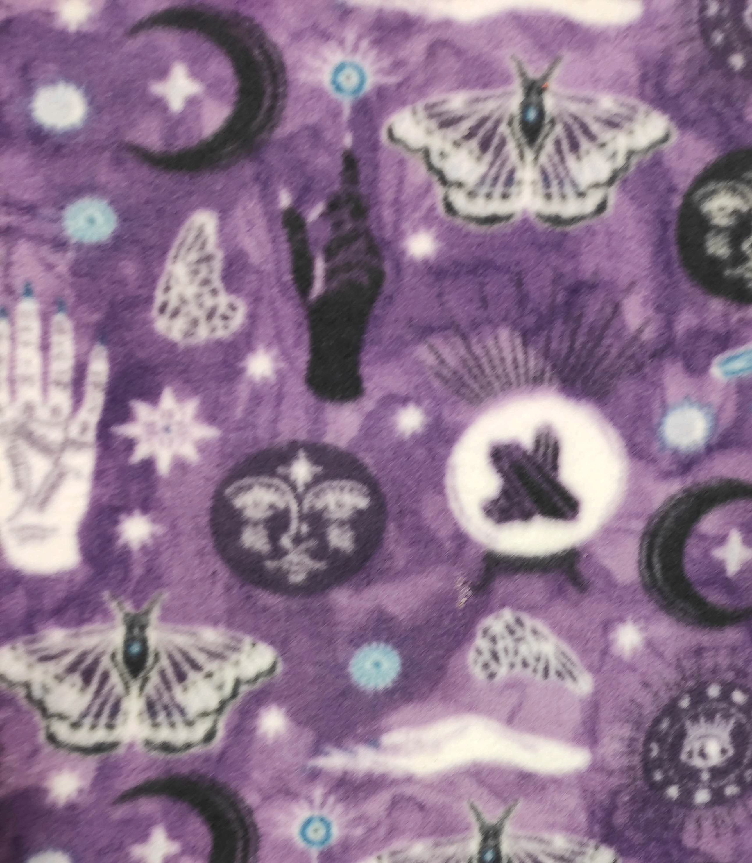 This is a soft medium weight stretchy luxe fleece with various celestial icons on purple background.