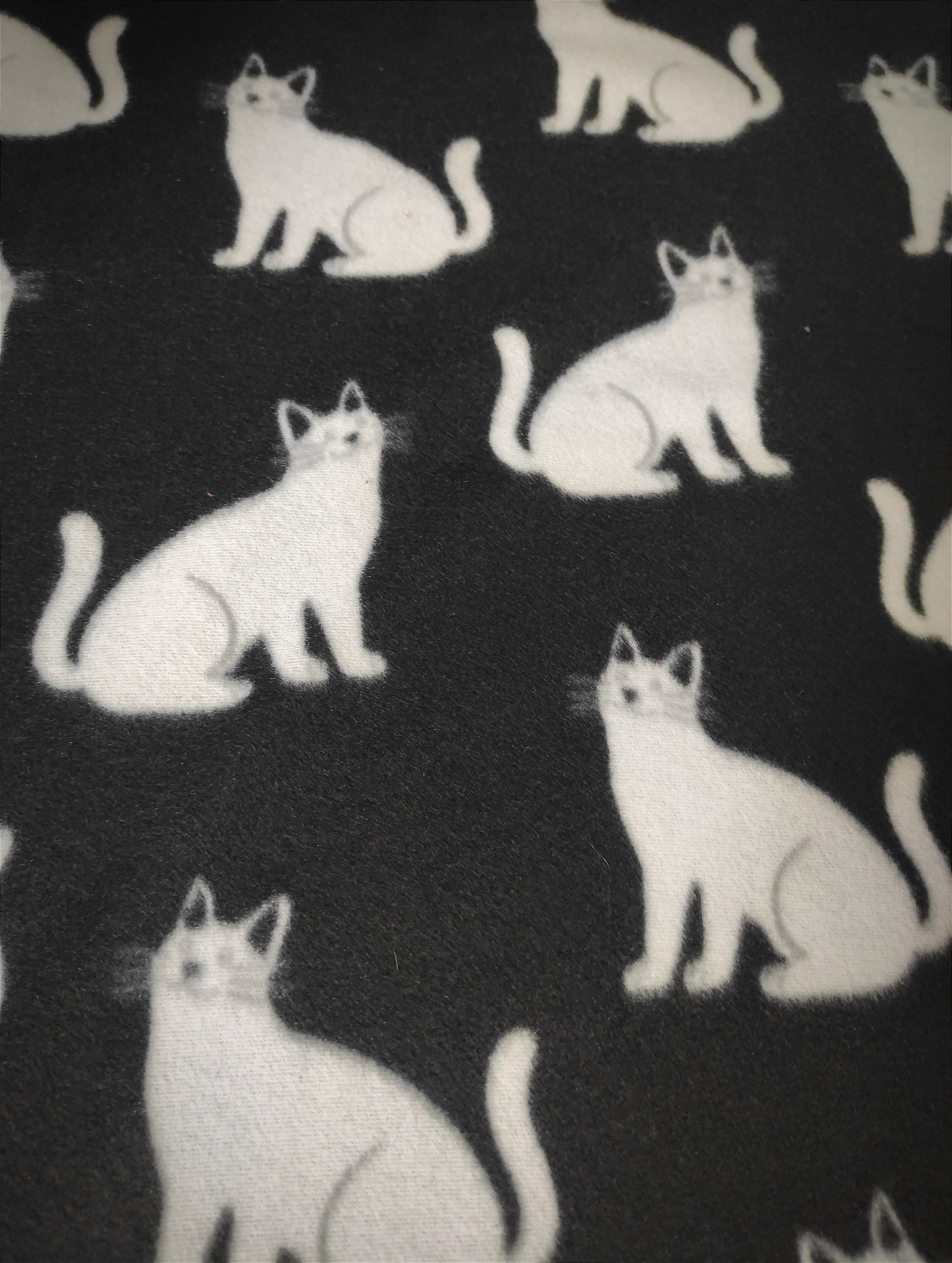 This is a soft lightweight stretchy fleece with white cats on black background.