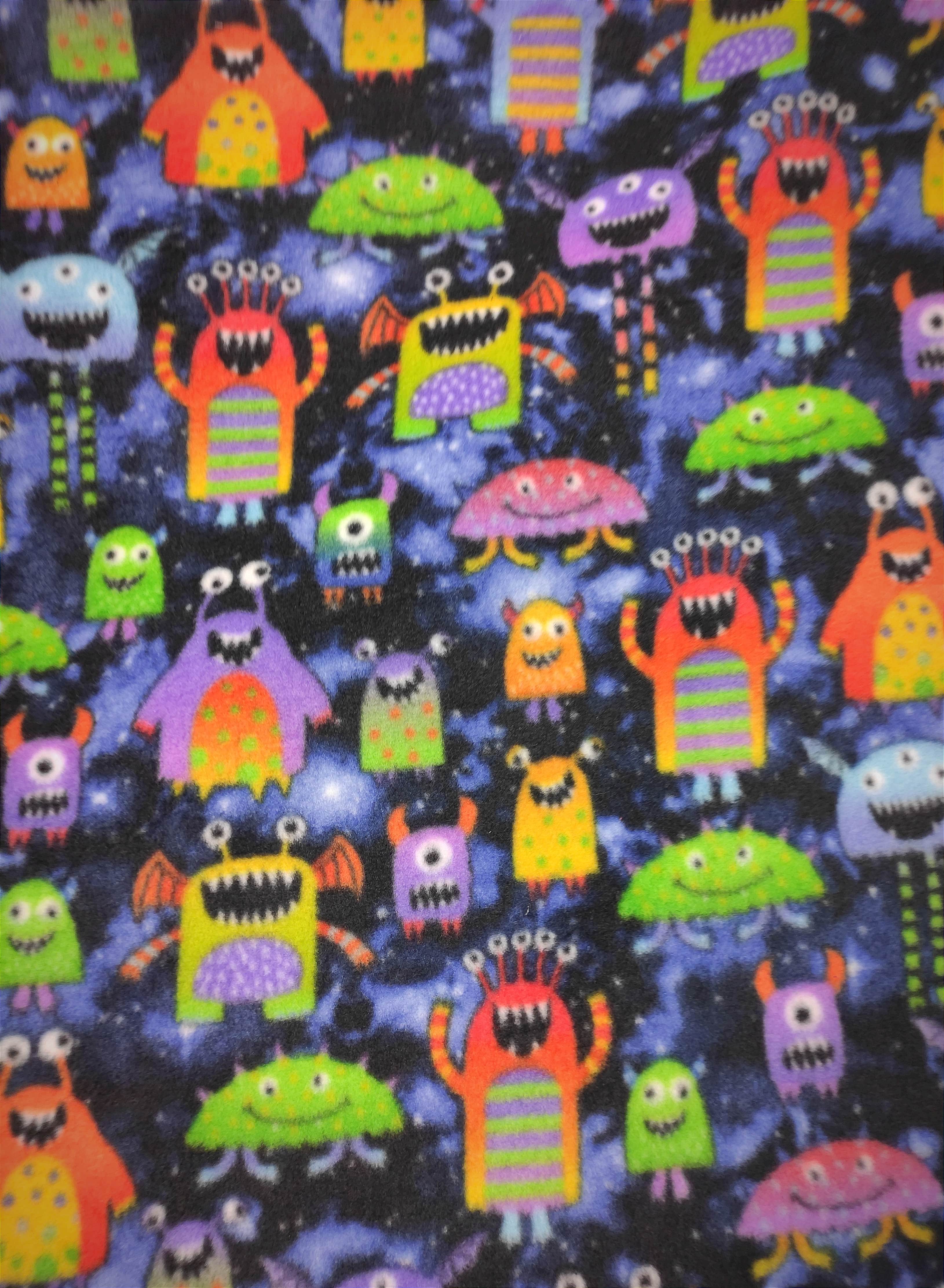 This is a soft medium weight stretchy luxe fleece with various monsters on space background. Print is large and designs will be random.