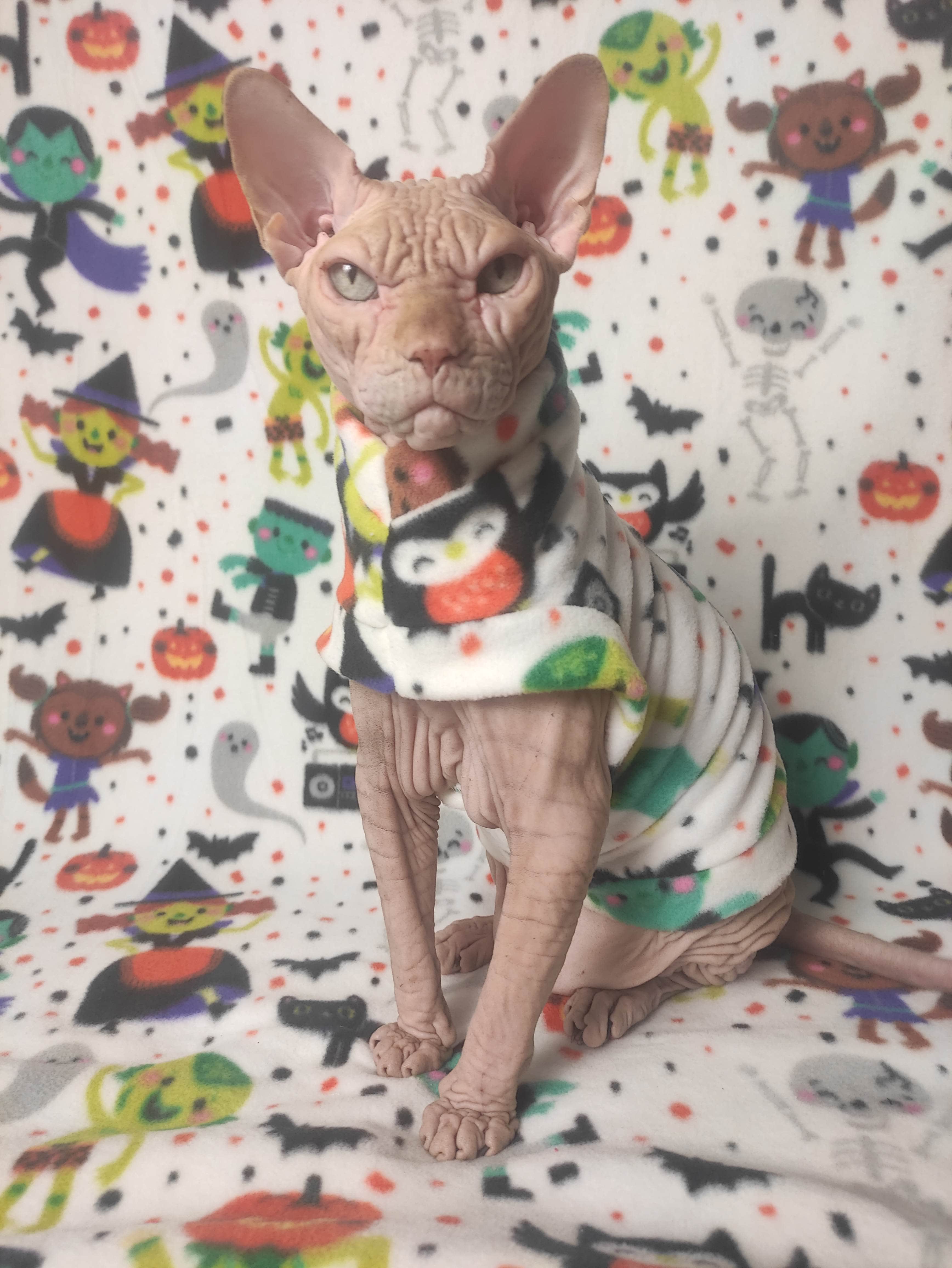 REGULAR size is for most adult hairless cats age 1 to 18. BAMBINO size fits hairless kittens age 6 months to 1 year and smaller adult cats. LIL NIPPER size fits hairless kittens age 8 weeks to 15 week olds for when they are with the breeder or for the trip home. Custom orders are welcome for larger and smaller cats - pricing is the same - $27.50