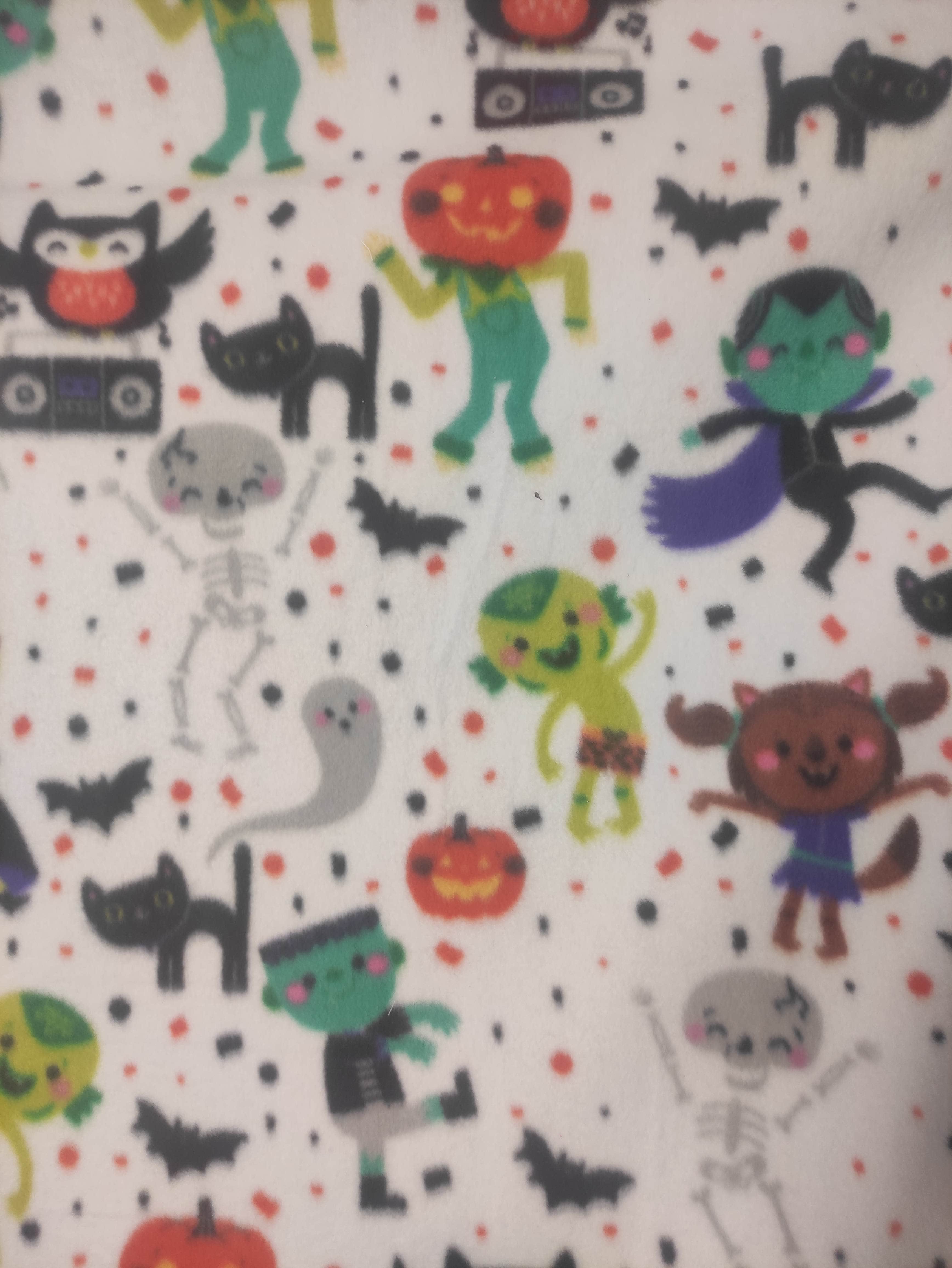 This is a soft medium weight stretchy luxe fleece with trick-or-treaters on white background. Print is large and designs will be random.