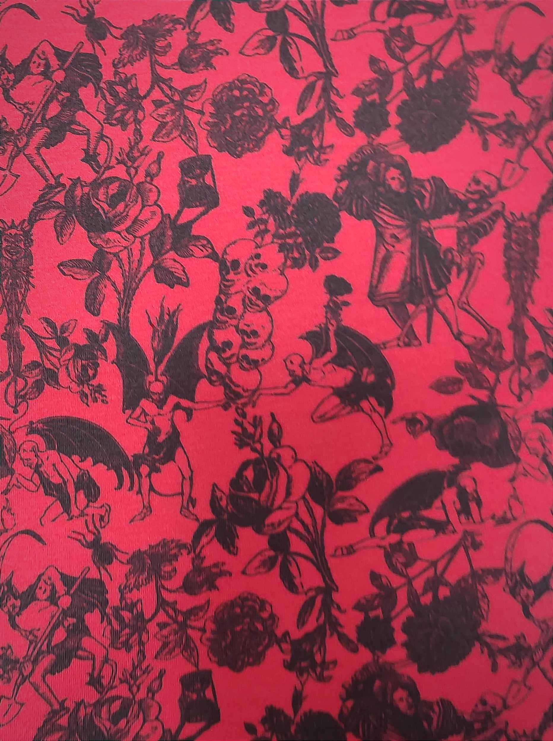 This is an amazing stretchy lightweight cotton spandex fabric vibrantly printed with flowers, skulls, and demons on red background, finished with black velvet trim 😻 Regular Size limited to only 8, Bambino Size is limited to only 7, Ankle Biter Size is limited to 2. Lil Nipper Size is limited to 2. No more will be made when they are gone.
