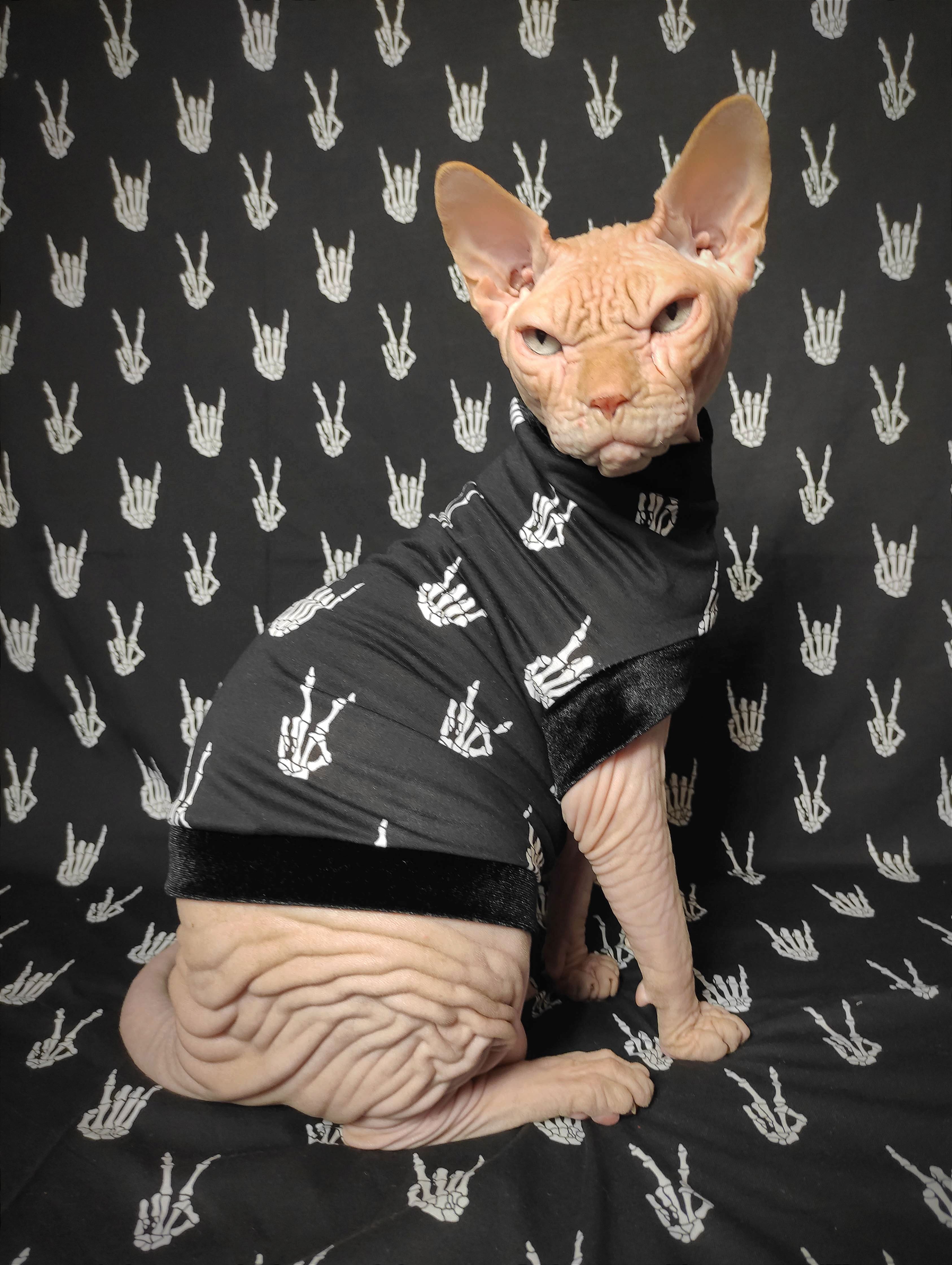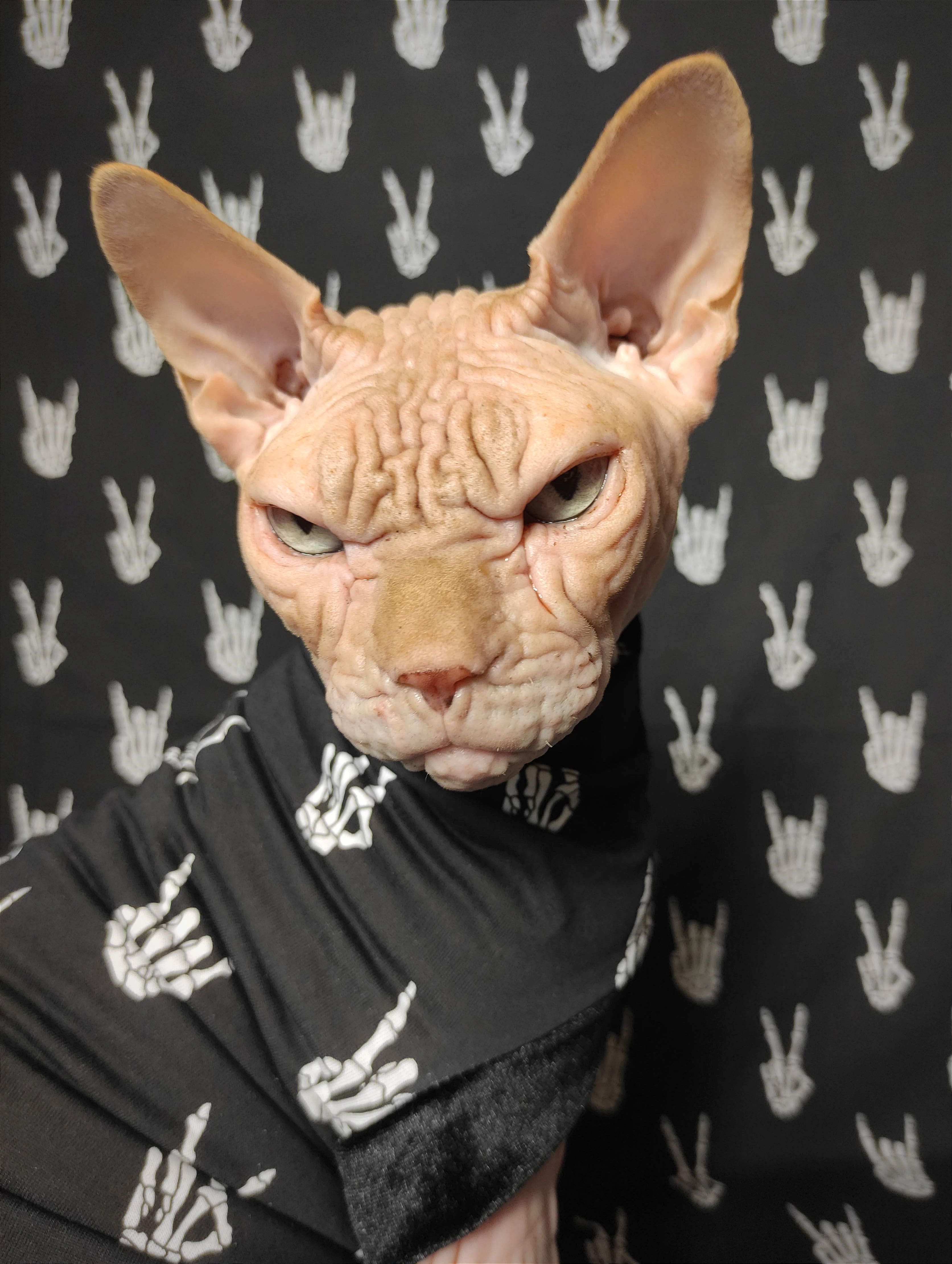 This is an amazing lightweight cotton fabric printed with skeleton peace and rock signs on black background, finished with black velvet trim 😻 Regular Size limited to only 8, Bambino Size is limited to only 7, Ankle Biter Size is limited to 2. Lil Nipper Size is limited to 2. No more will be made when they are gone.