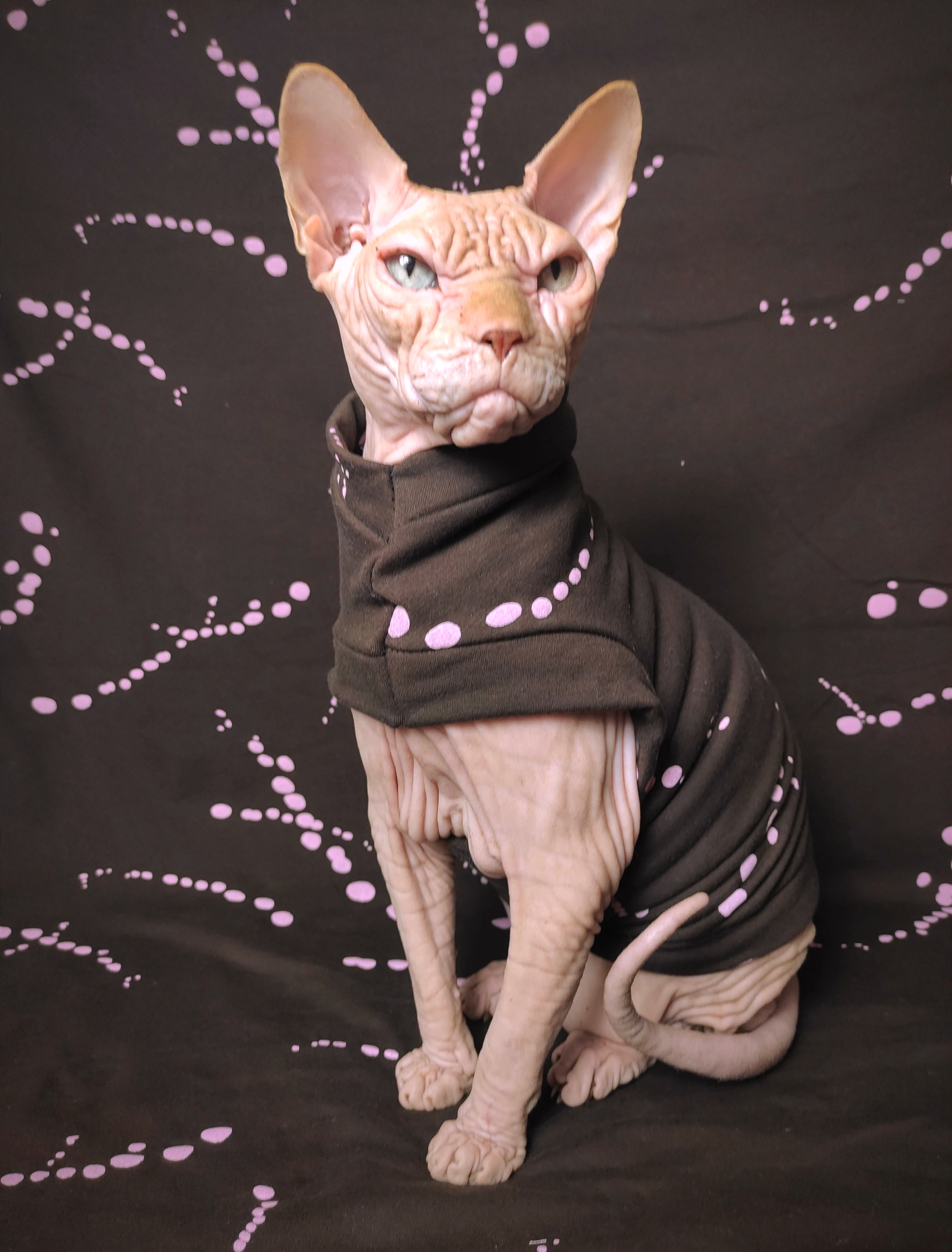 REGULAR size is for most adult hairless cats age 1 to 18. BAMBINO size fits hairless kittens age 6 months to 1 year and smaller adult cats. LIL NIPPER size fits hairless kittens age 8 weeks to 15 week olds for when they are with the breeder or for the trip home. Custom orders are welcome for larger and smaller cats - pricing is the same - $27.50