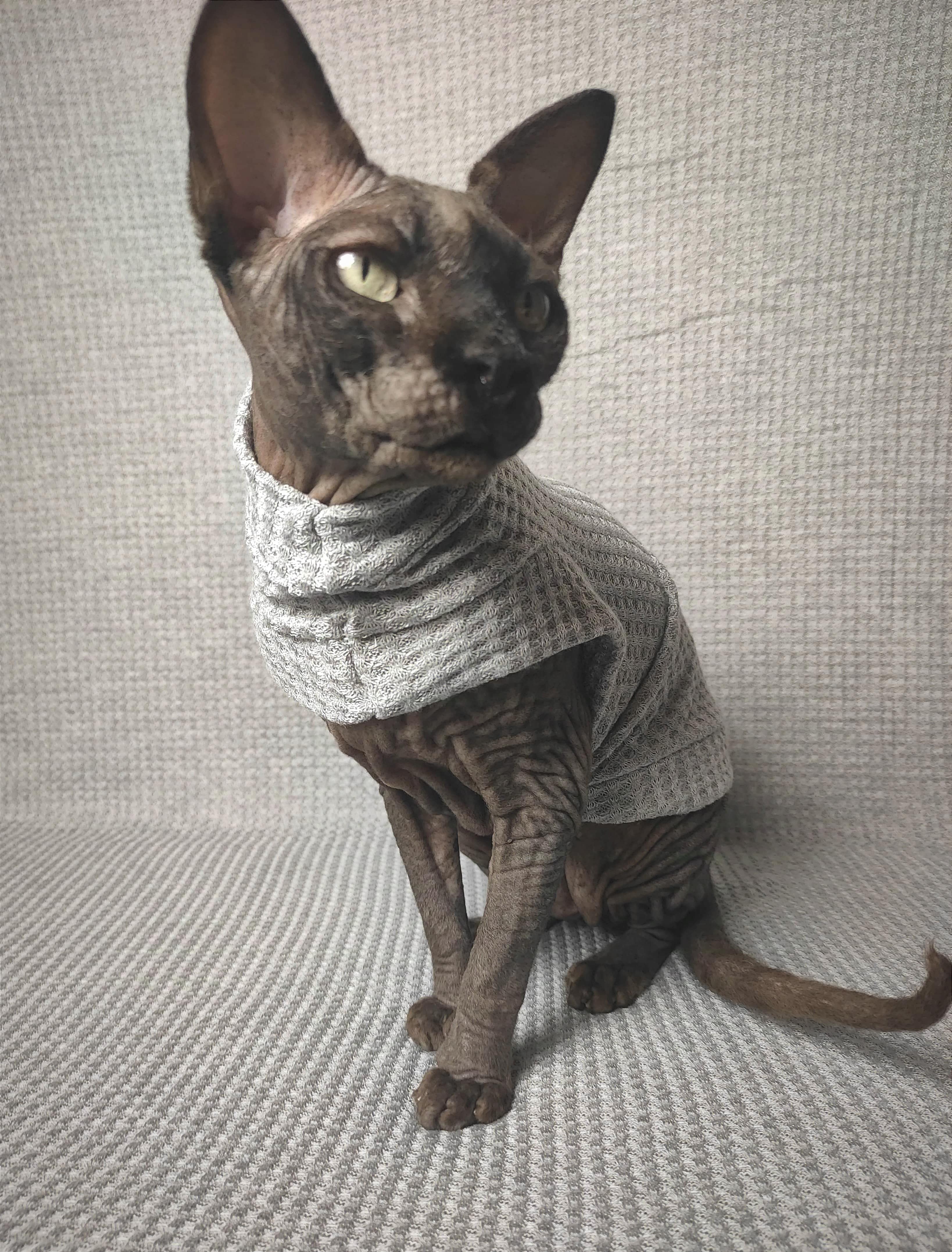 REGULAR size is for most adult hairless cats age 1 to 18. BAMBINO size fits hairless kittens age 6 months to 1 year and smaller adult cats. ANKLE BITER size fits hairless kittens 15 week to 6 month olds. LIL NIPPER size fits hairless kittens age 8 weeks to 15 week olds for when they are with the breeder or for the trip home. Custom orders are welcome for larger and smaller cats - pricing is the same - $27.50