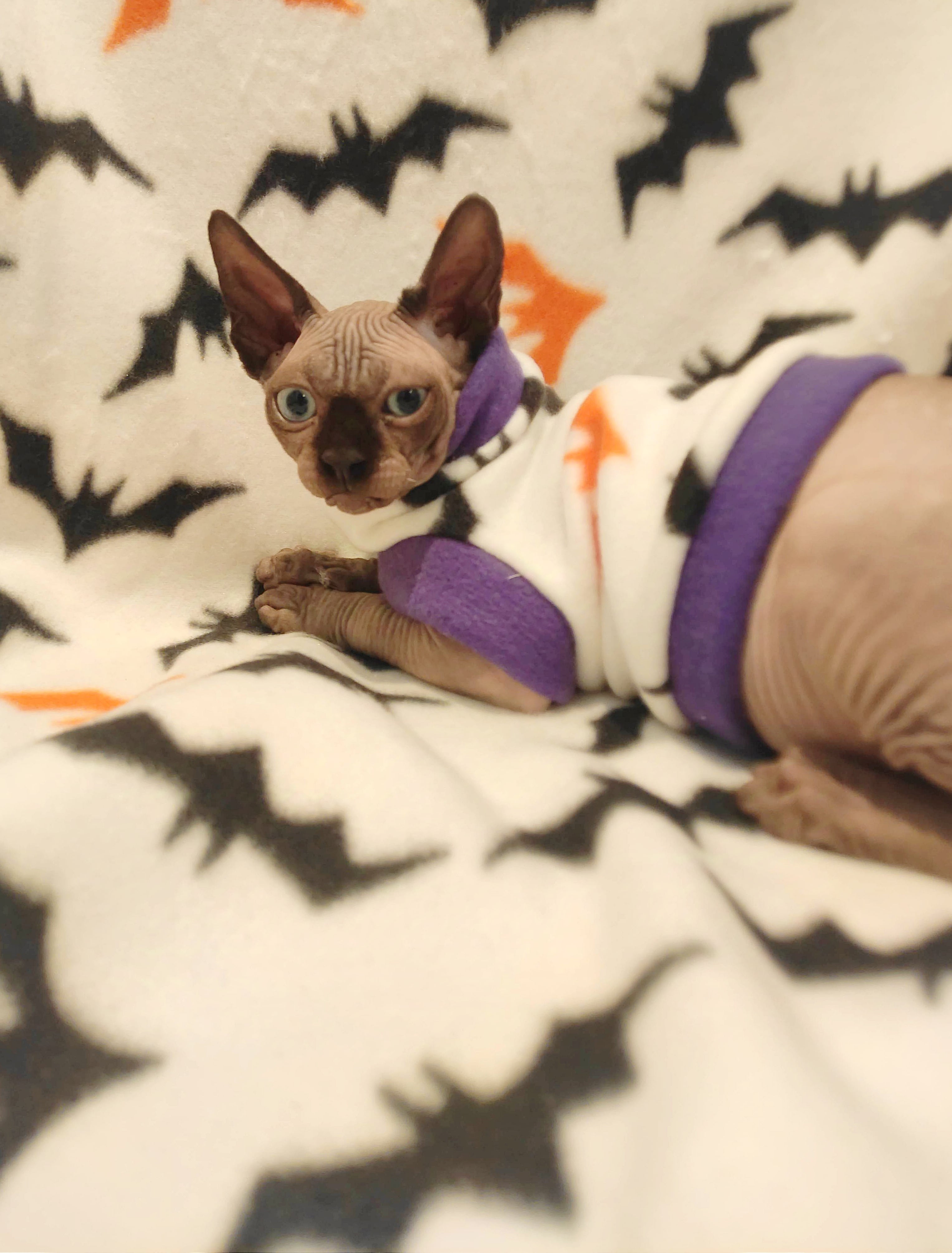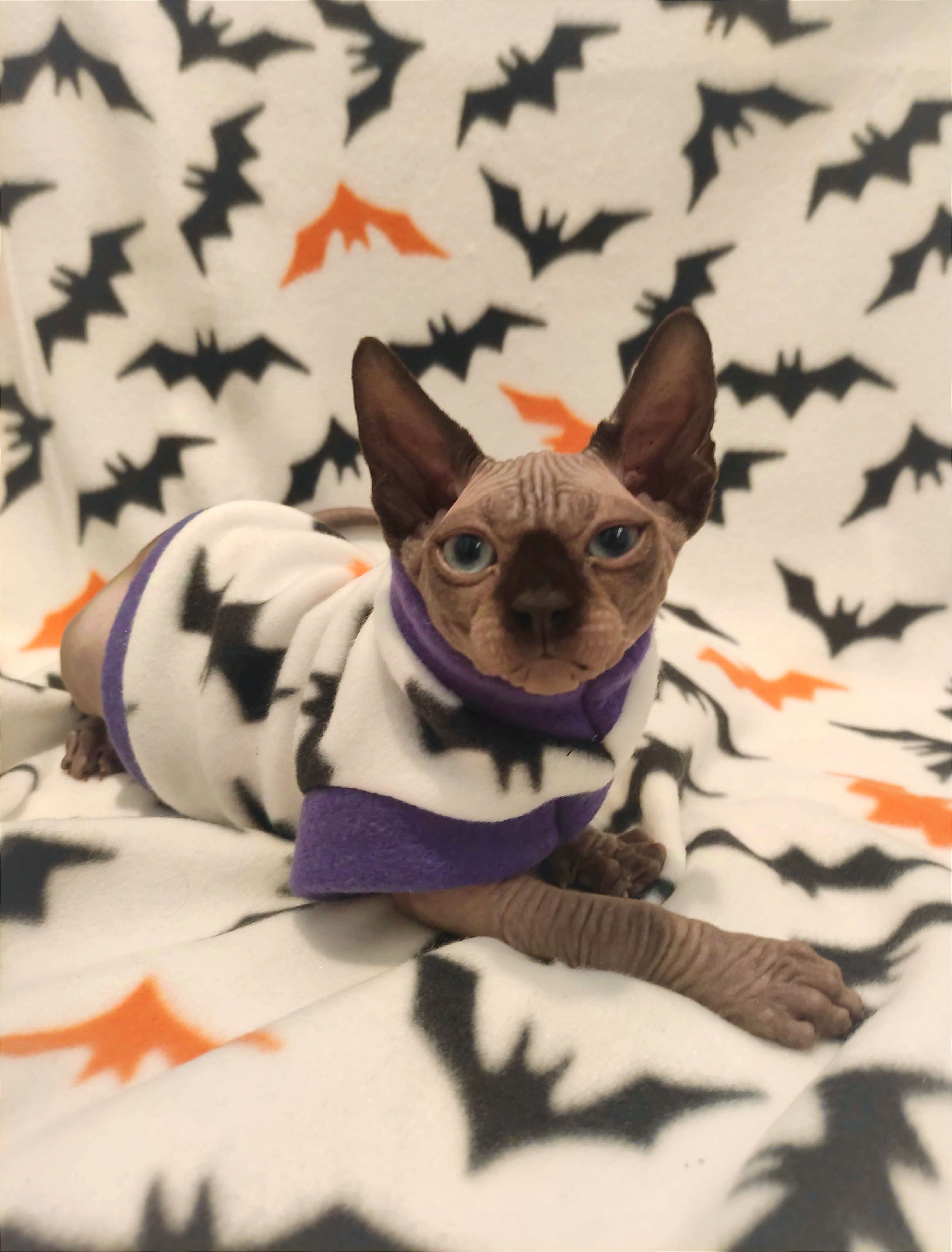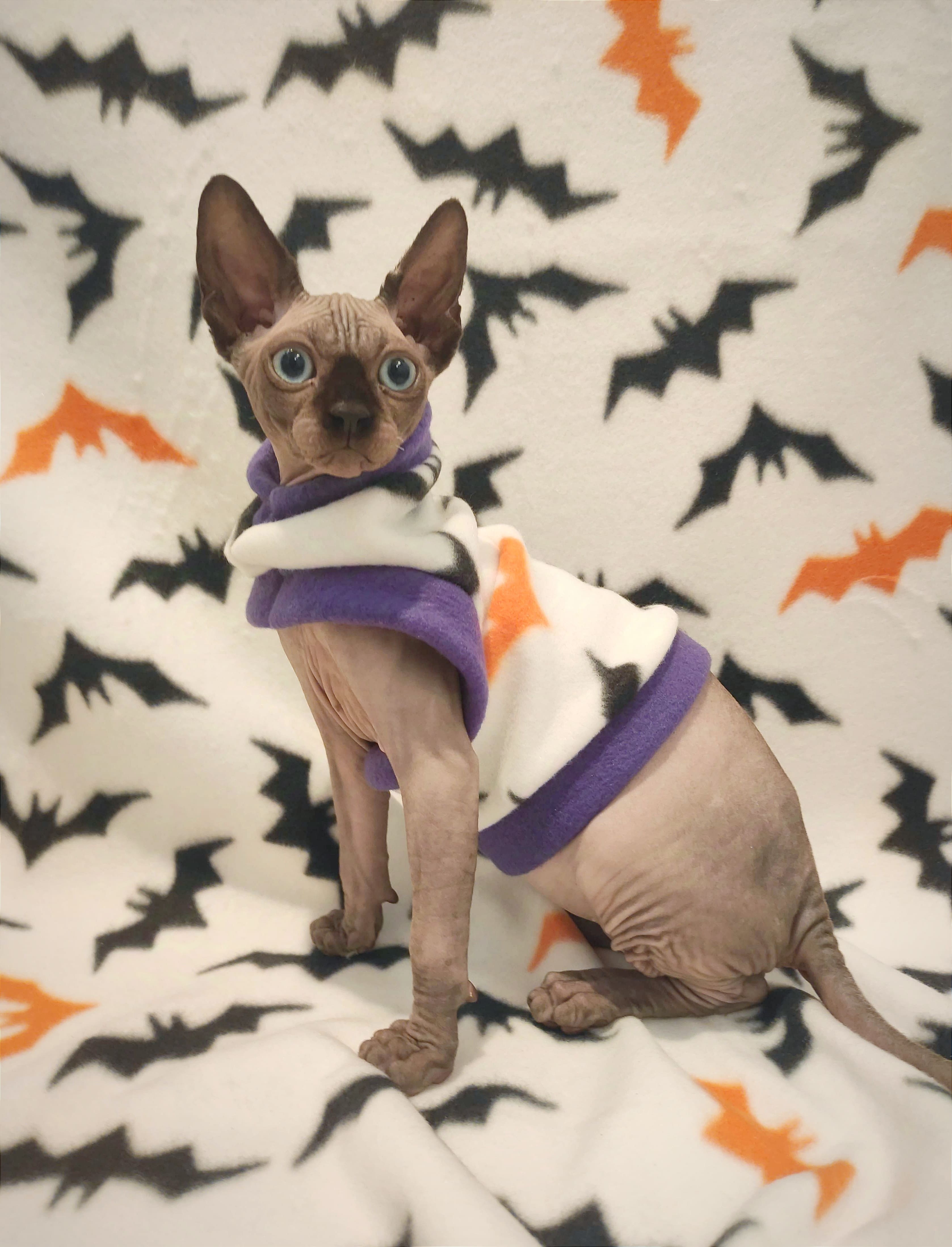 REGULAR size is for most adult hairless cats age 1 to 18. BAMBINO size fits hairless kittens age 6 months to 1 year and smaller adult cats. LIL NIPPER size fits hairless kittens age 8 weeks to 15 week olds for when they are with the breeder or for the trip home. Custom orders are welcome for larger and smaller cats - pricing is the same - $27.50