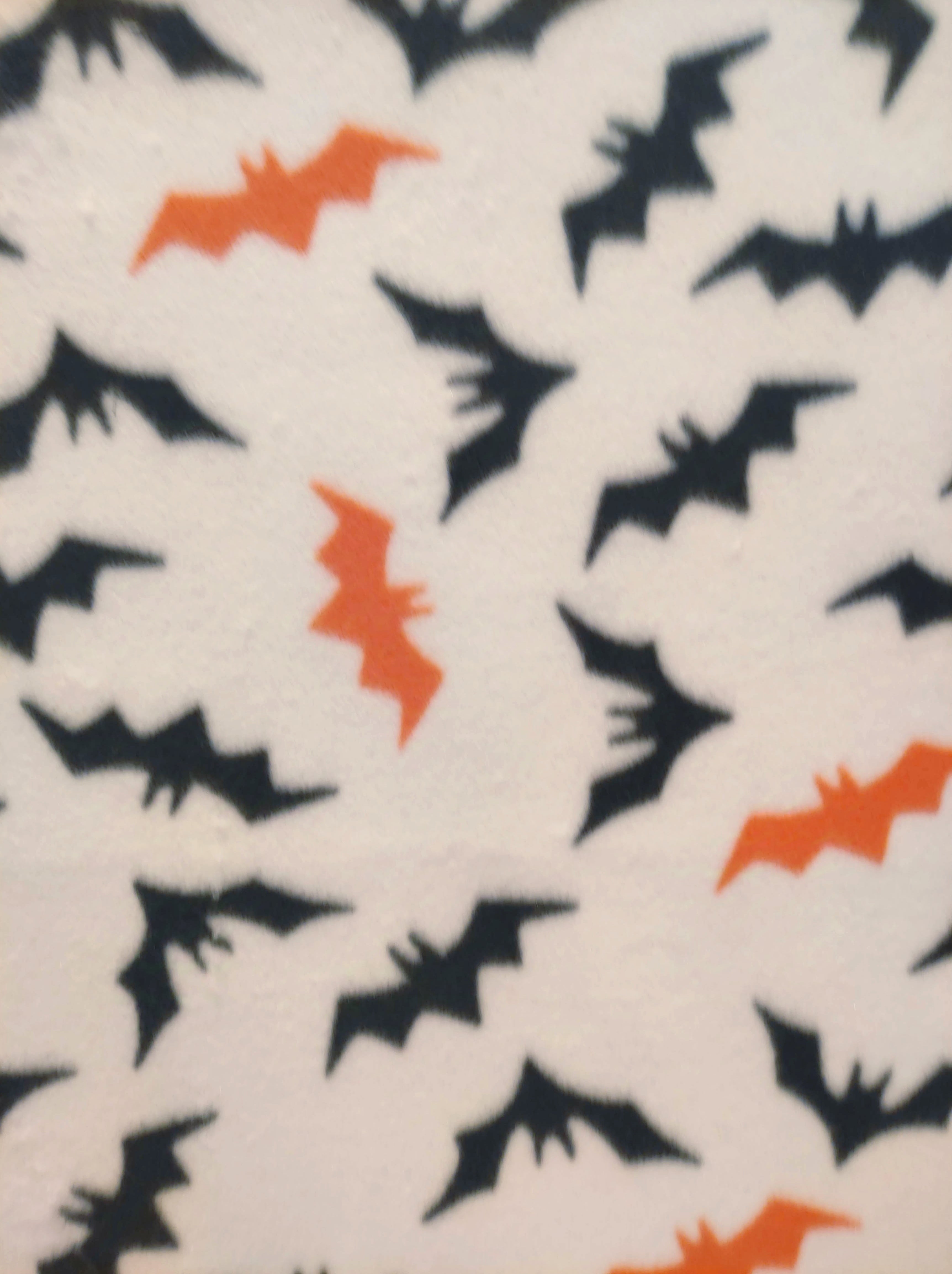 This is a soft medium weight stretchy fleece with black and orange bats on white fleece, trimmed with purple fleeceš»