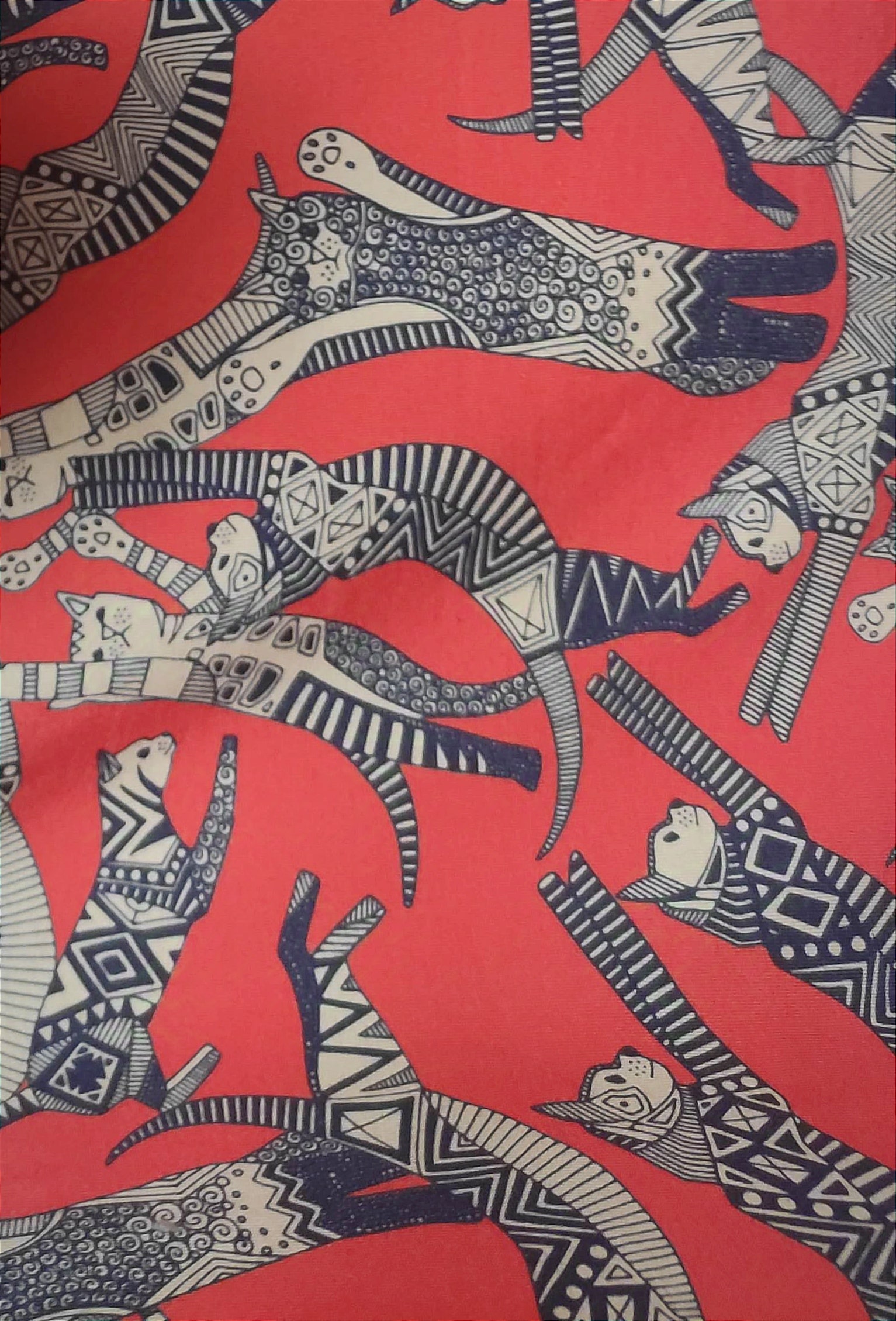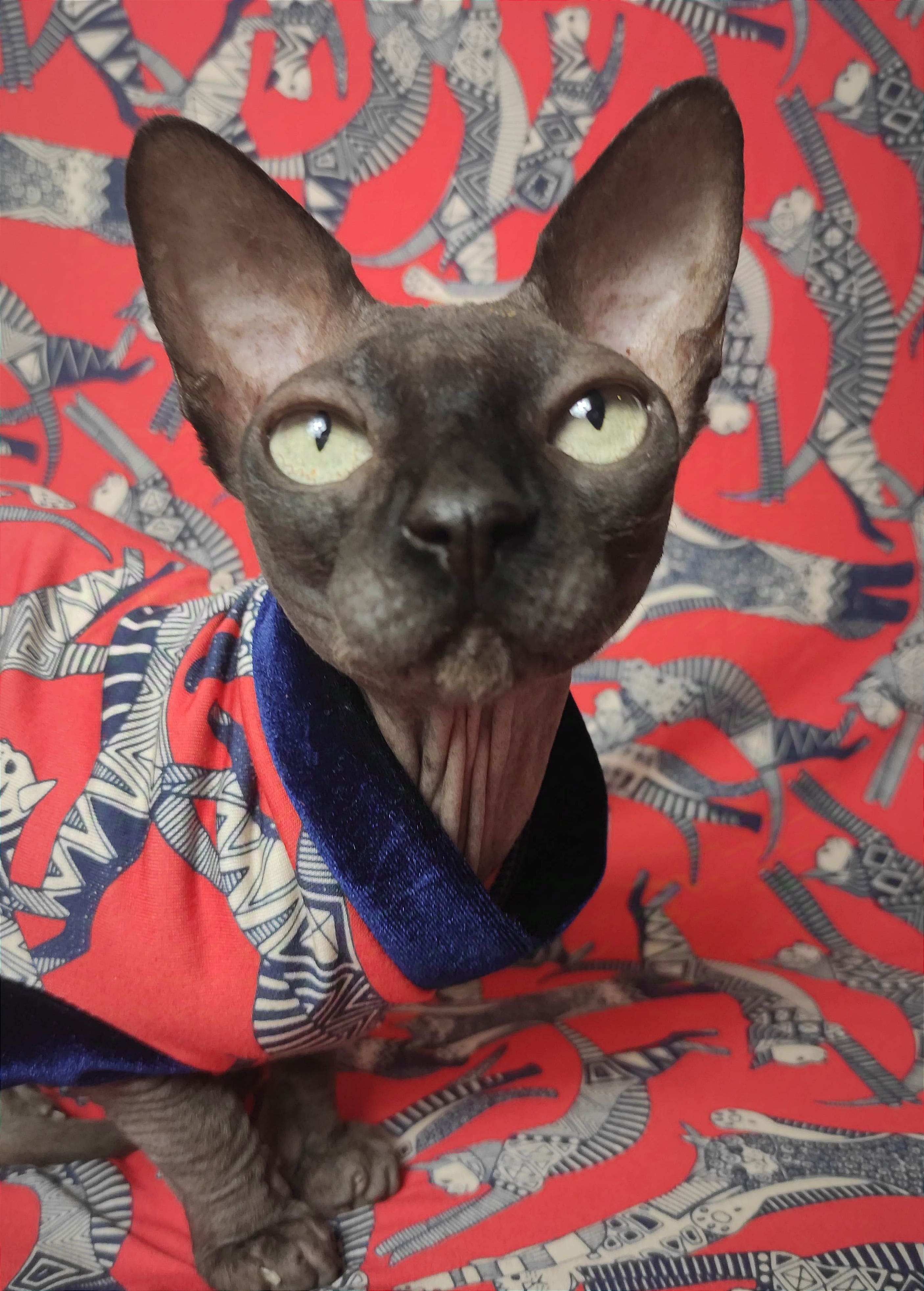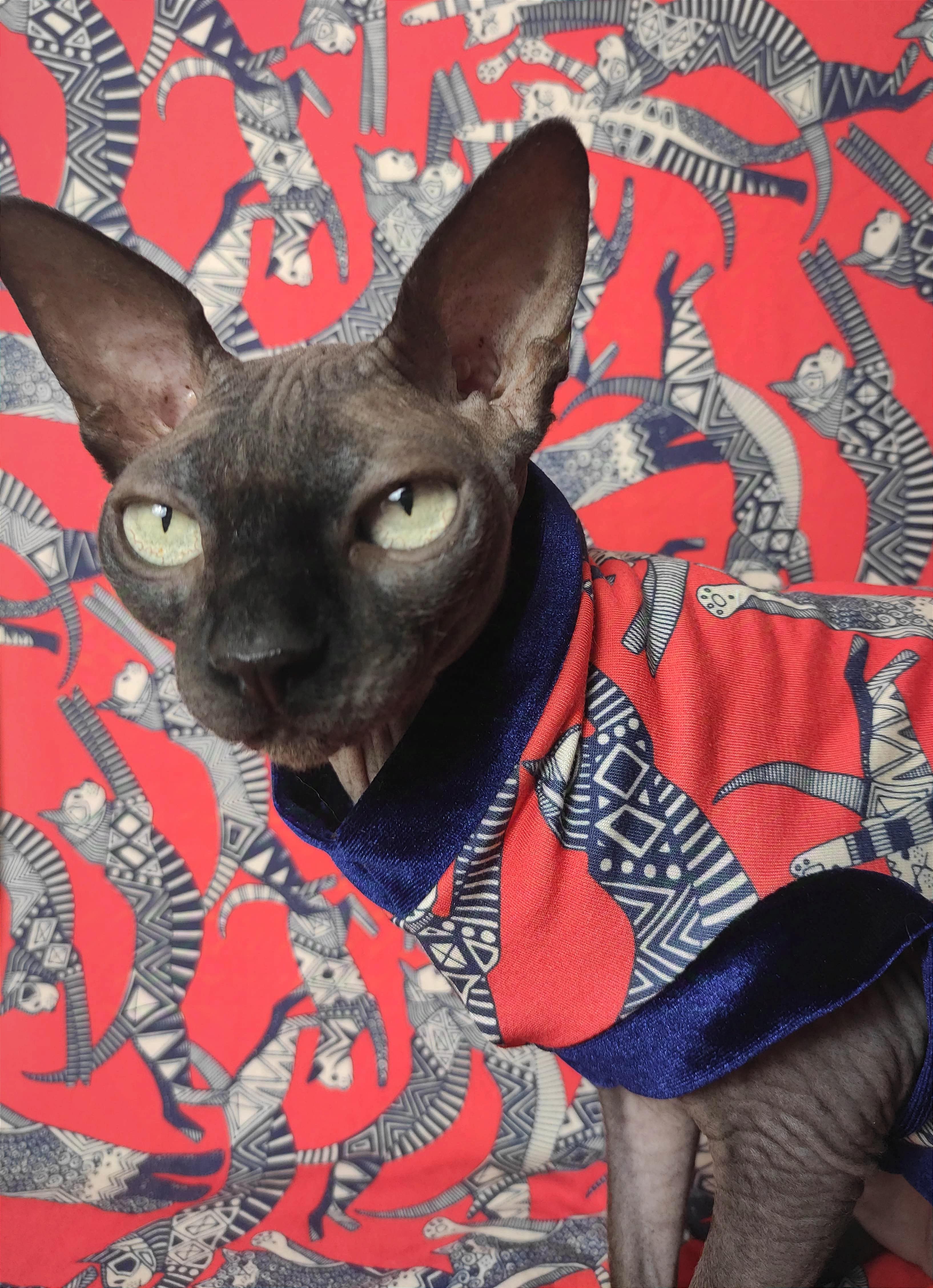 This is an amazing lightweight stretchy cotton fabric printed with abstract cat pattern on red background finished with blue velvet trim 😻 Regular Size limited to only 8, Bambino Size is limited to only 7, Ankle Biter Size is limited to 2. Lil Nipper Size is limited to 2. No more will be made when they are gone.
