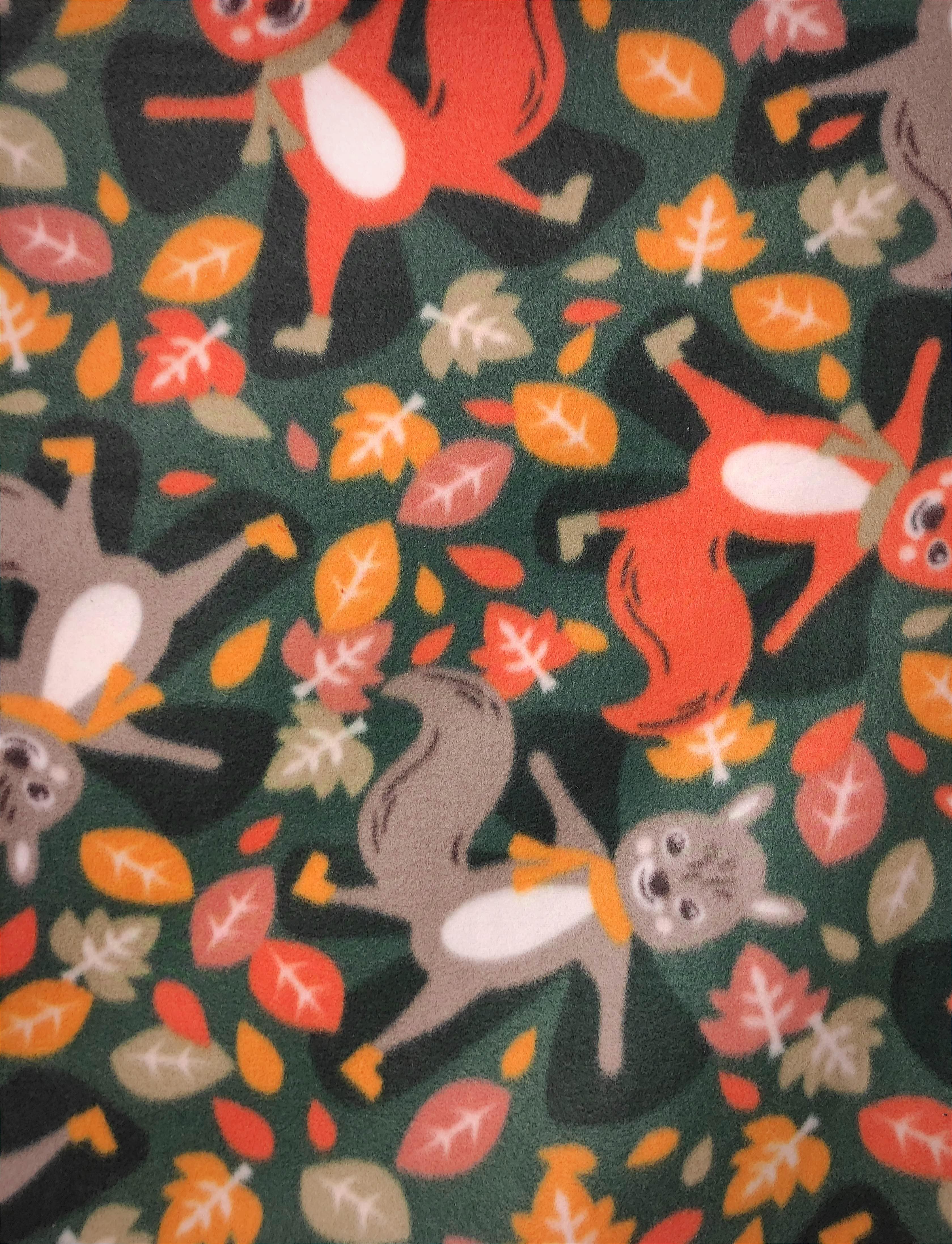 This is a soft medium weight stretchy fleece with squirrels and leaves motif on green background 😻