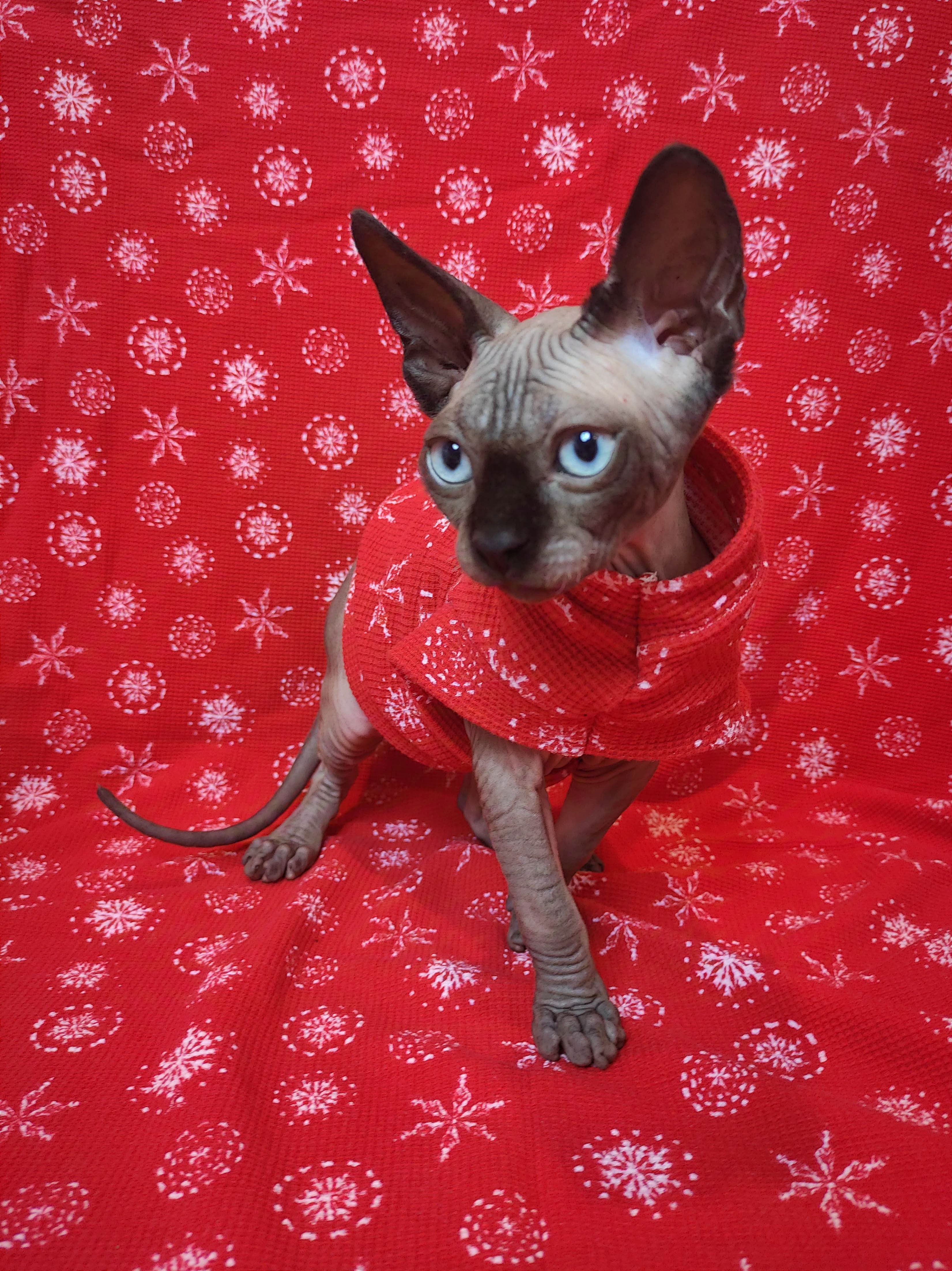 REGULAR size is for most adult hairless cats age 1 to 18. BAMBINO size fits hairless kittens age 6 months to 1 year and smaller adult cats. ANKLE BITER size fits hairless kittens 15 week to 6 month olds. LIL NIPPER size fits hairless kittens age 8 weeks to 15 week olds for when they are with the breeder or for the trip home. Custom orders are welcome for larger and smaller cats - pricing is the same - $27.50
