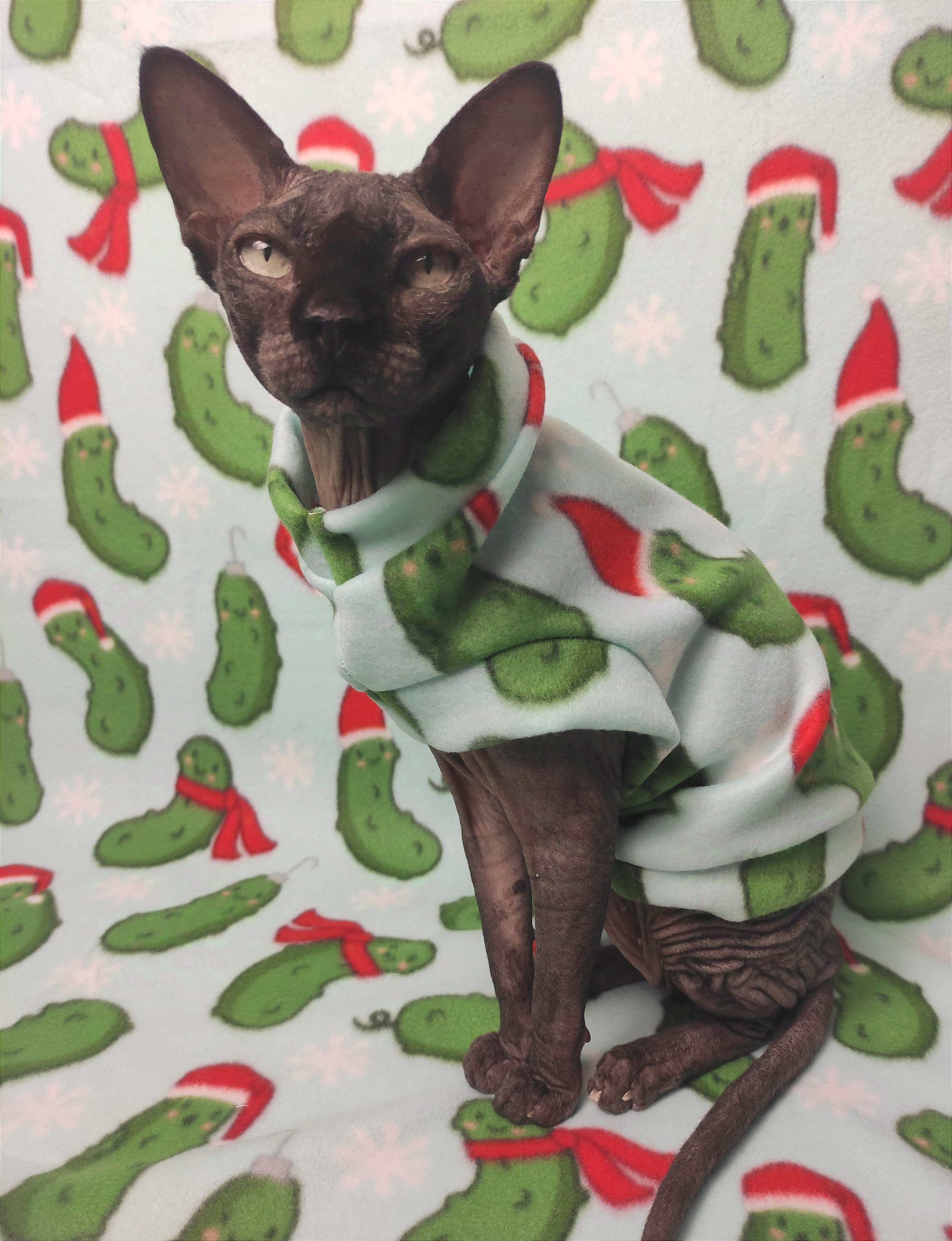 REGULAR size is for most adult hairless cats age 1 to 18. BAMBINO size fits hairless kittens age 6 months to 1 year and smaller adult cats. LIL NIPPER size fits hairless kittens age 8 weeks to 15 week olds for when they are with the breeder or for the trip home. Custom orders are welcome for larger and smaller cats - pricing is the same - $27.50