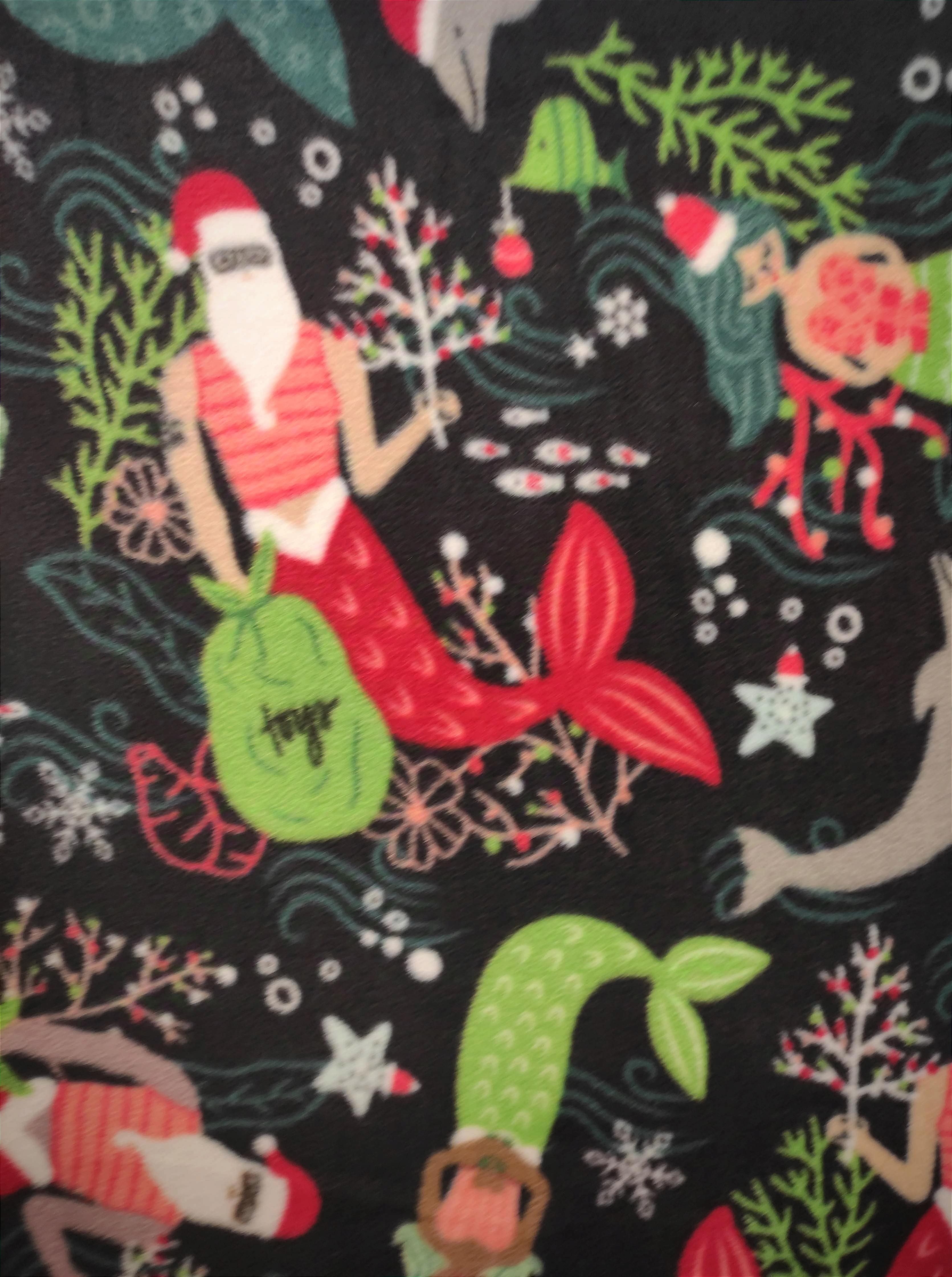 This is a soft medium weight stretchy luxe fleece with mermaids and dolphins and starfish and Santa Mermen on black background. Print is large and designs will be random.
