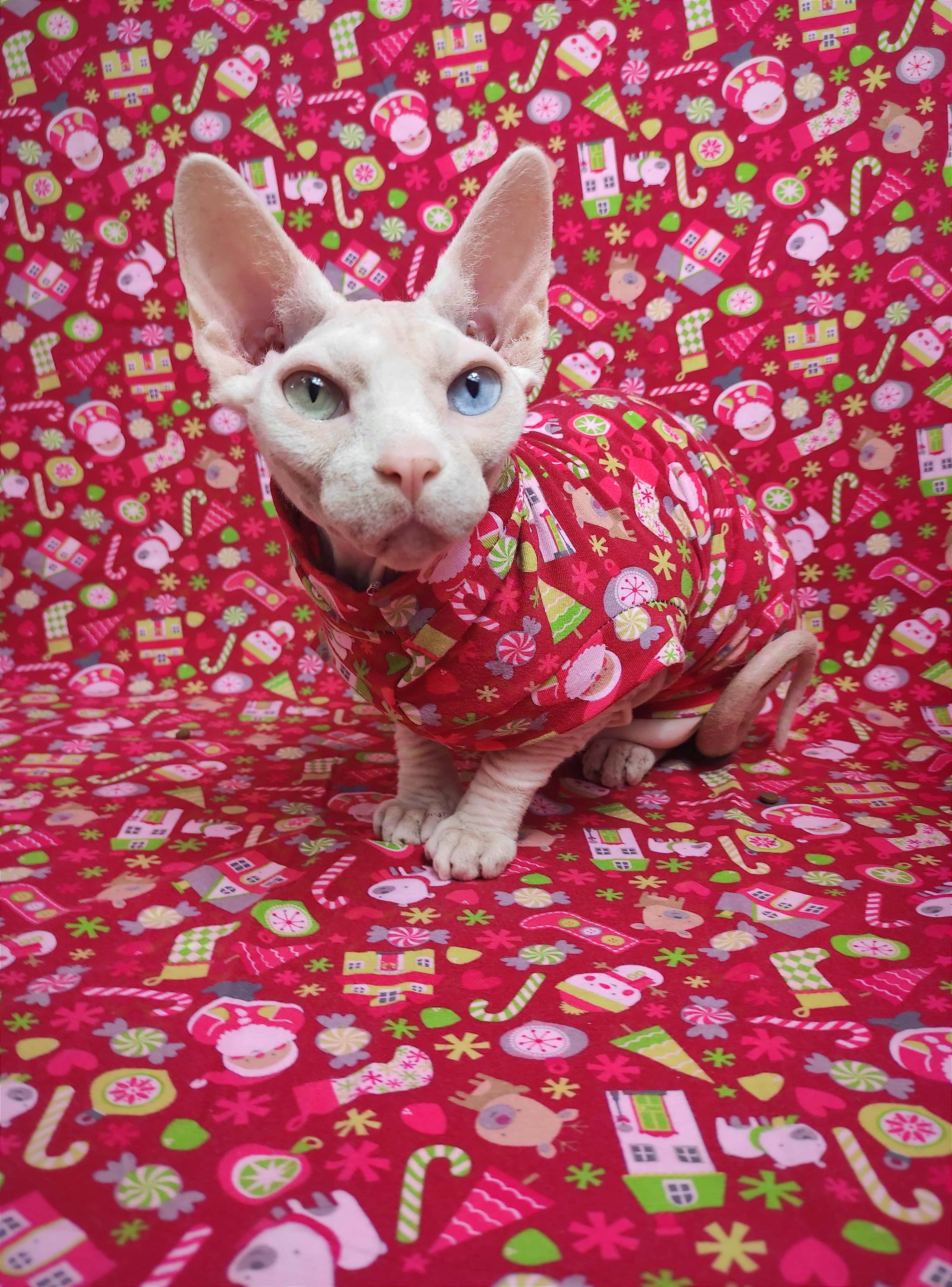 REGULAR size is for most adult hairless cats age 1 to 18. BAMBINO size fits hairless kittens age 6 months to 1 year and smaller adult cats. ANKLE BITER size fits kittens 15 weeks to 6 month olds. LIL NIPPER size fits hairless kittens age 8 weeks to 15 week olds for when they are with the breeder or for the trip home. Custom orders are welcome for larger and smaller cats - pricing is the same - $27.50