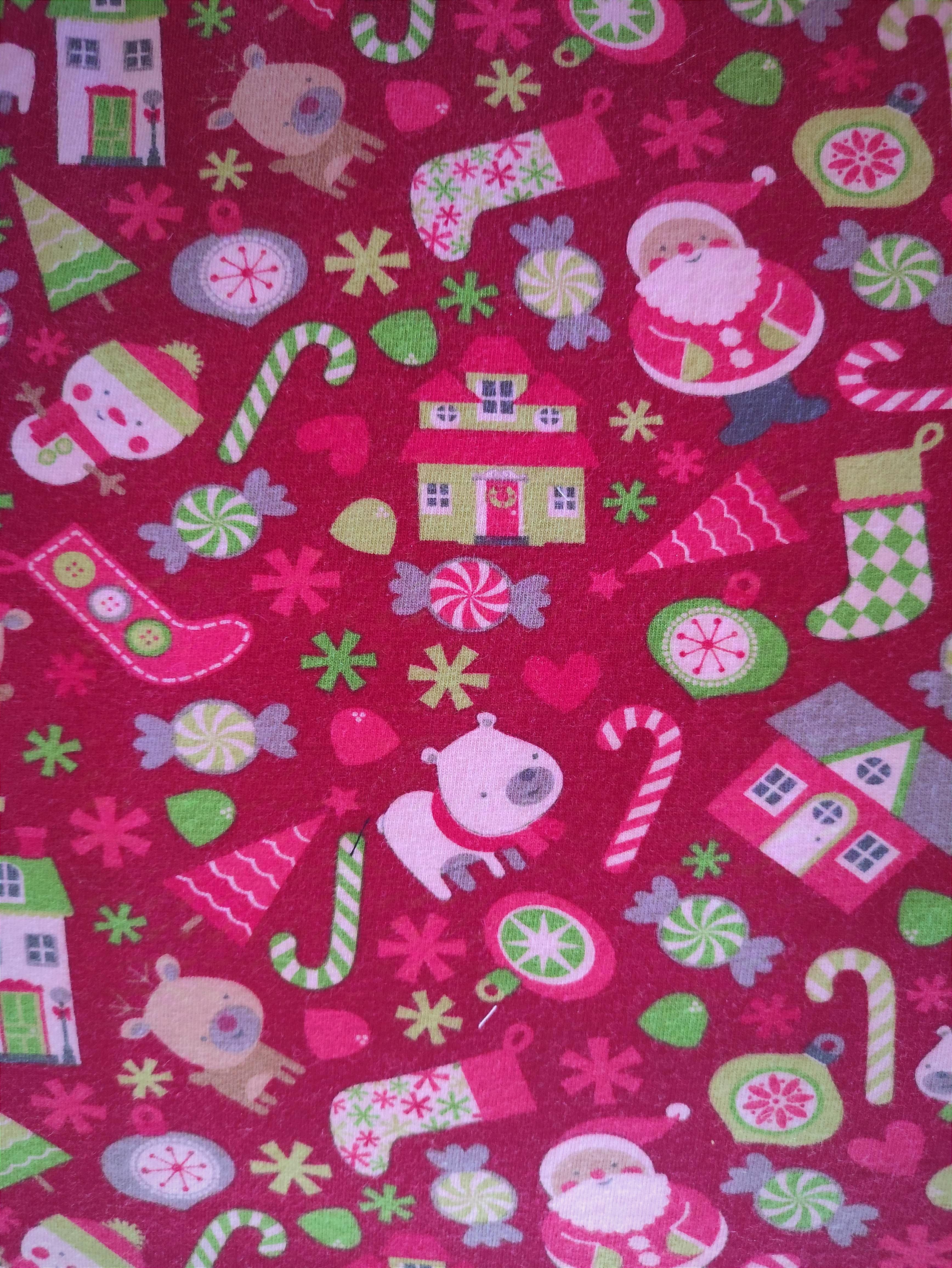 This sleepwear is a beautiful stretchy cotton blend fabric with printed Santa, animals, Xmas trees, ornaments and decorated houses with red background on light pink fabric. Made with special seams that minimize the seem profile. Swag Sleepwear has a slimmer fit, larger armholes, and smaller trim to provide extra snuggly comfort for sleeping or catnapping! Regular Size limited to only 7. Bambino Size is limited to only 8, Ankle Biter Size is limited to 2, Lil Nipper Size is limited to 2. No more will be made when they are gone.