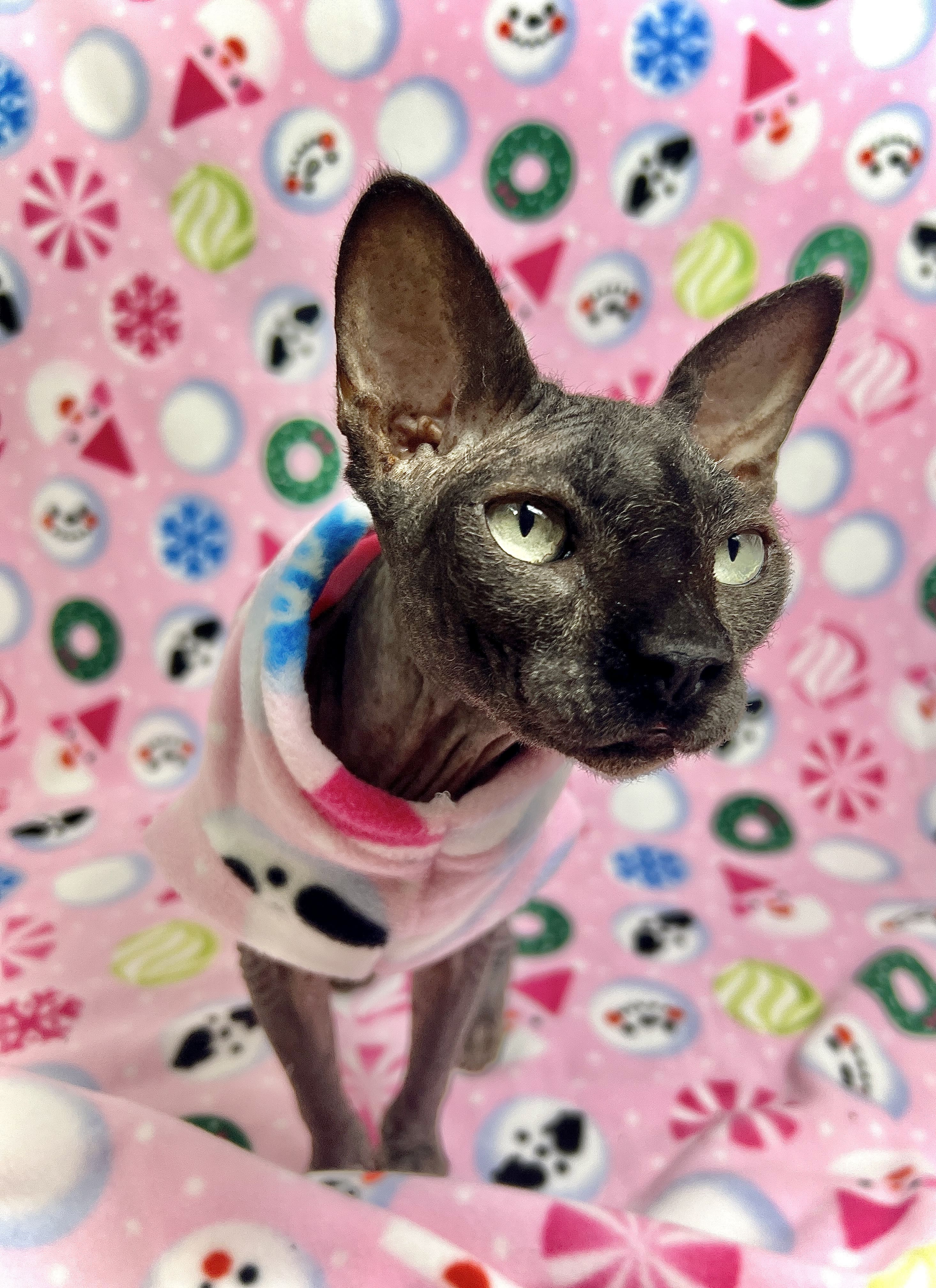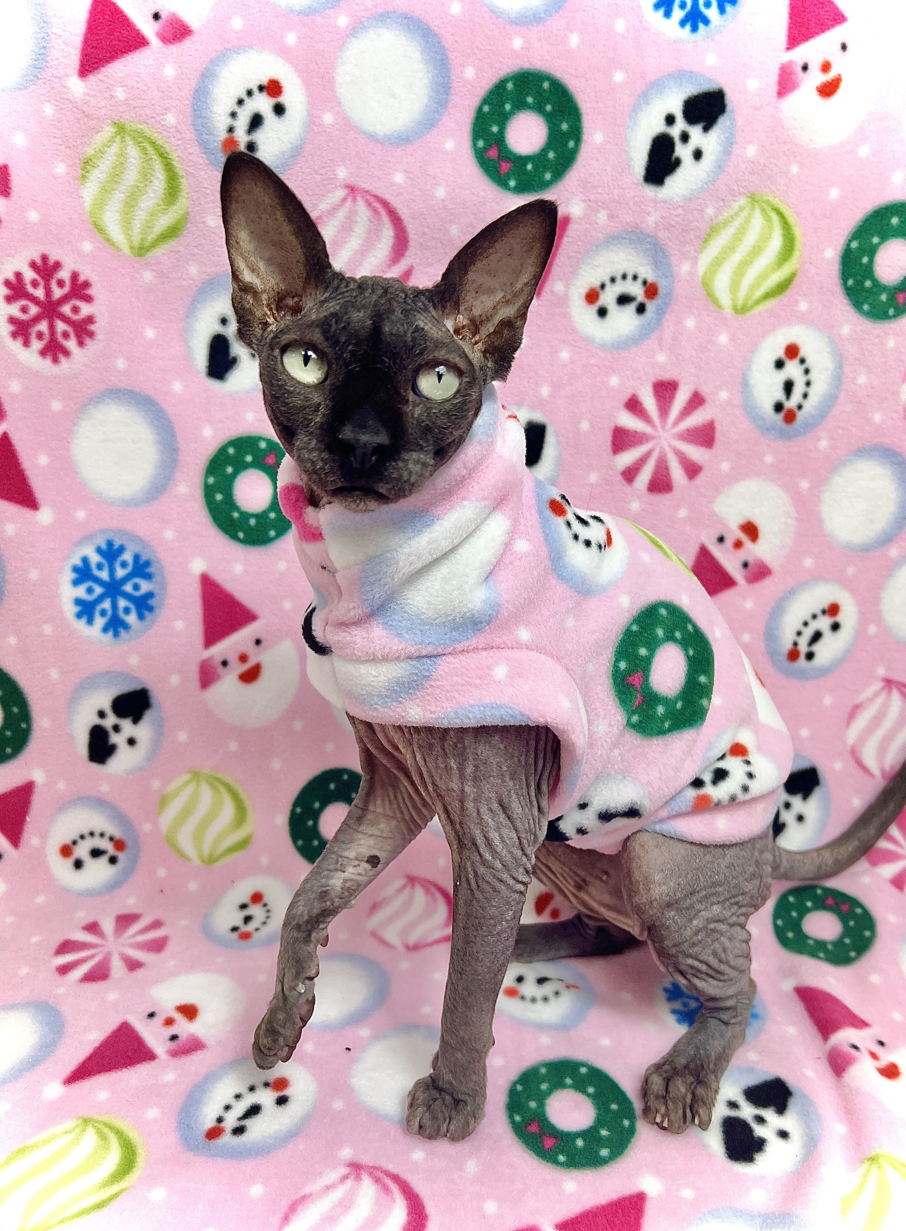 REGULAR size is for most adult hairless cats age 1 to 18. BAMBINO size fits hairless kittens age 6 months to 1 year and smaller adult cats. LIL NIPPER size fits hairless kittens age 8 weeks to 15 week olds for when they are with the breeder or for the trip home. Custom orders are welcome for larger and smaller cats - pricing is the same - $27.50