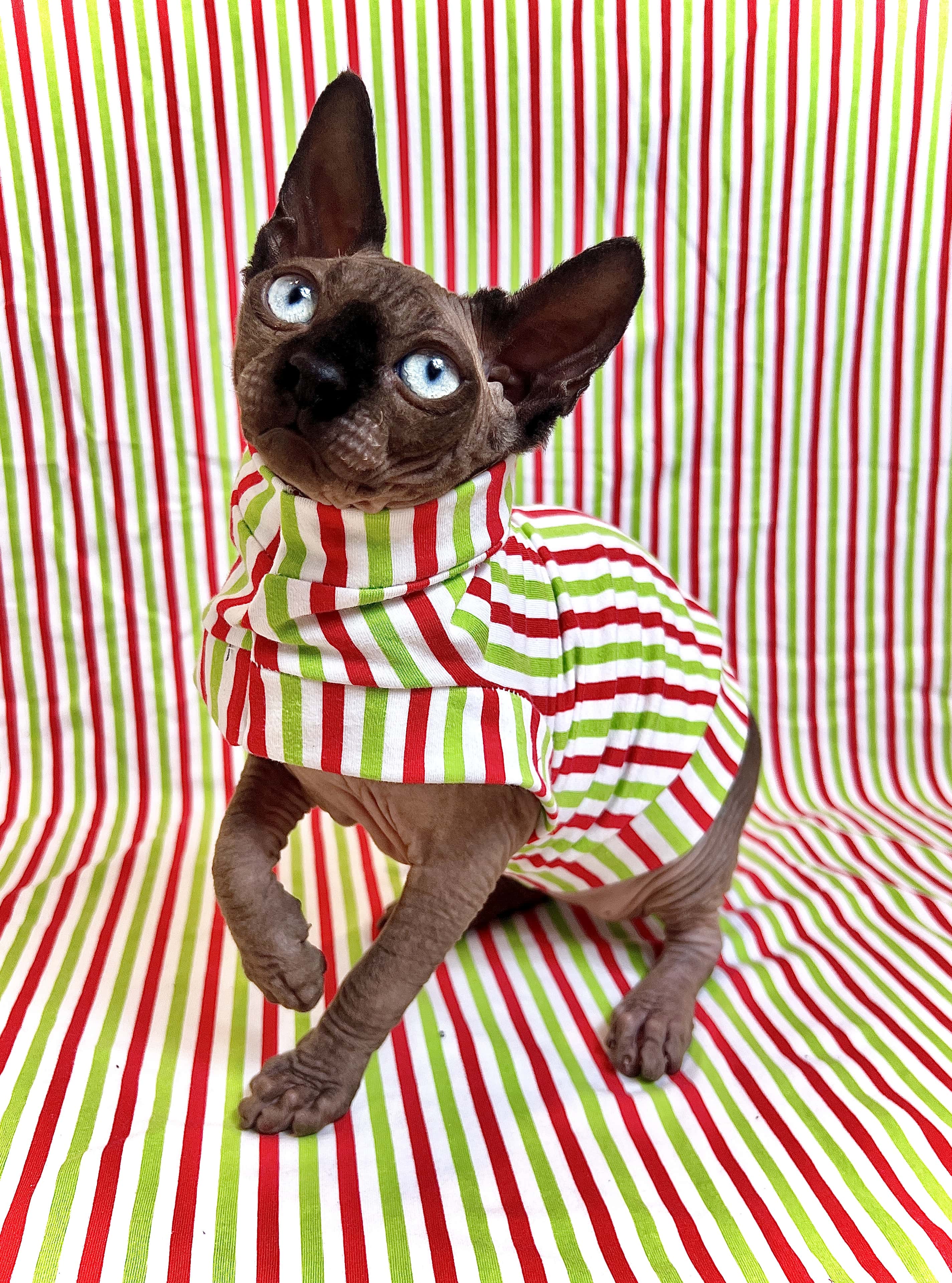 REGULAR size is for most adult hairless cats age 1 to 18. BAMBINO size fits hairless kittens age 6 months to 1 year and smaller adult cats. ANKLE BITER size fits kittens 15 weeks to 6 month olds. LIL NIPPER size fits hairless kittens age 8 weeks to 15 week olds for when they are with the breeder or for the trip home. Custom orders are welcome for larger and smaller cats - pricing is the same - $27.50