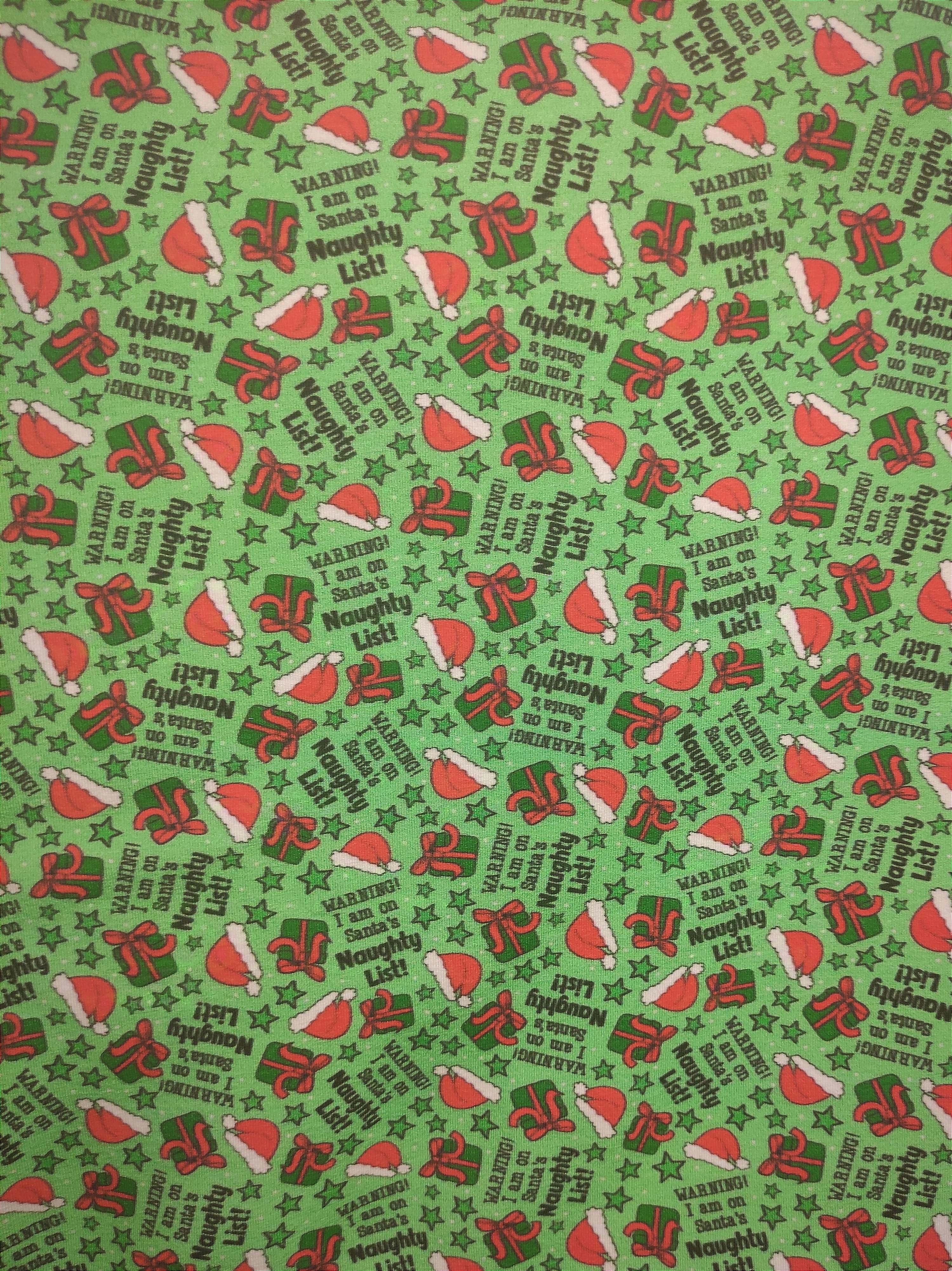 This is a stretchy lightweight cotton spandex fabric with Santa and cute text, trimmed with soft red velvet. Regular Size limited to only 9. Bambino Size is limited to only 7, Ankle Biter Size is limited to 2, Lil Nipper Size is limited to 2. No more will be made when they are gone.