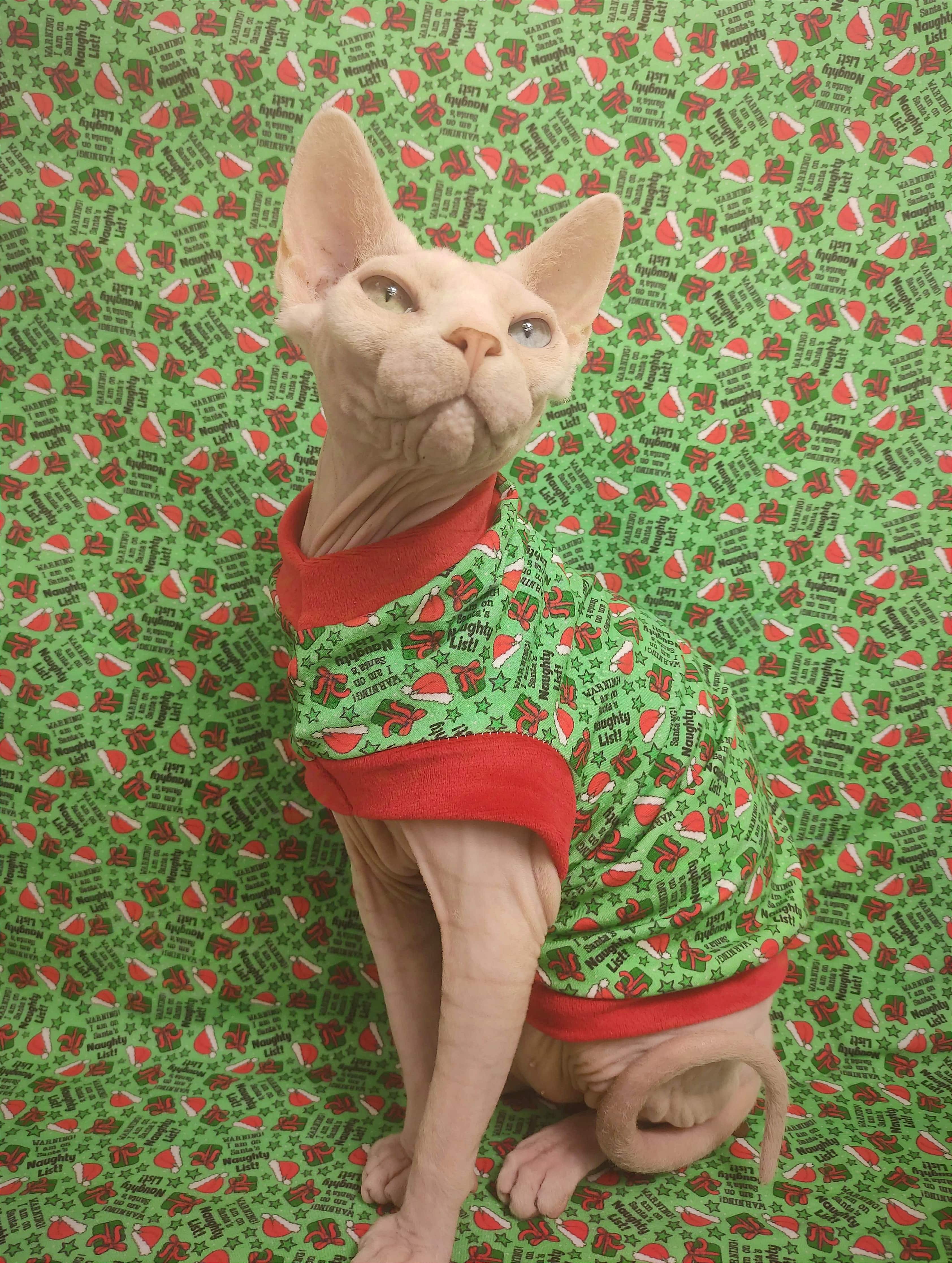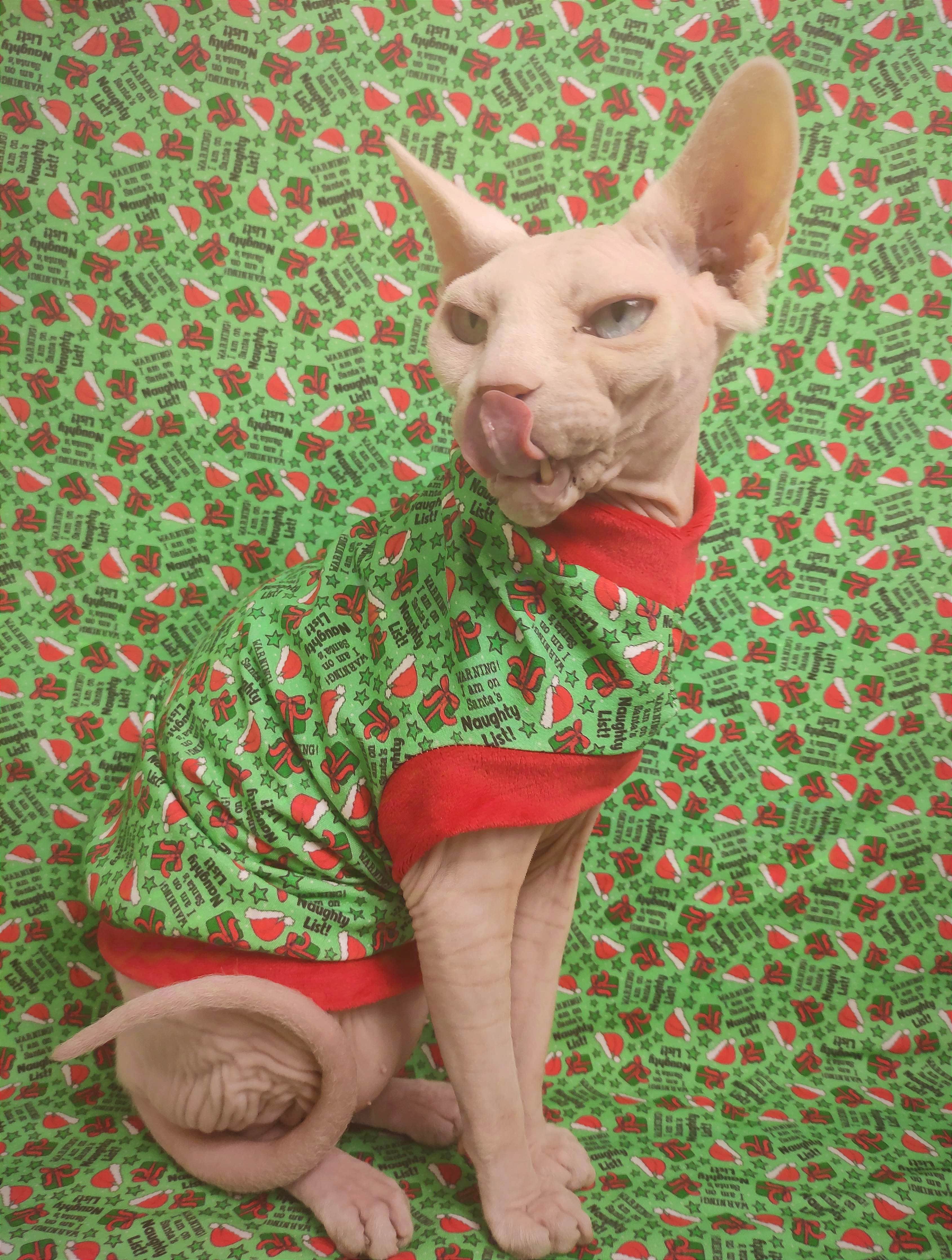 REGULAR size is for most adult hairless cats age 1 to 18. BAMBINO size fits hairless kittens age 6 months to 1 year and smaller adult cats. ANKLE BITER size fits kittens 15 weeks to 6 month olds. LIL NIPPER size fits hairless kittens age 8 weeks to 15 week olds for when they are with the breeder or for the trip home. Custom orders are welcome for larger and smaller cats - pricing is the same - $27.50