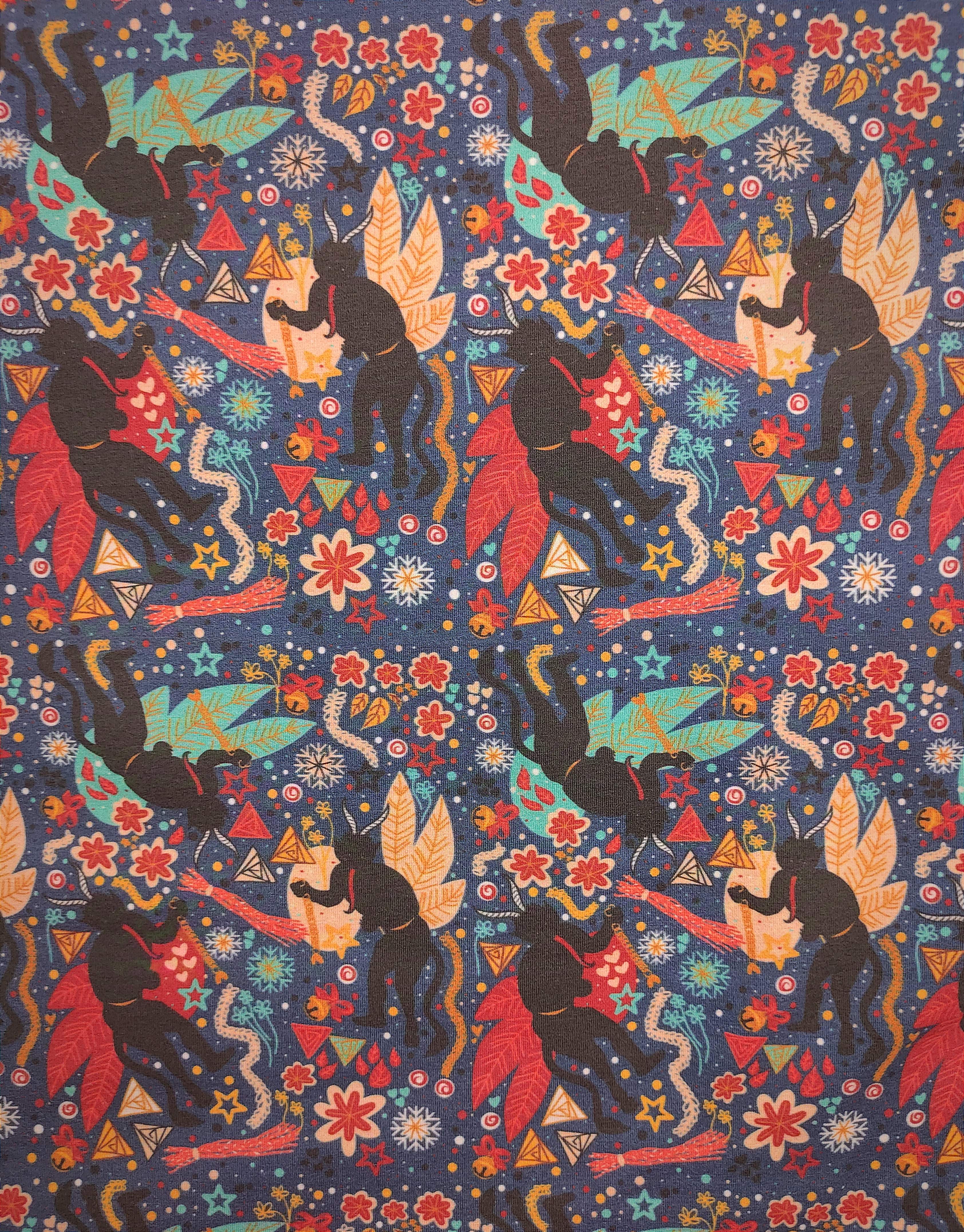 This is a stretchy lightweight cotton spandex fabric with Krampus art, trimmed with soft black velvet. Regular Size limited to only 9. Bambino Size is limited to only 7, Ankle Biter Size is limited to 2, Lil Nipper Size is limited to 2. No more will be made when they are gone.