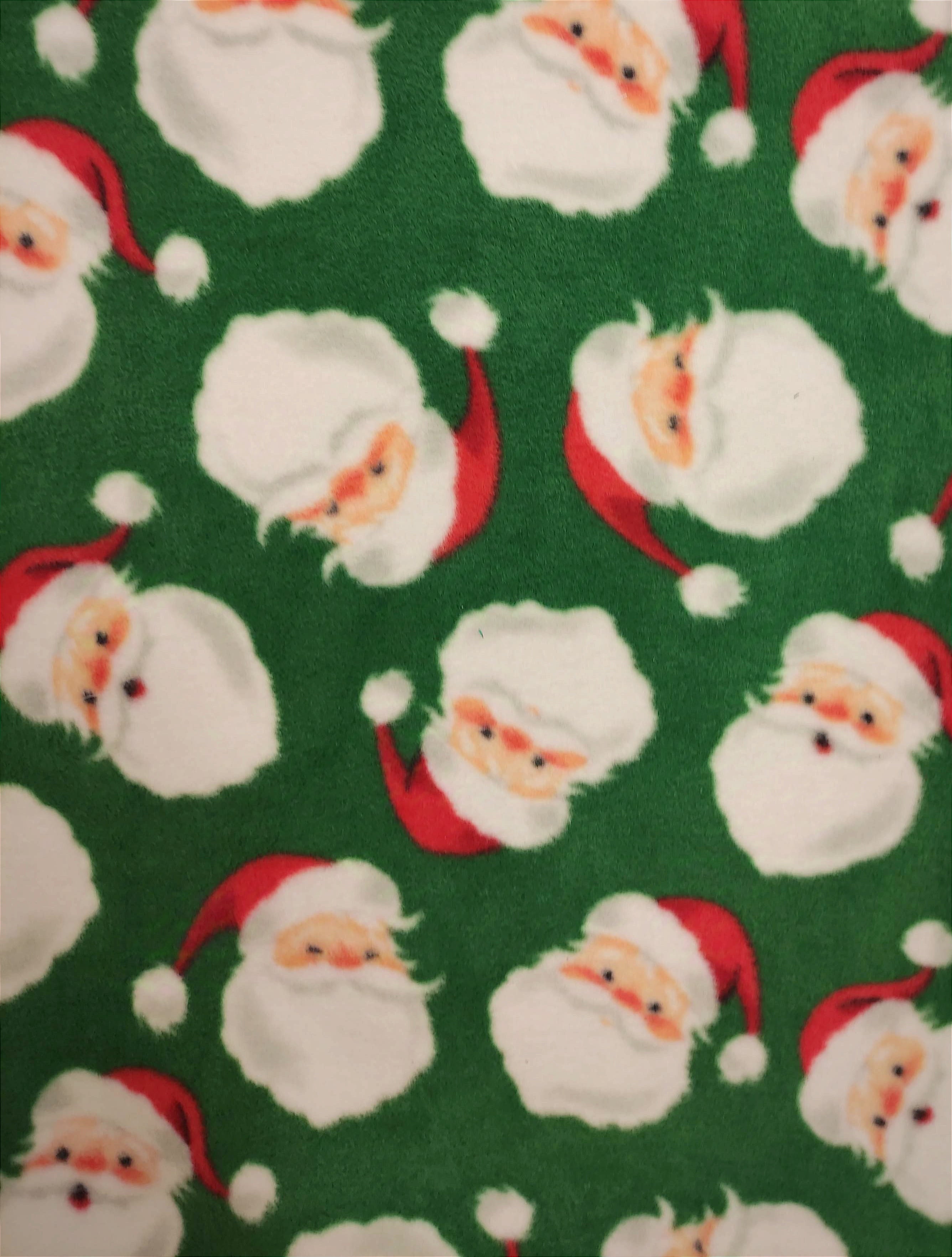 This is a soft medium weight stretchy with Santa faces on green background. Print is large and designs will be random.