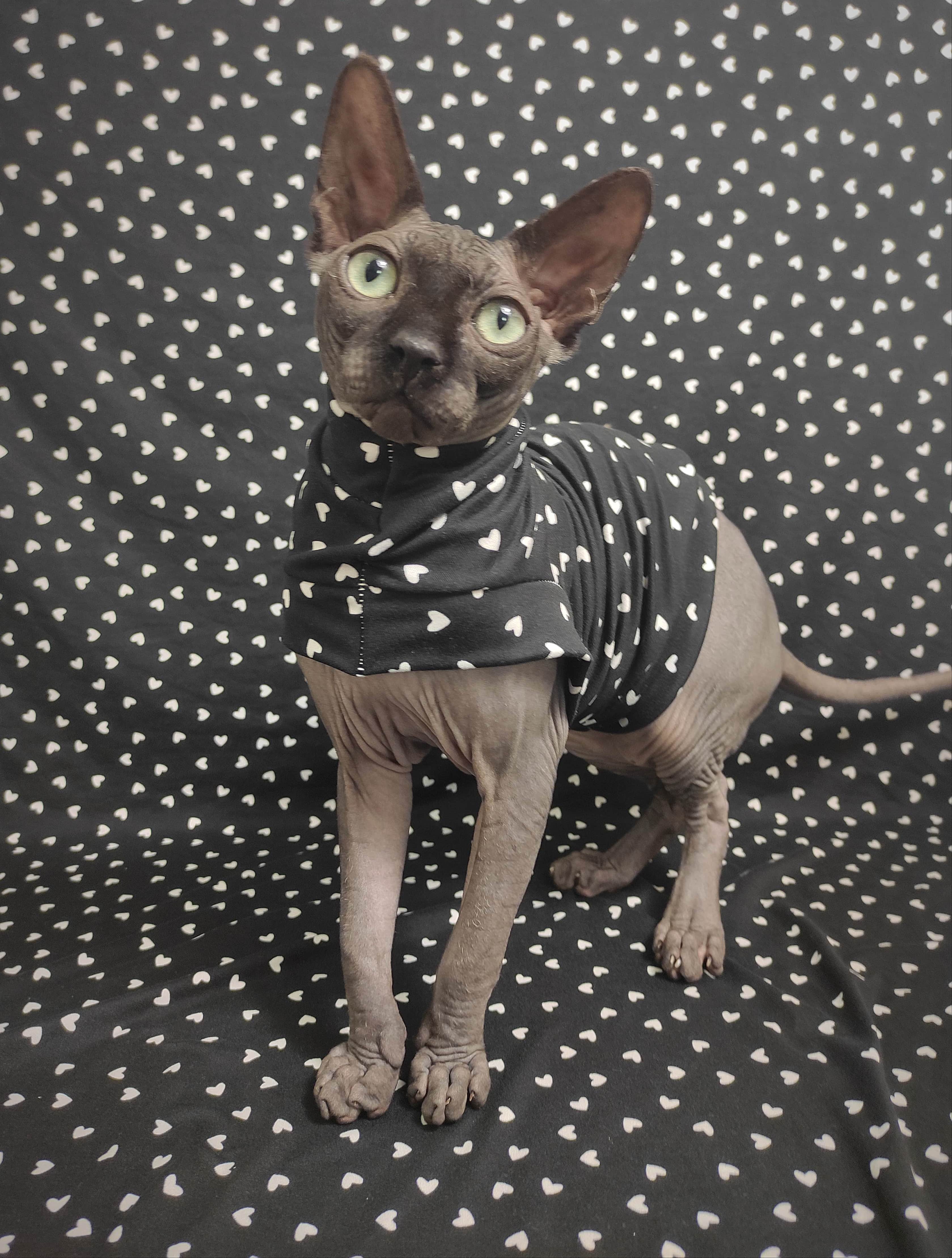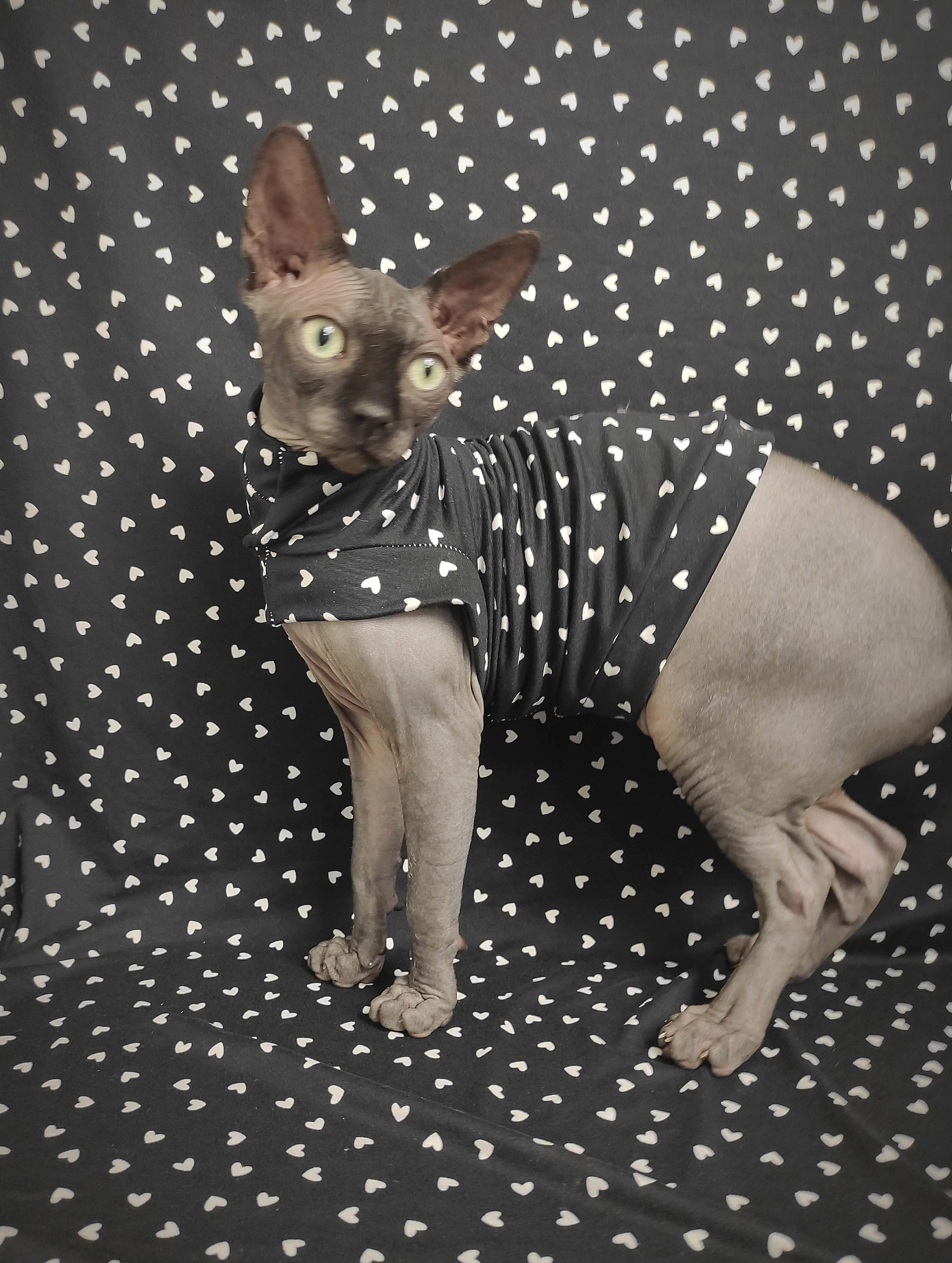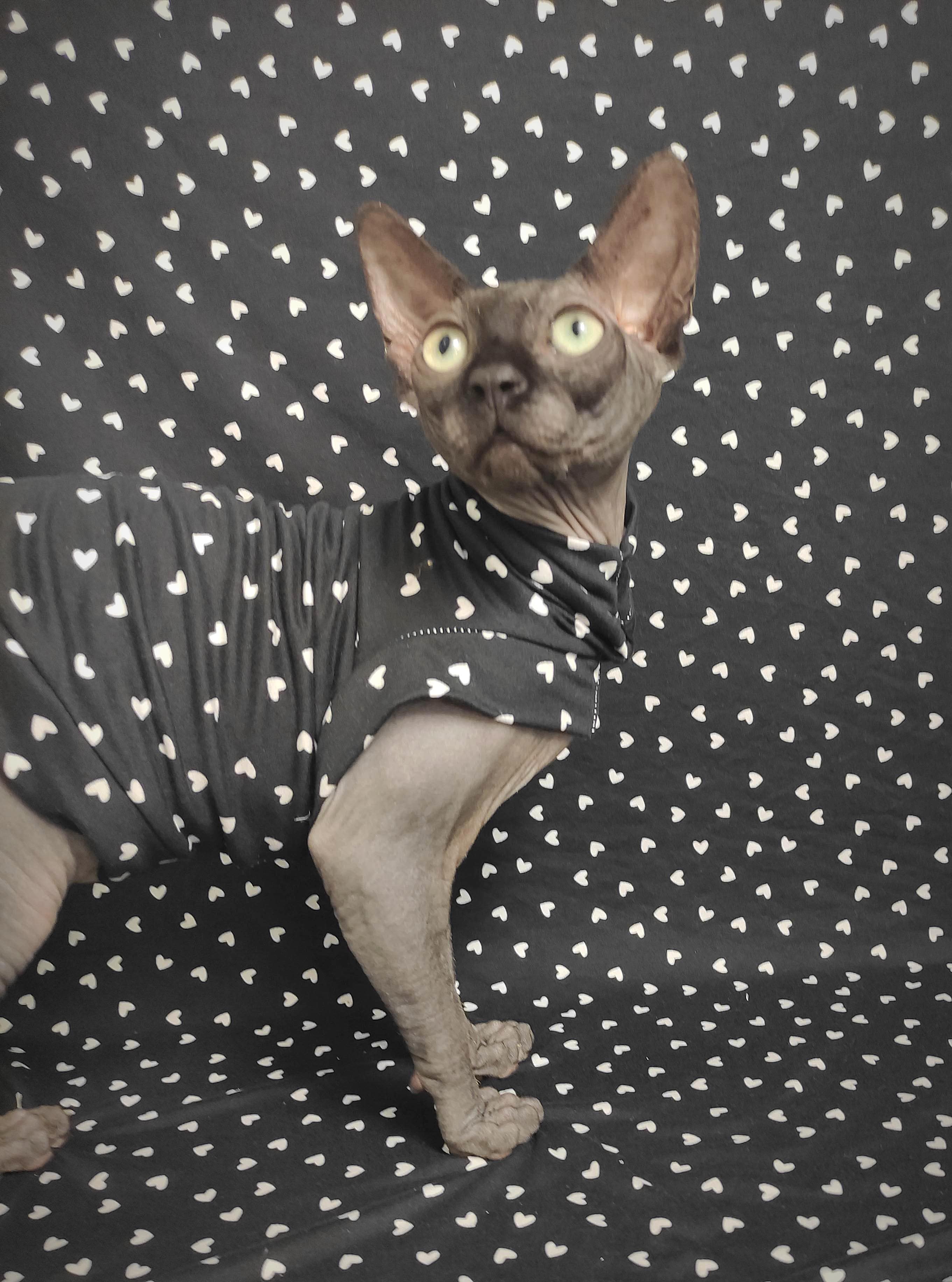 This is a Limited Edition cat shirt / sweater for your hairless Sphynx / Devon Rex / Cornish Rex / Peterbald, and even for some of our stylish furry friends. This sleeper is made from a stretchy cotton blend fabric. Made with special seams that minimize the seem profile. The Swag Sleepwear has a slimmer fit, larger armholes, and smaller trim to provide extra snuggly comfort for sleeping or catnapping! Regular Size limited to only 7. Bambino Size is limited to only 8, Ankle Biter Size is limited to 2, Lil Nipper Size is limited to 1. No more will be made when they are gone.