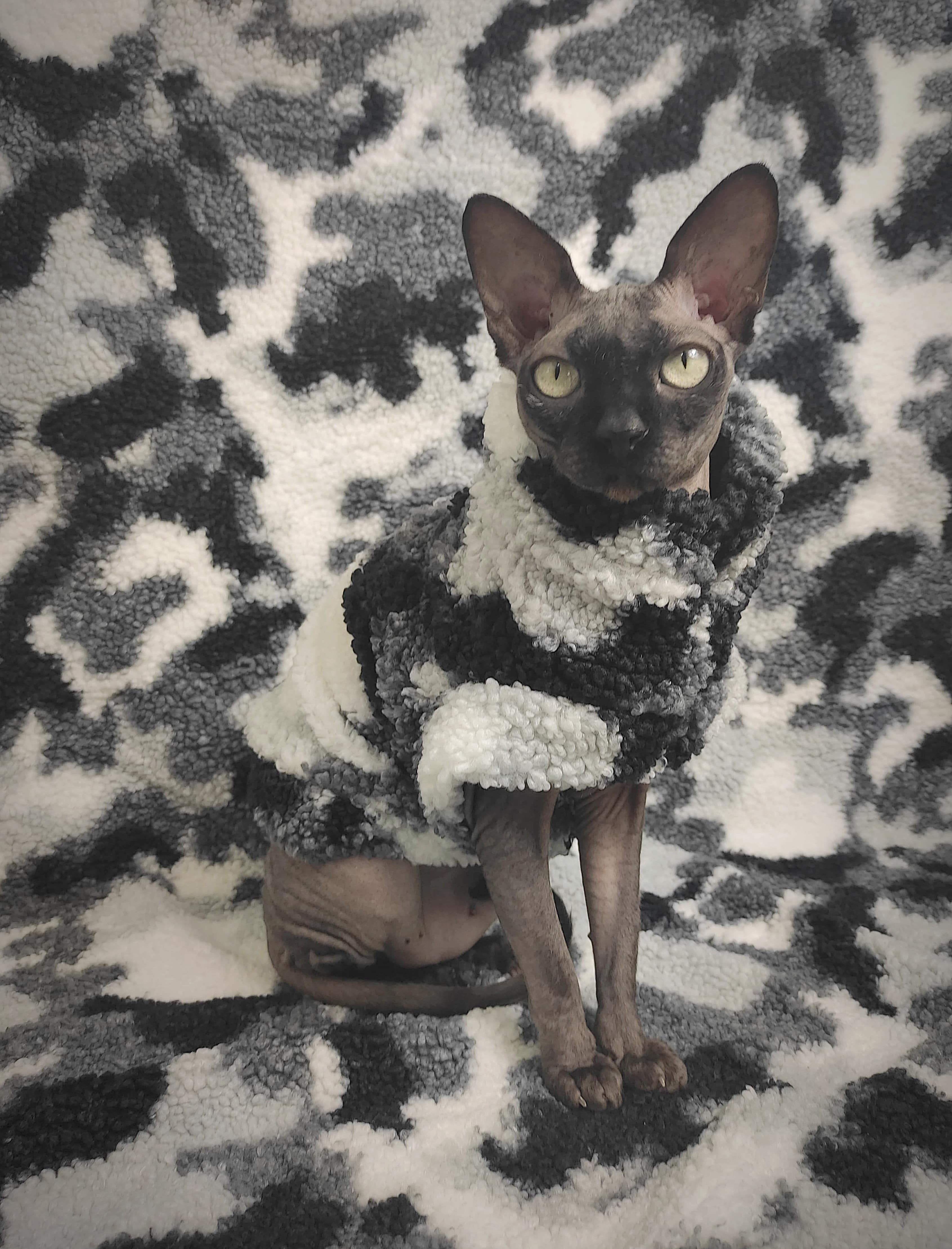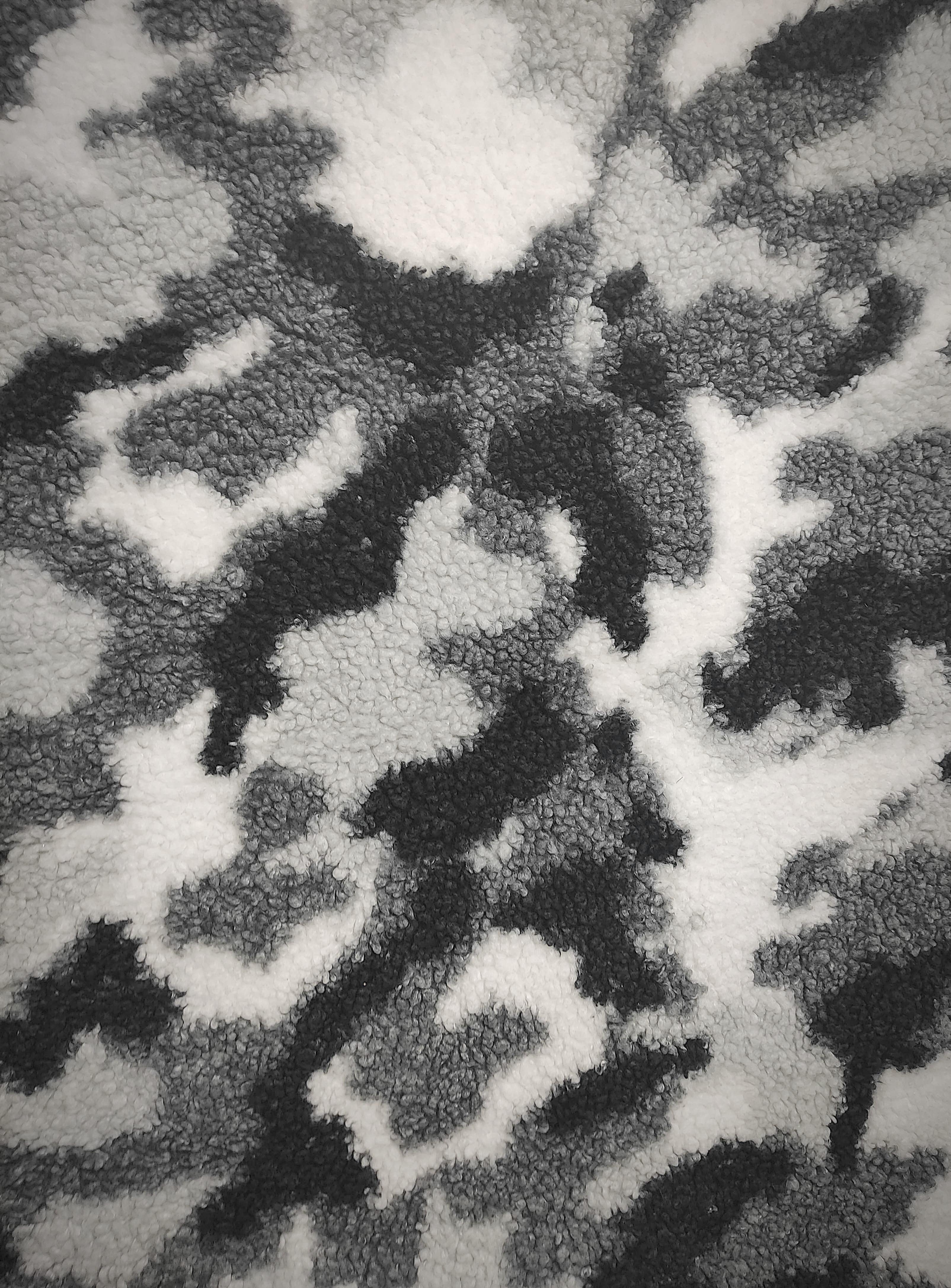 This is a heavy weight stretchy white grey and black camouflage Sherpa fleece. Regular Size limited to only 7. Bambino Size limited to only 7, Ankle Biter Size limited to only 2. Lil Nipper Size limited to only 2. No more will be made when they are gone.