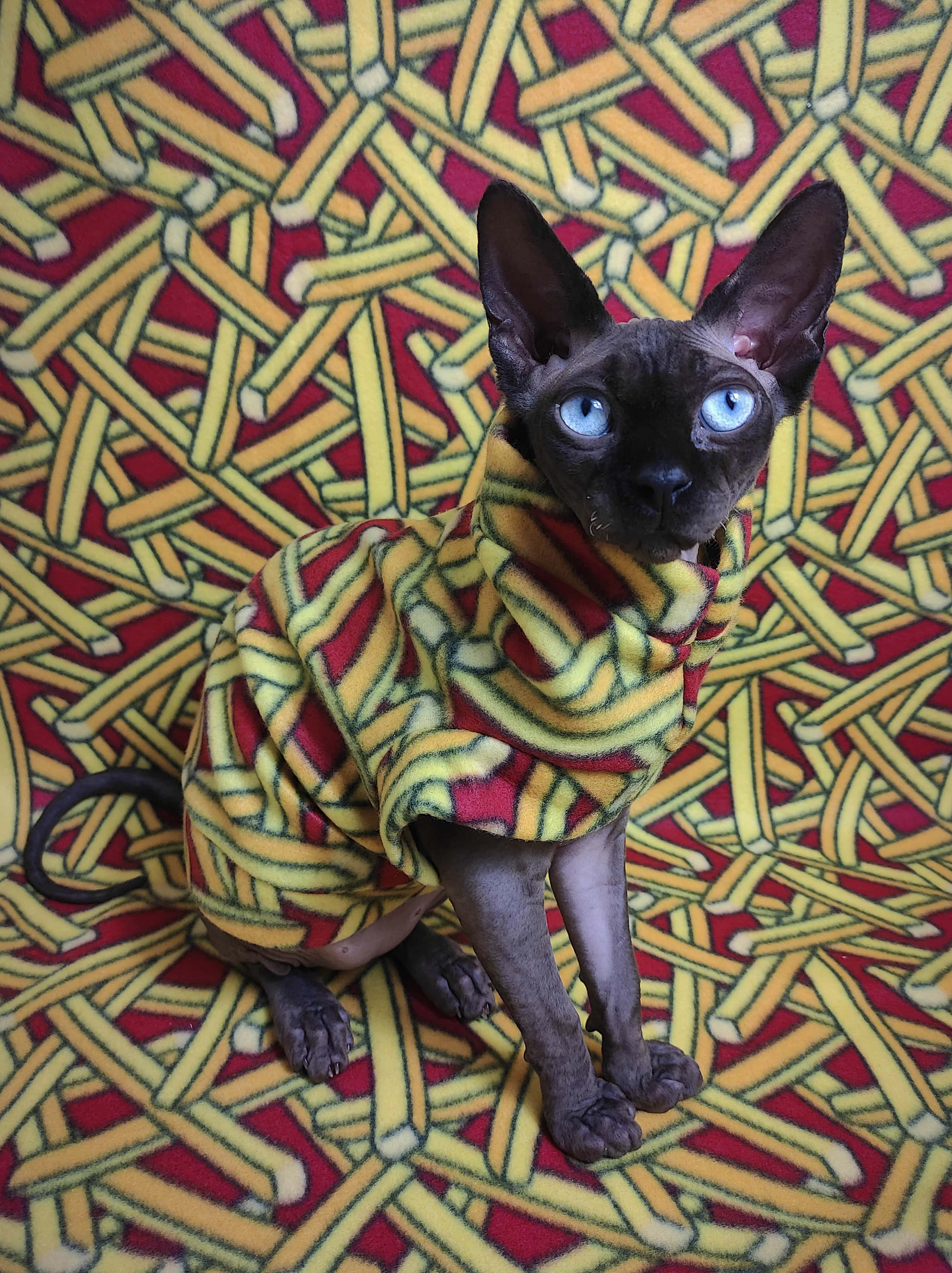 REGULAR size is for most adult hairless cats age 1 to 18. BAMBINO size fits hairless kittens age 6 months to 1 year and smaller adult cats. LIL NIPPER size fits hairless kittens age 8 weeks to 15 week olds for when they are with the breeder or for the trip home. Custom orders are welcome for larger and smaller cats - pricing is the same - $27.50