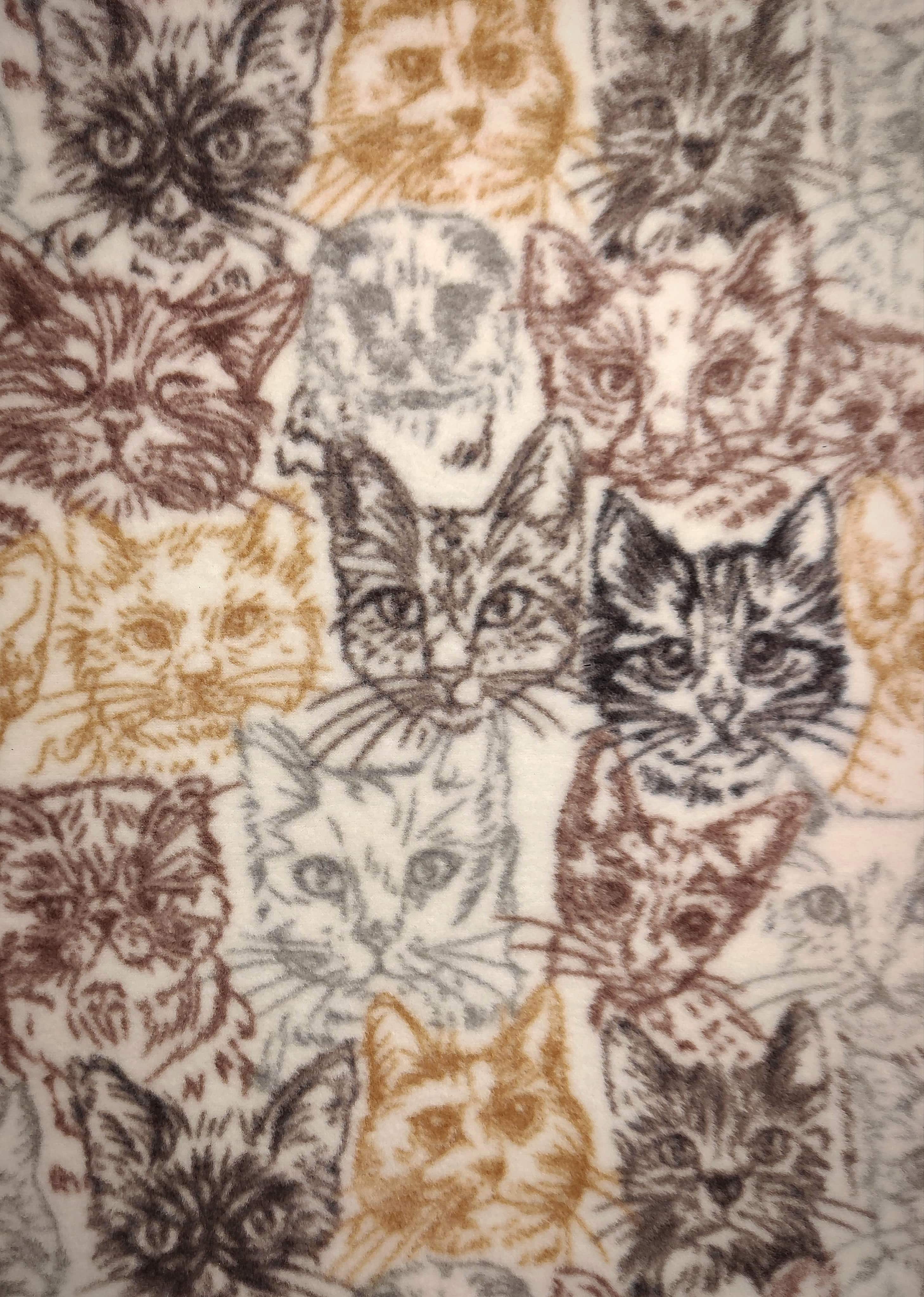This is a soft medium weight stretchy plush fleece with beautiful cat faces on tan background. Print is large and designs will be random.