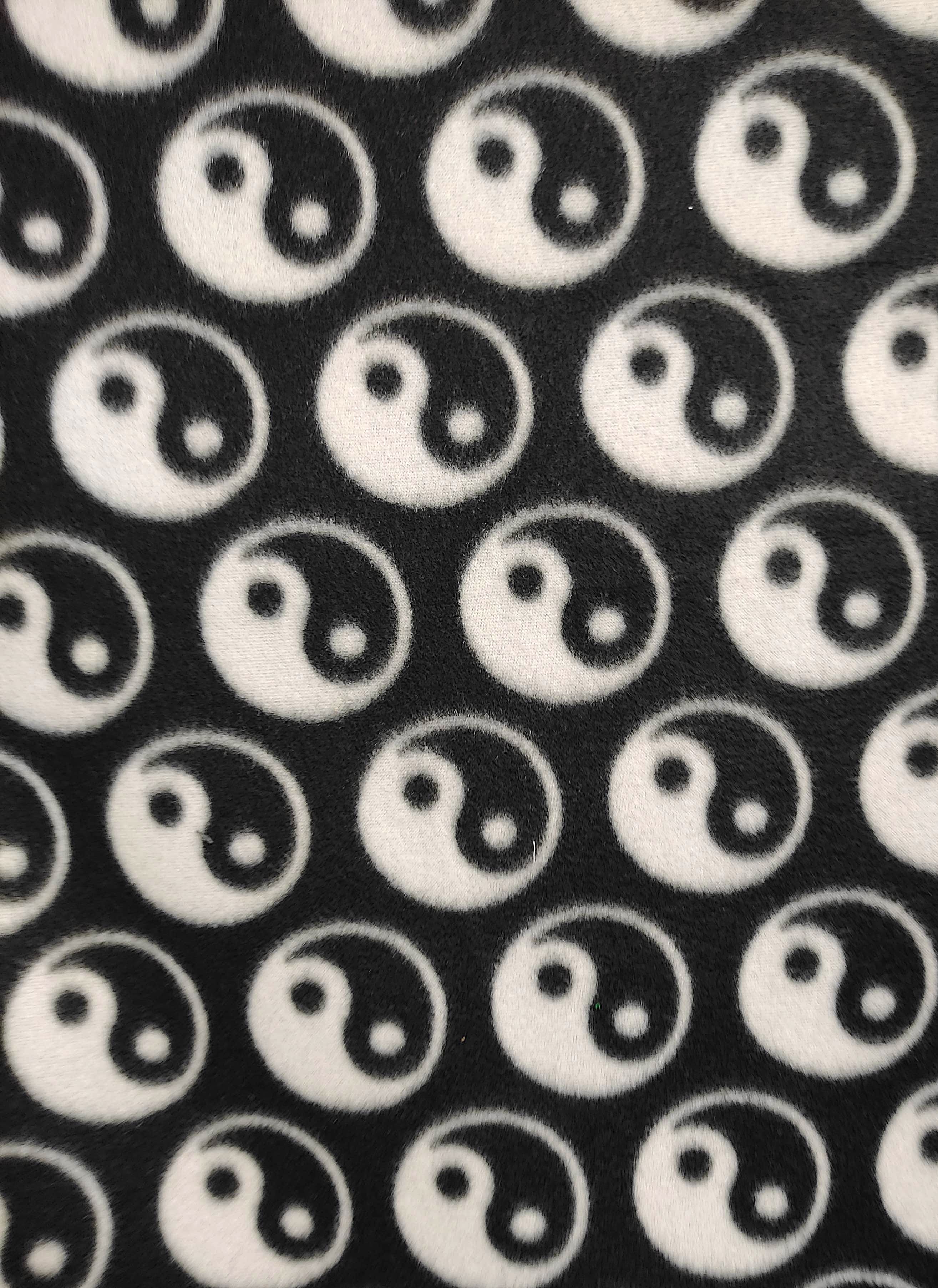 This is a soft lightweight stretchy fleece with yin and yangs on black background.