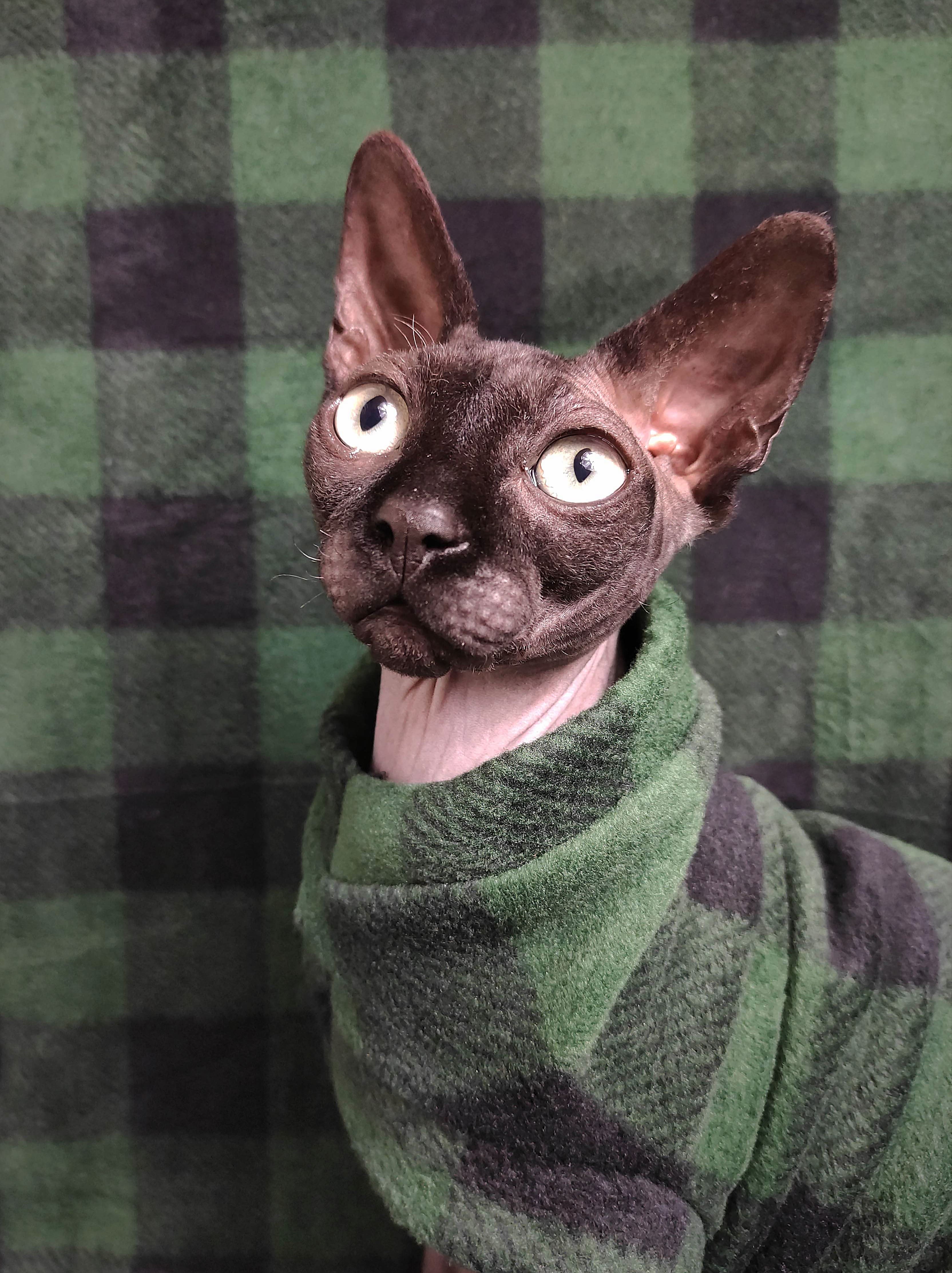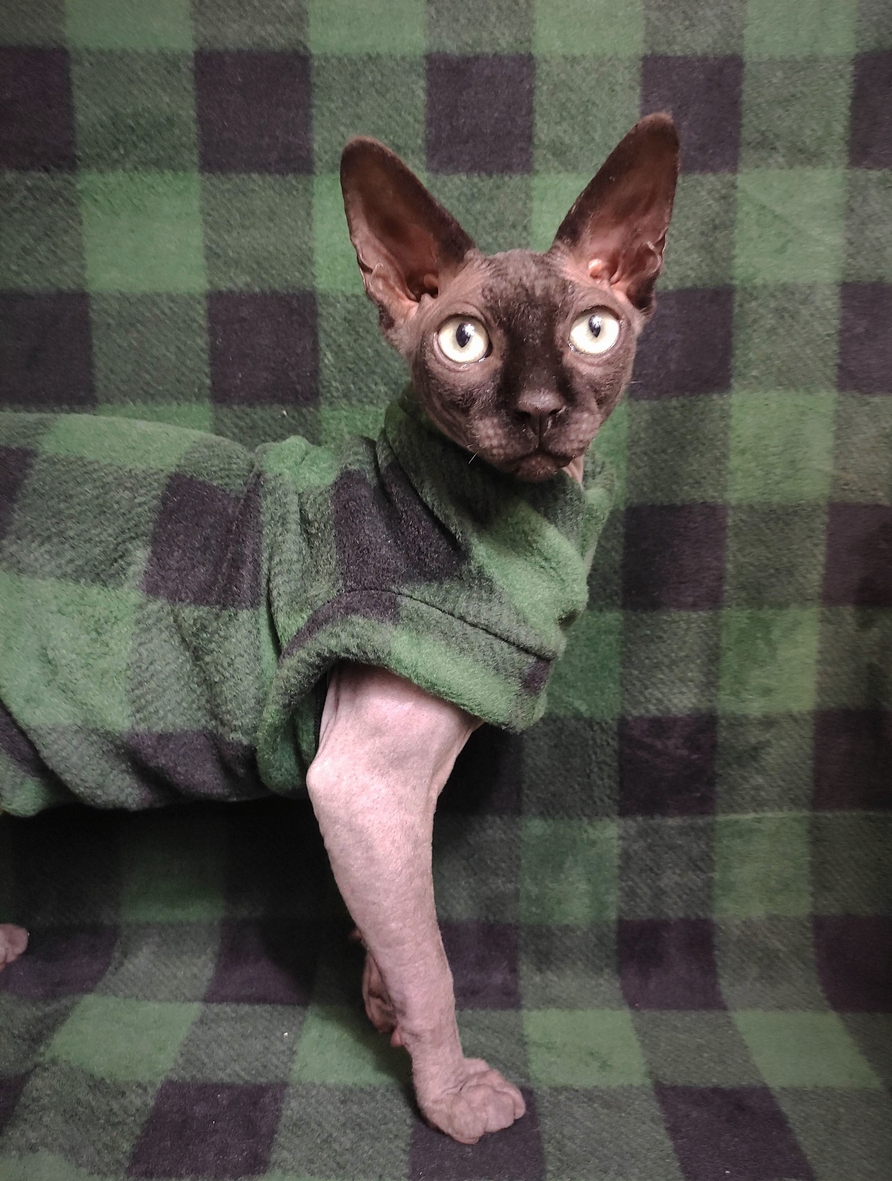 REGULAR size is for most adult hairless cats age 1 to 18. BAMBINO size fits hairless kittens age 6 months to 1 year and smaller adult cats. LIL NIPPER size fits hairless kittens age 8 weeks to 15 week olds for when they are with the breeder or for the trip home. Custom orders are welcome for larger and smaller cats - pricing is the same - $27.50