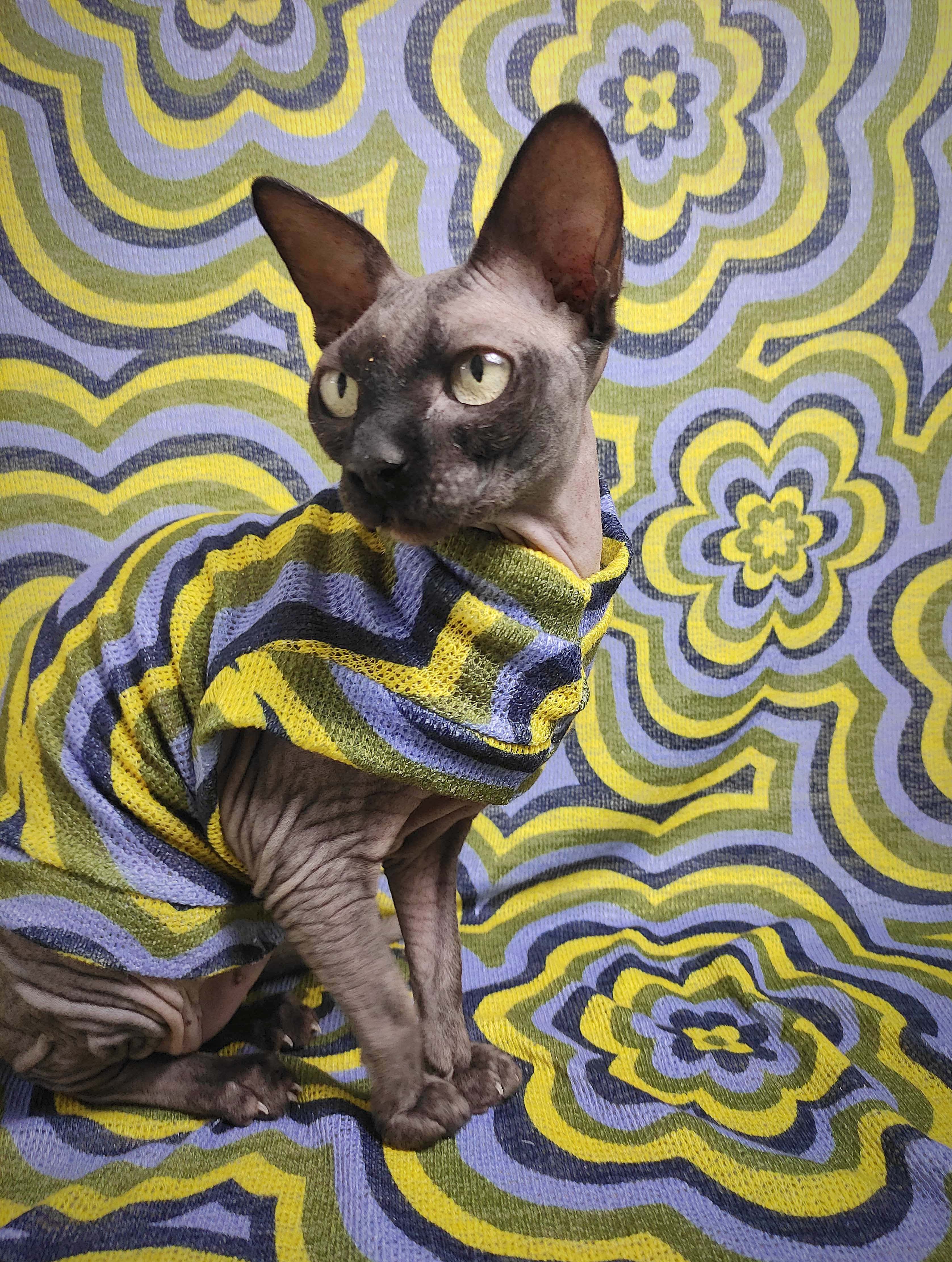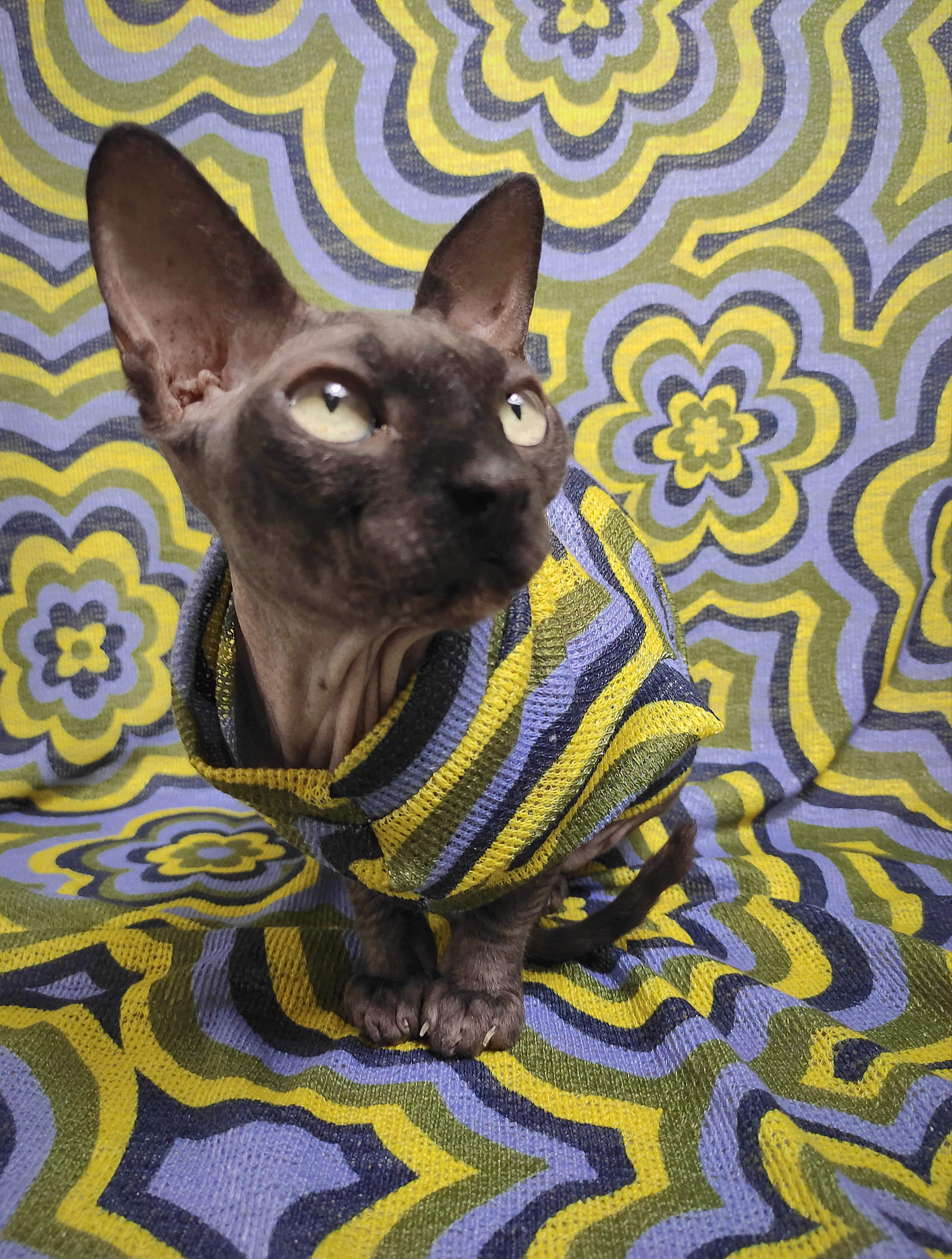 REGULAR size is for most adult hairless cats age 1 to 18. BAMBINO size fits hairless kittens age 6 months to 1 year and smaller adult cats. ANKLE BITER size fits hairless kittens 15 week to 6 month olds. LIL NIPPER size fits hairless kittens age 8 weeks to 15 week olds for when they are with the breeder or for the trip home. Custom orders are welcome for larger and smaller cats - pricing is the same - $27.50