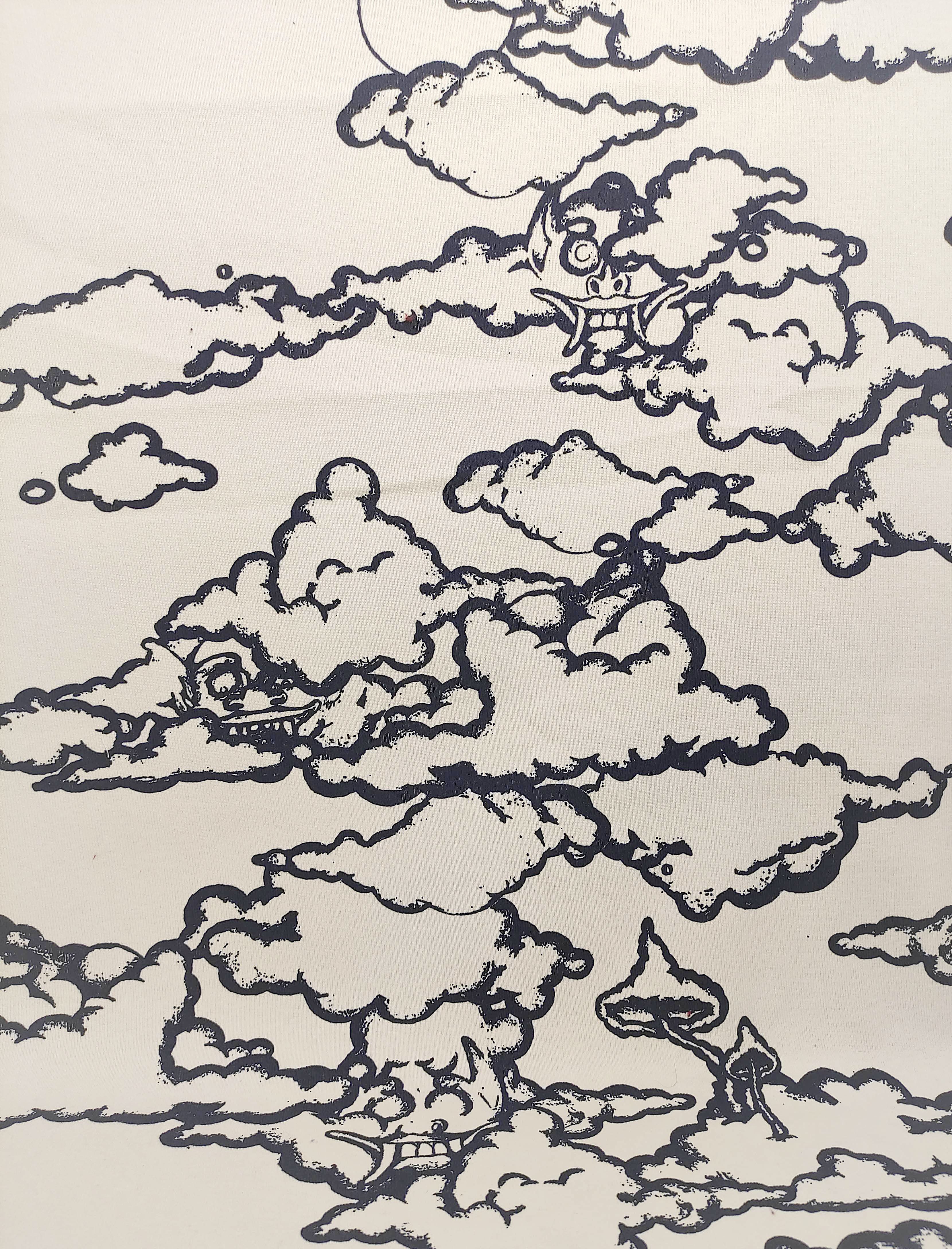 This is a beautiful thick cotton ribbed stretchy white fabric with printed clouds demons, moons and mushrooms. Regular Size limited to only 9. Bambino Size is limited to only 10, Ankle Biter Size is limited to 2, Lil Nipper Size is limited to 2. No more will be made when they are gone.