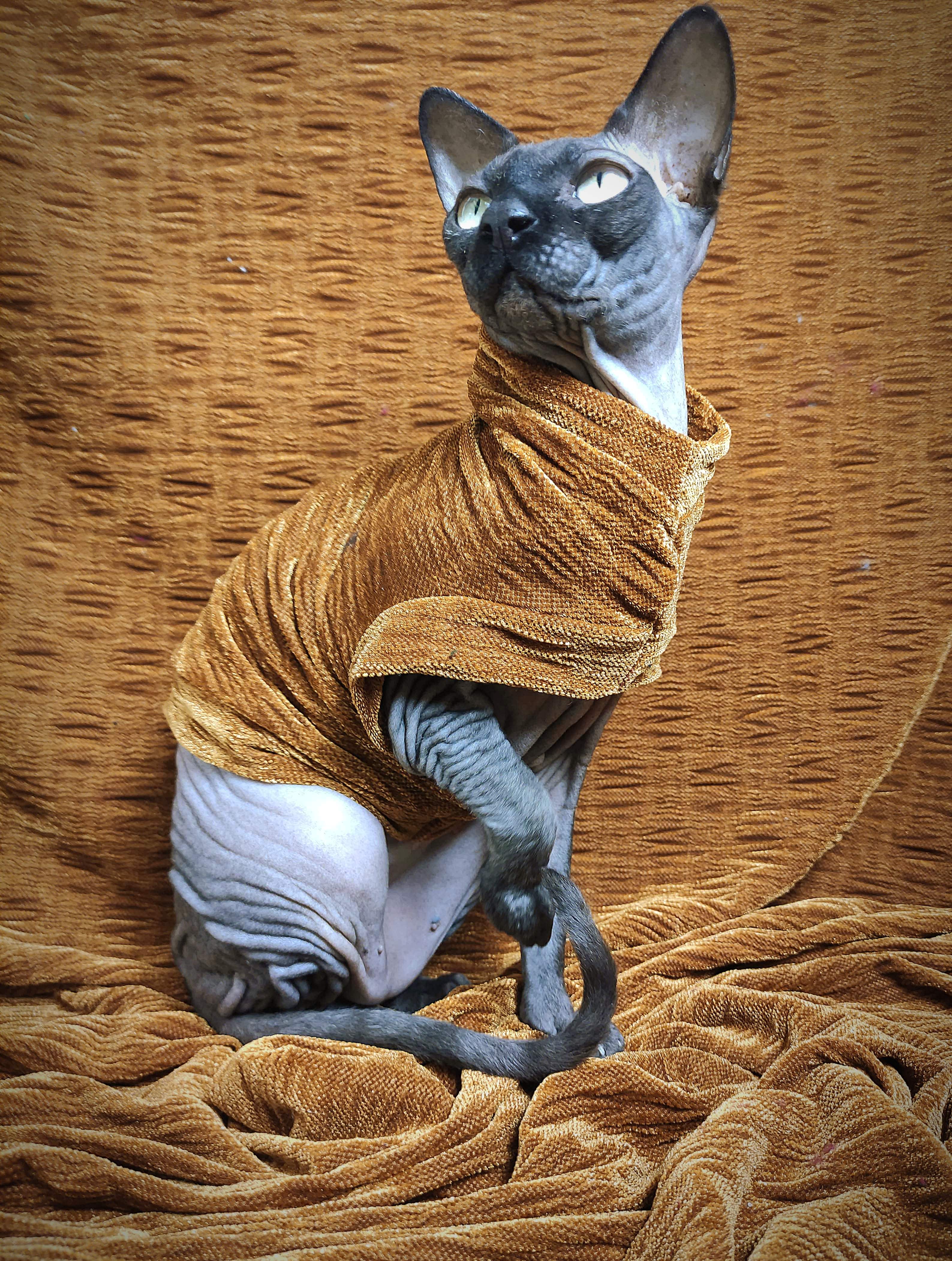 REGULAR size is for most adult hairless cats age 1 to 18. BAMBINO size fits hairless kittens age 6 months to 1 year and smaller adult cats. ANKLE BITER size fits kittens 15 weeks to 6 month olds. LIL NIPPER size fits hairless kittens age 8 weeks to 15 week olds for when they are with the breeder or for the trip home. Custom orders are welcome for larger and smaller cats - pricing is the same - $27.50