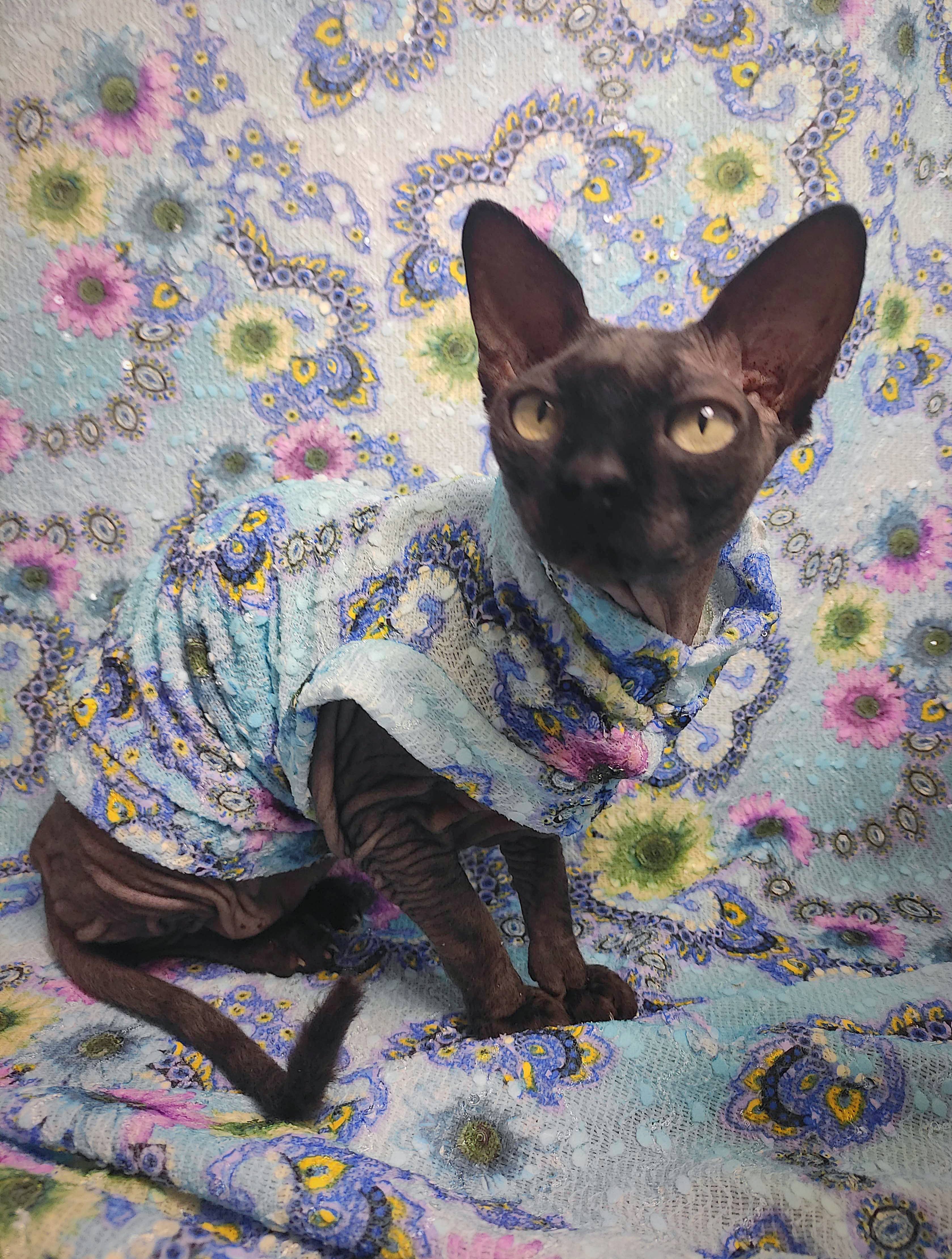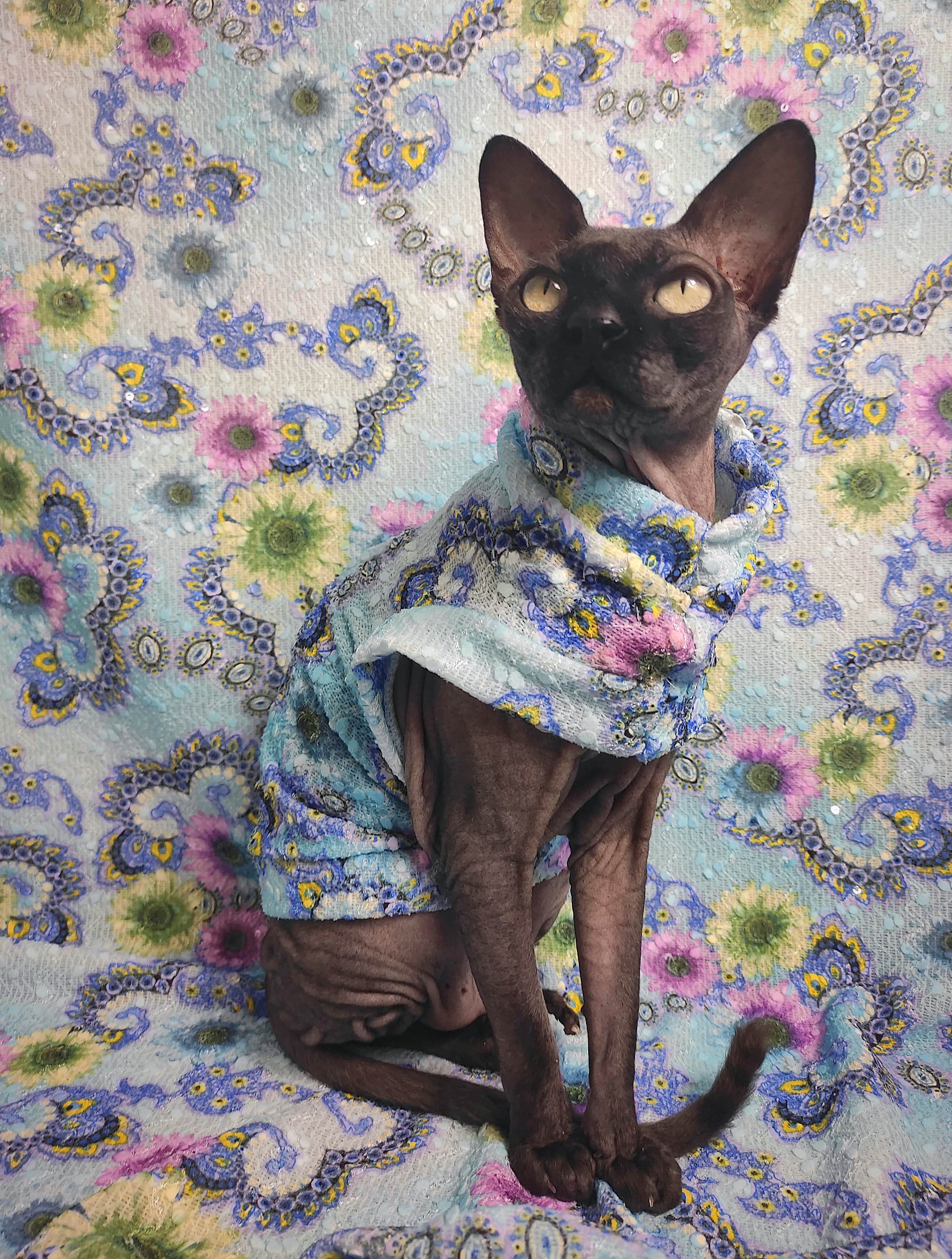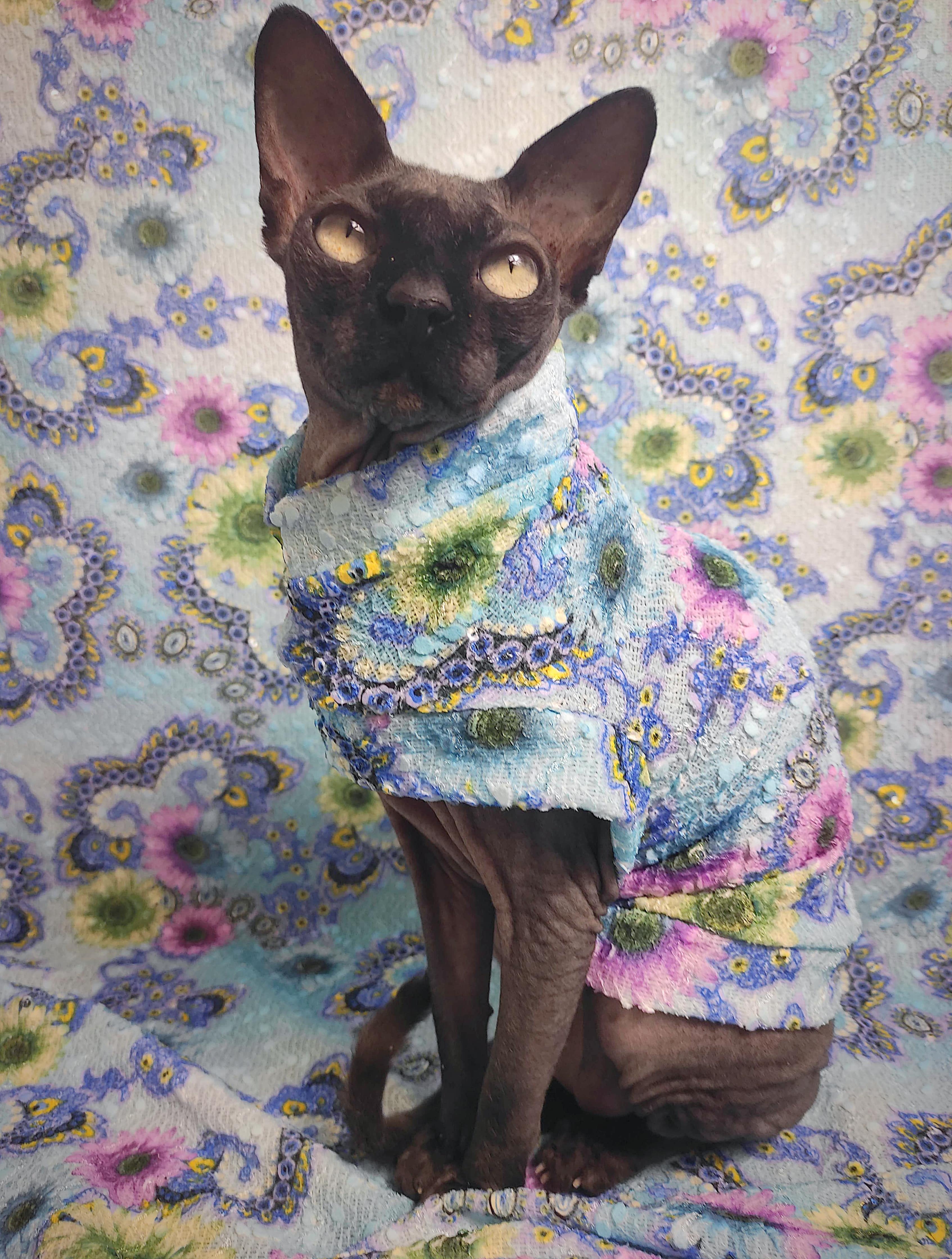 REGULAR size is for most adult hairless cats age 1 to 18. BAMBINO size fits hairless kittens age 6 months to 1 year and smaller adult cats. ANKLE BITER size fits kittens 15 weeks to 6 month olds. LIL NIPPER size fits hairless kittens age 8 weeks to 15 week olds for when they are with the breeder or for the trip home. Custom orders are welcome for larger and smaller cats - pricing is the same - $27.50
