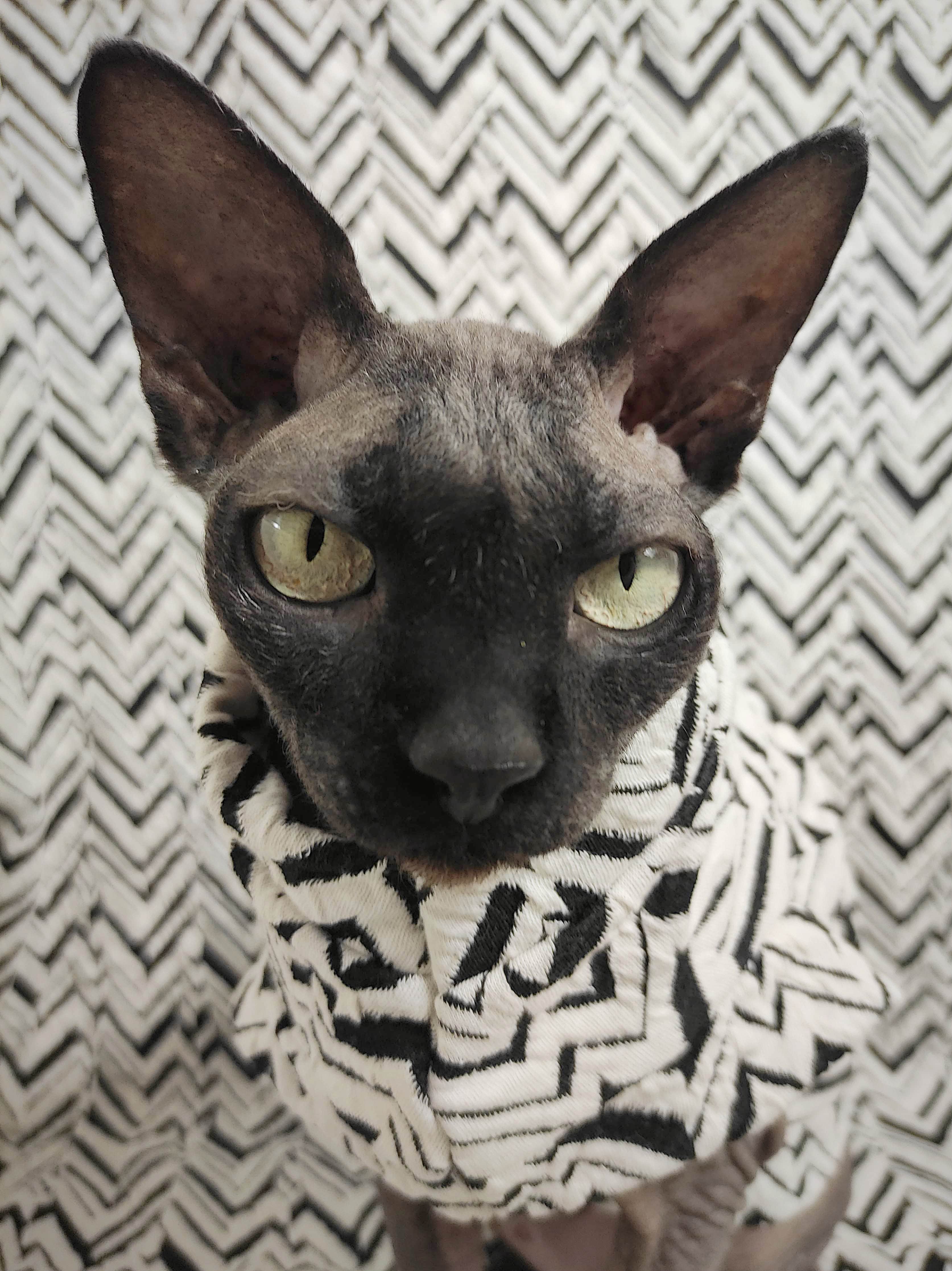 REGULAR size is for most adult hairless cats age 1 to 18. BAMBINO size fits hairless kittens age 6 months to 1 year and smaller adult cats. ANKLE BITER size fits kittens 15 weeks to 6 month olds. LIL NIPPER size fits hairless kittens age 8 weeks to 15 week olds for when they are with the breeder or for the trip home. Custom orders are welcome for larger and smaller cats - pricing is the same - $27.50