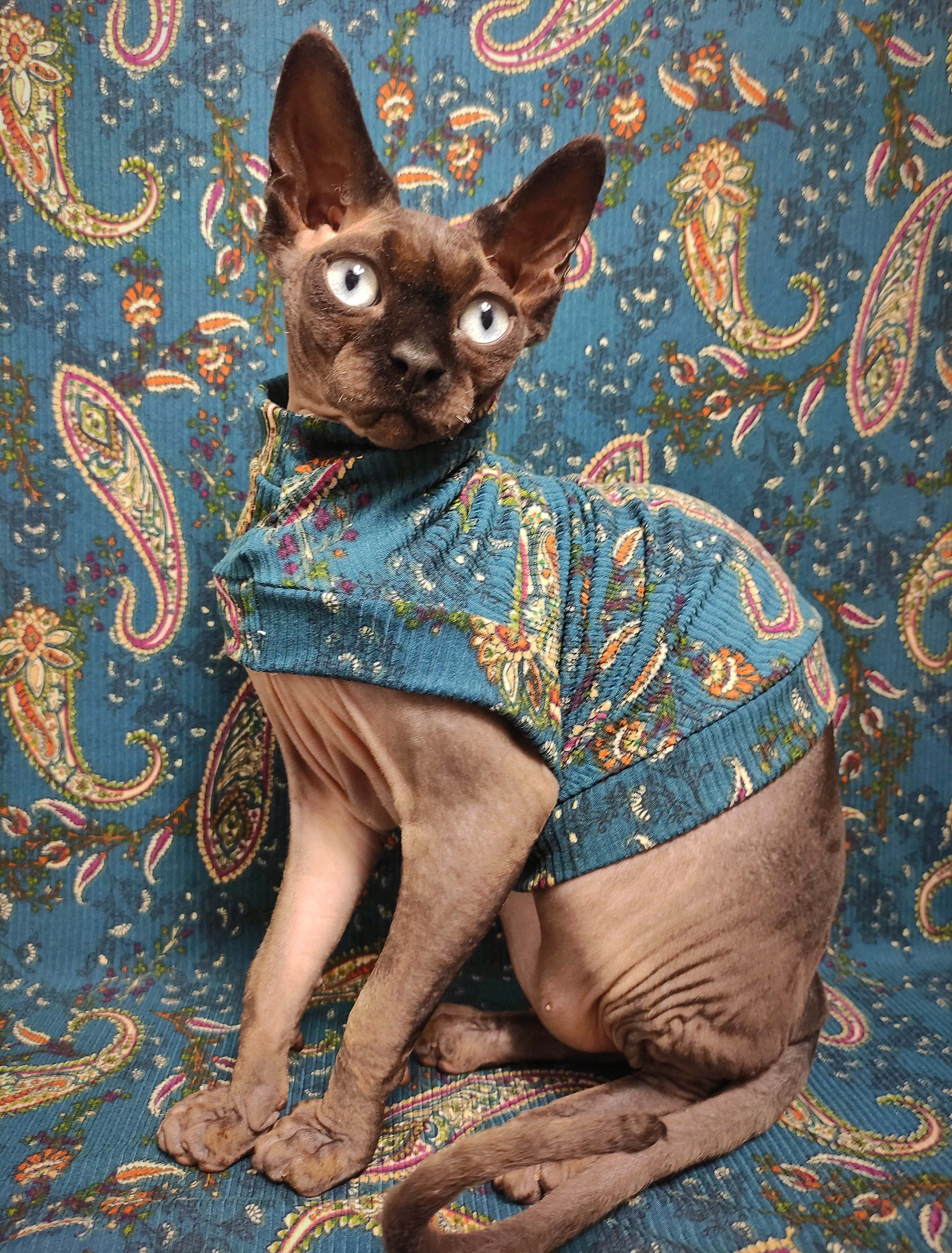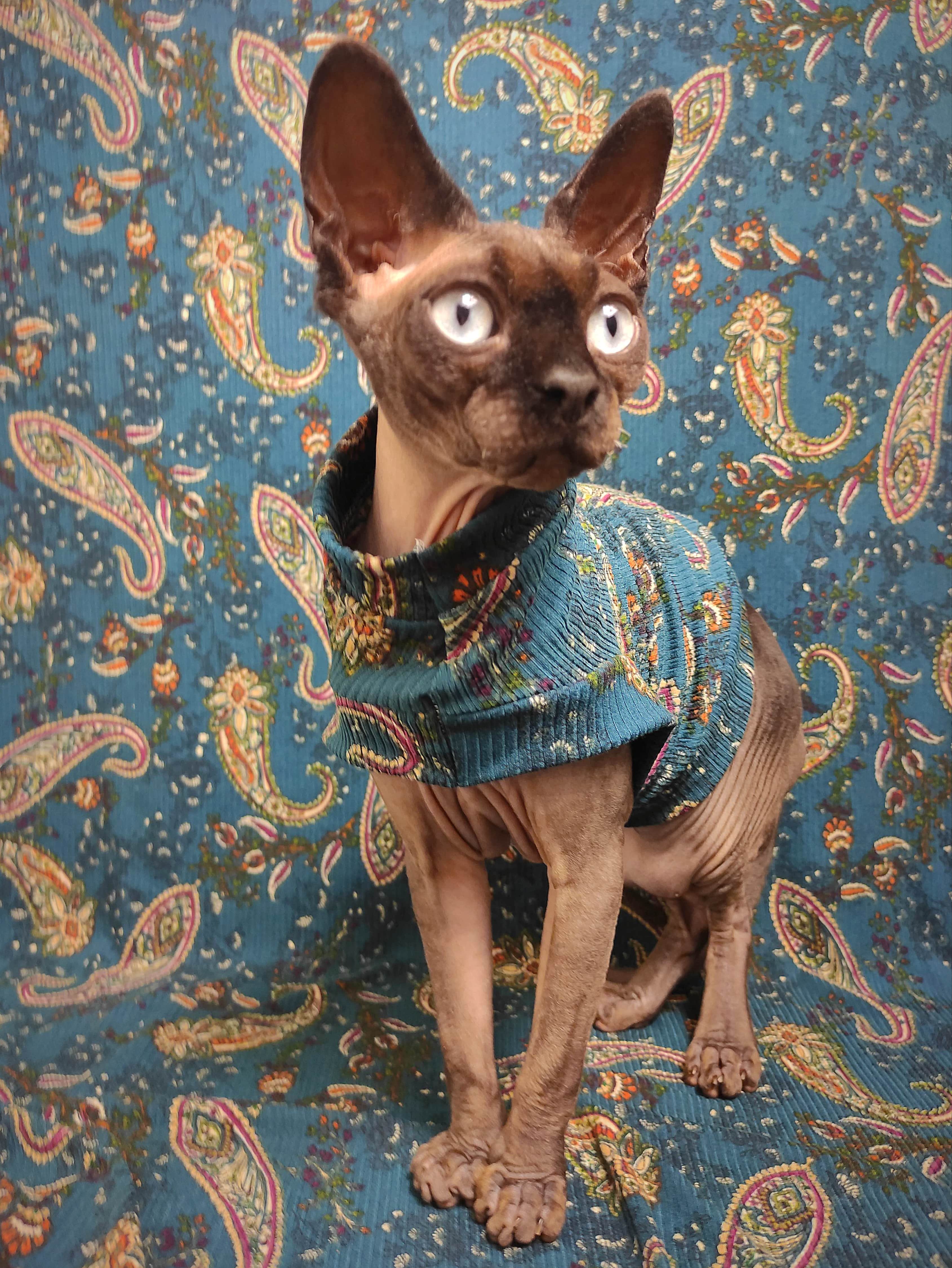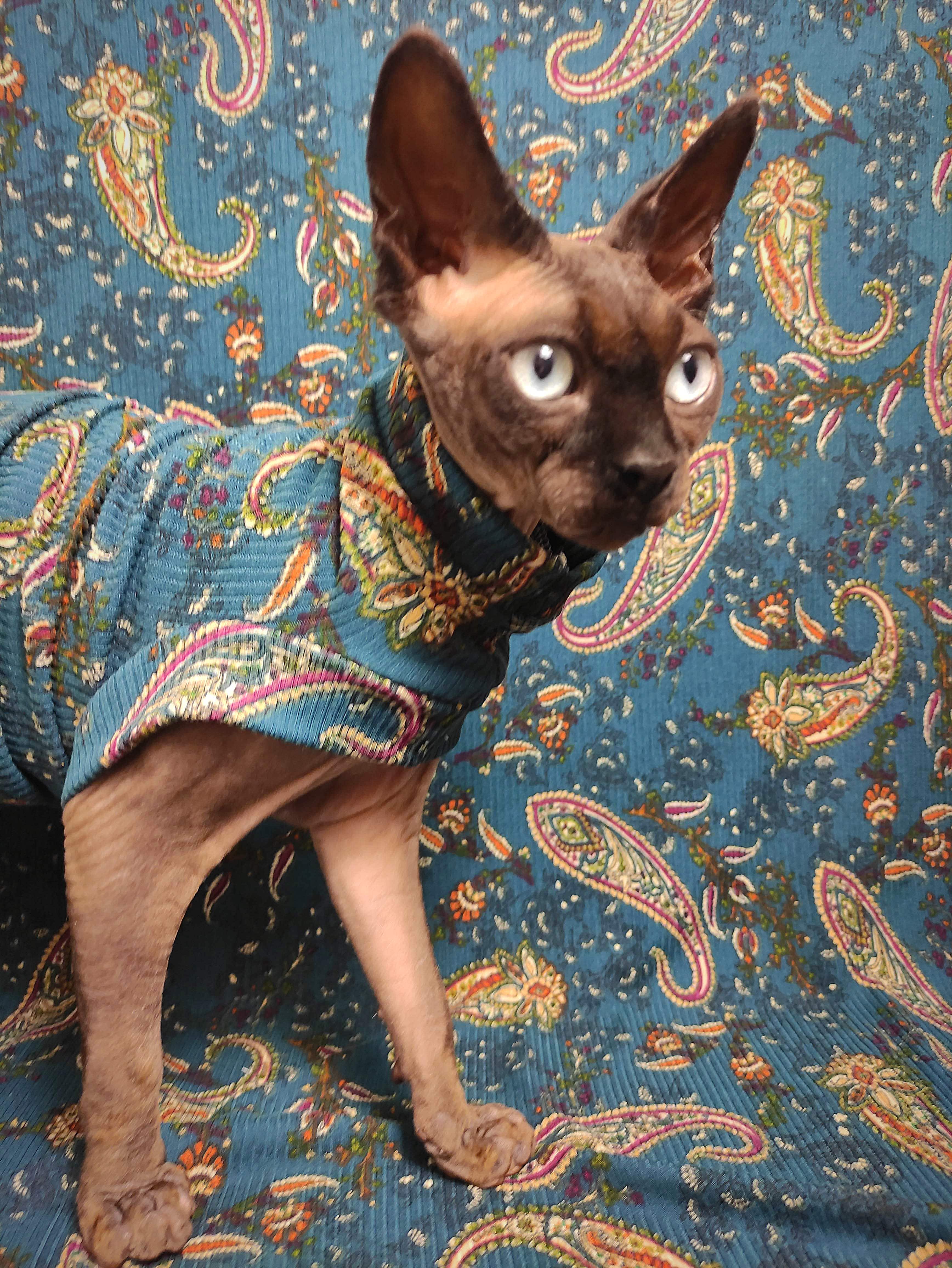 REGULAR size is for most adult hairless cats age 1 to 18. BAMBINO size fits hairless kittens age 6 months to 1 year and smaller adult cats. ANKLE BITER size fits kittens 15 weeks to 6 month olds. LIL NIPPER size fits hairless kittens age 8 weeks to 15 week olds for when they are with the breeder or for the trip home. Custom orders are welcome for larger and smaller cats - pricing is the same - $27.50
