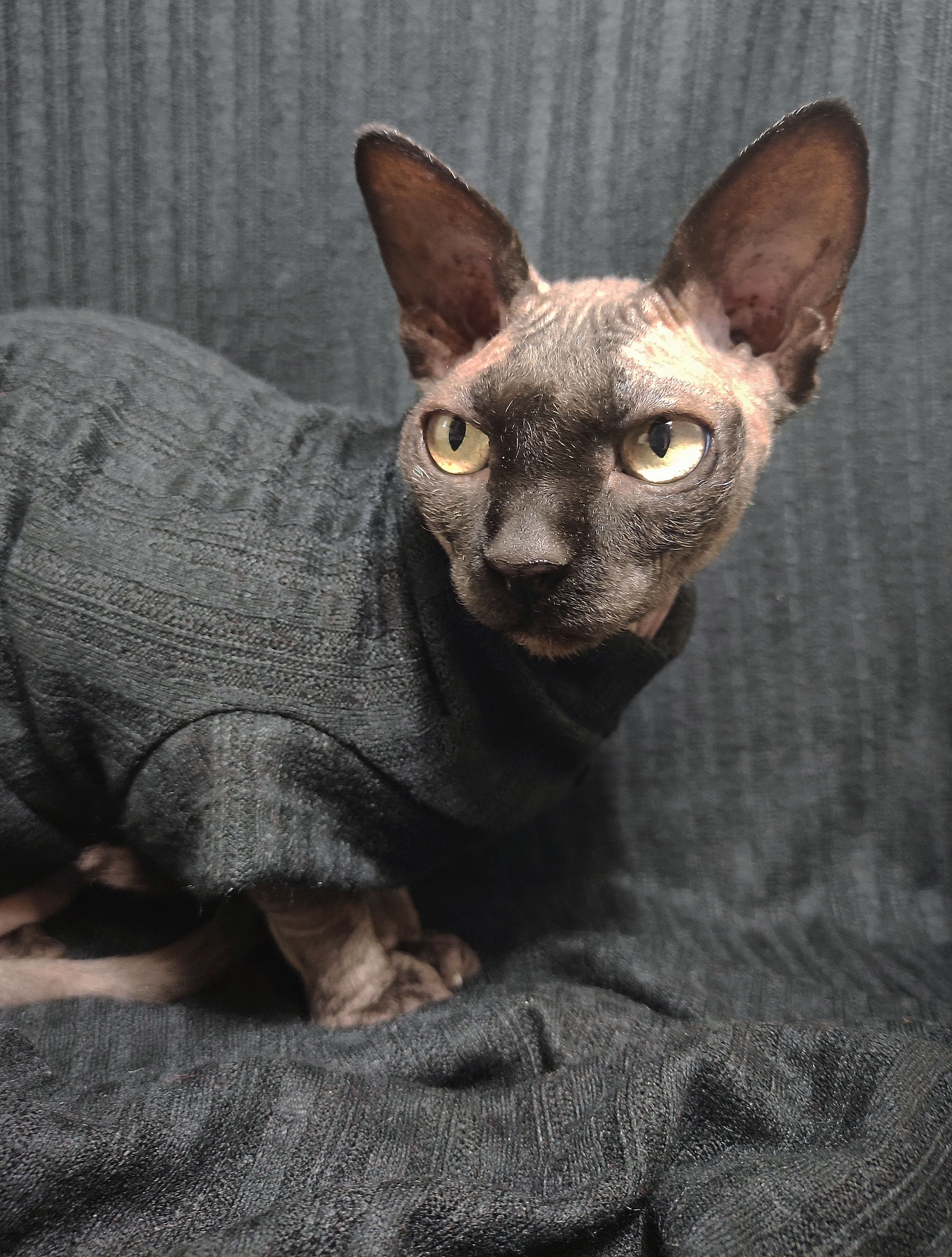 REGULAR size is for most adult hairless cats age 1 to 18. BAMBINO size fits hairless kittens age 6 months to 1 year and smaller adult cats. ANKLE BITER size fits hairless kittens 15 week to 6 month olds. LIL NIPPER size fits hairless kittens age 8 weeks to 15 week olds for when they are with the breeder or for the trip home. Custom orders are welcome for larger and smaller cats - pricing is the same - $27.50