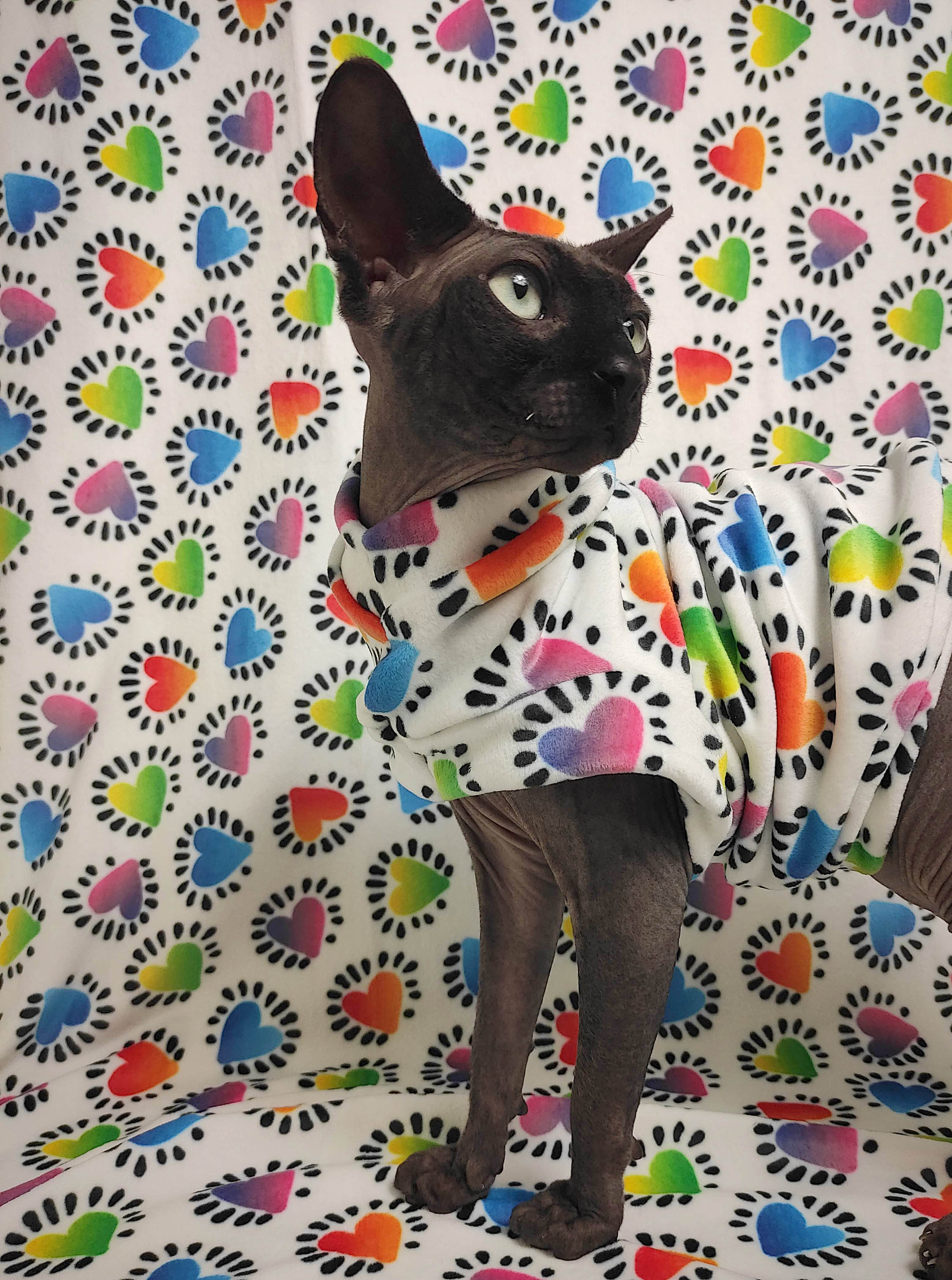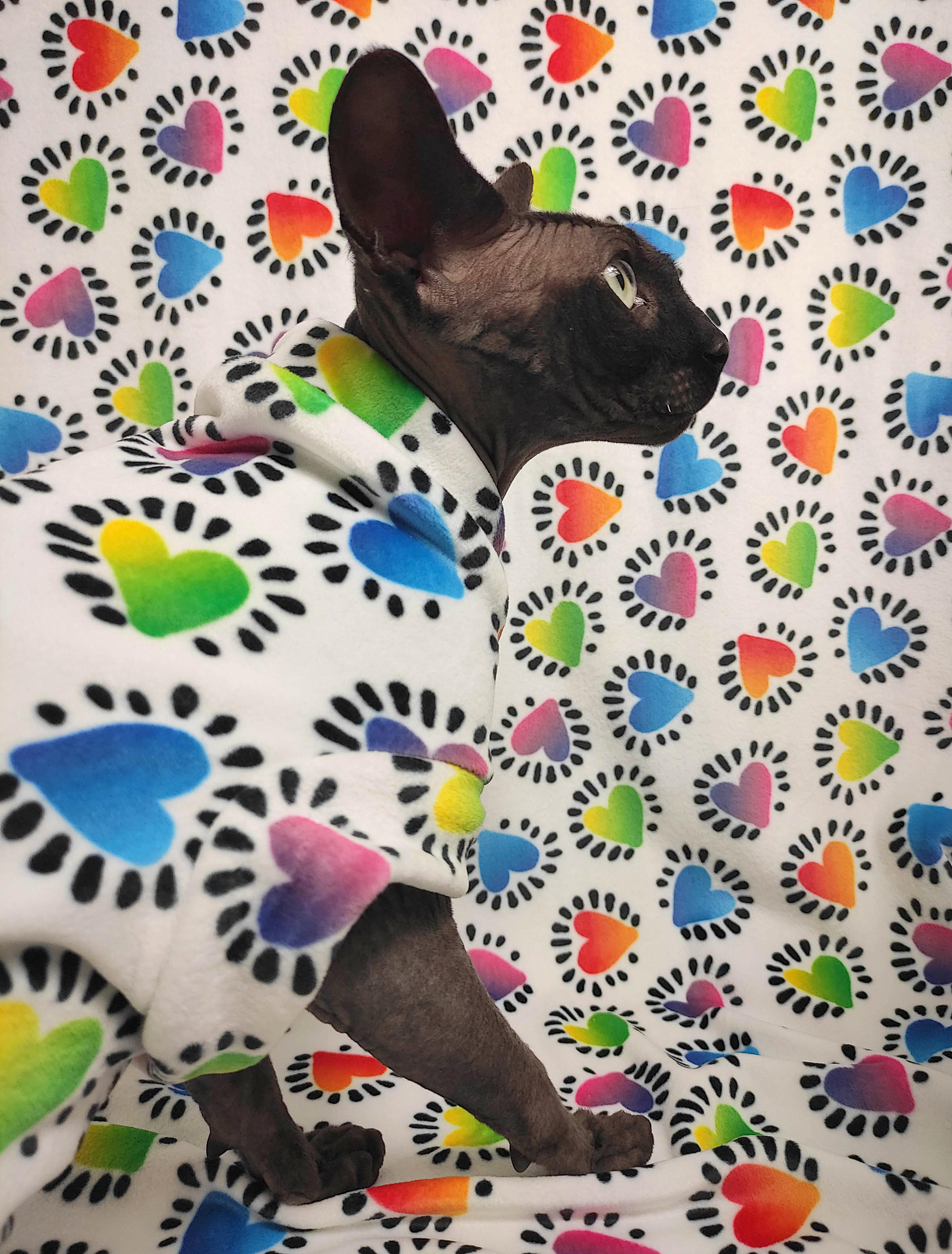 REGULAR size is for most adult hairless cats age 1 to 18. BAMBINO size fits hairless kittens age 6 months to 1 year and smaller adult cats. LIL NIPPER size fits hairless kittens age 8 weeks to 15 week olds for when they are with the breeder or for the trip home. Custom orders are welcome for larger and smaller cats - pricing is the same - $27.50