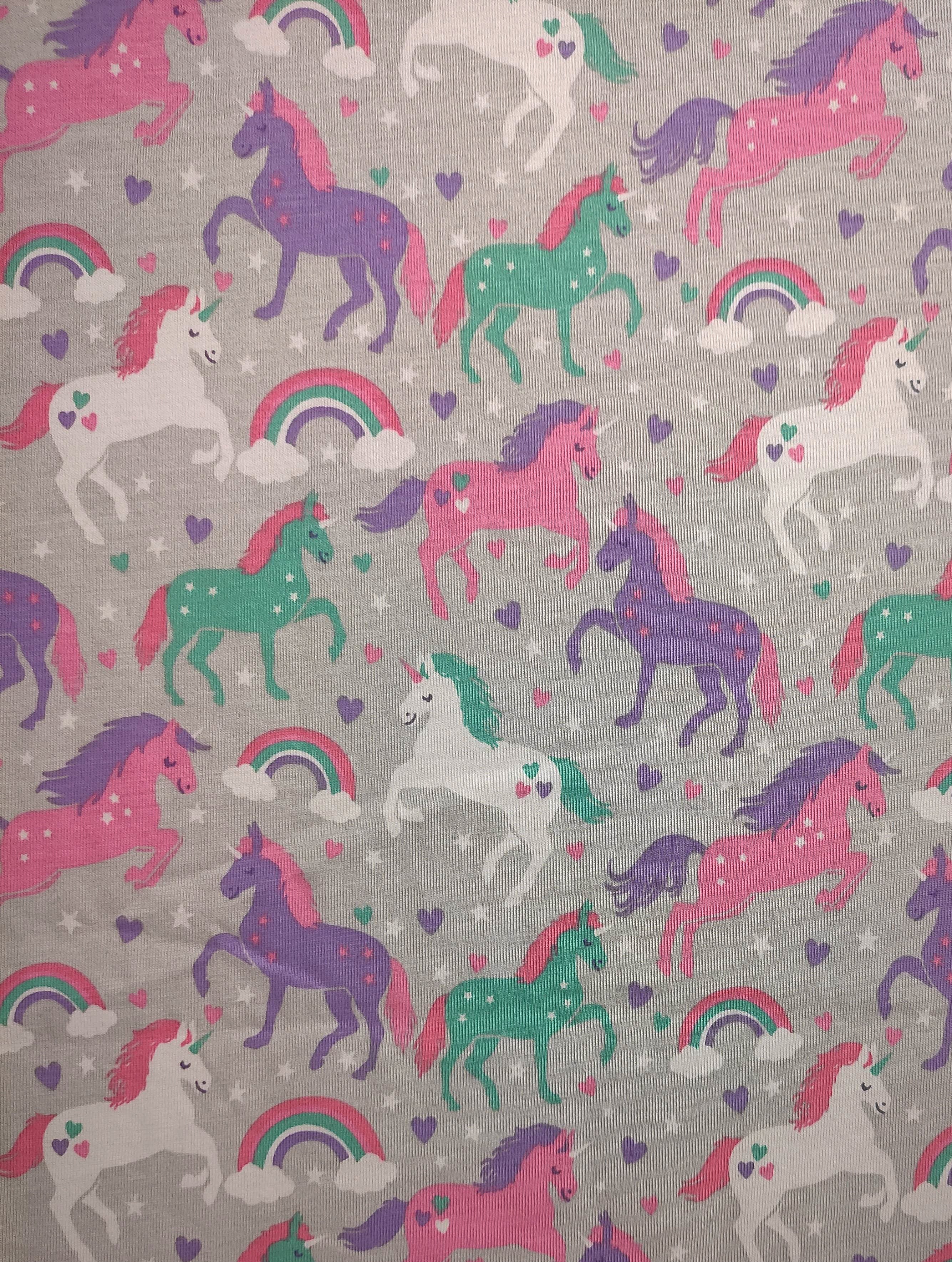 This is a lightweight stretchy cotton fabric with unicorns and rainbows adorned with reddish pink velvet trim.