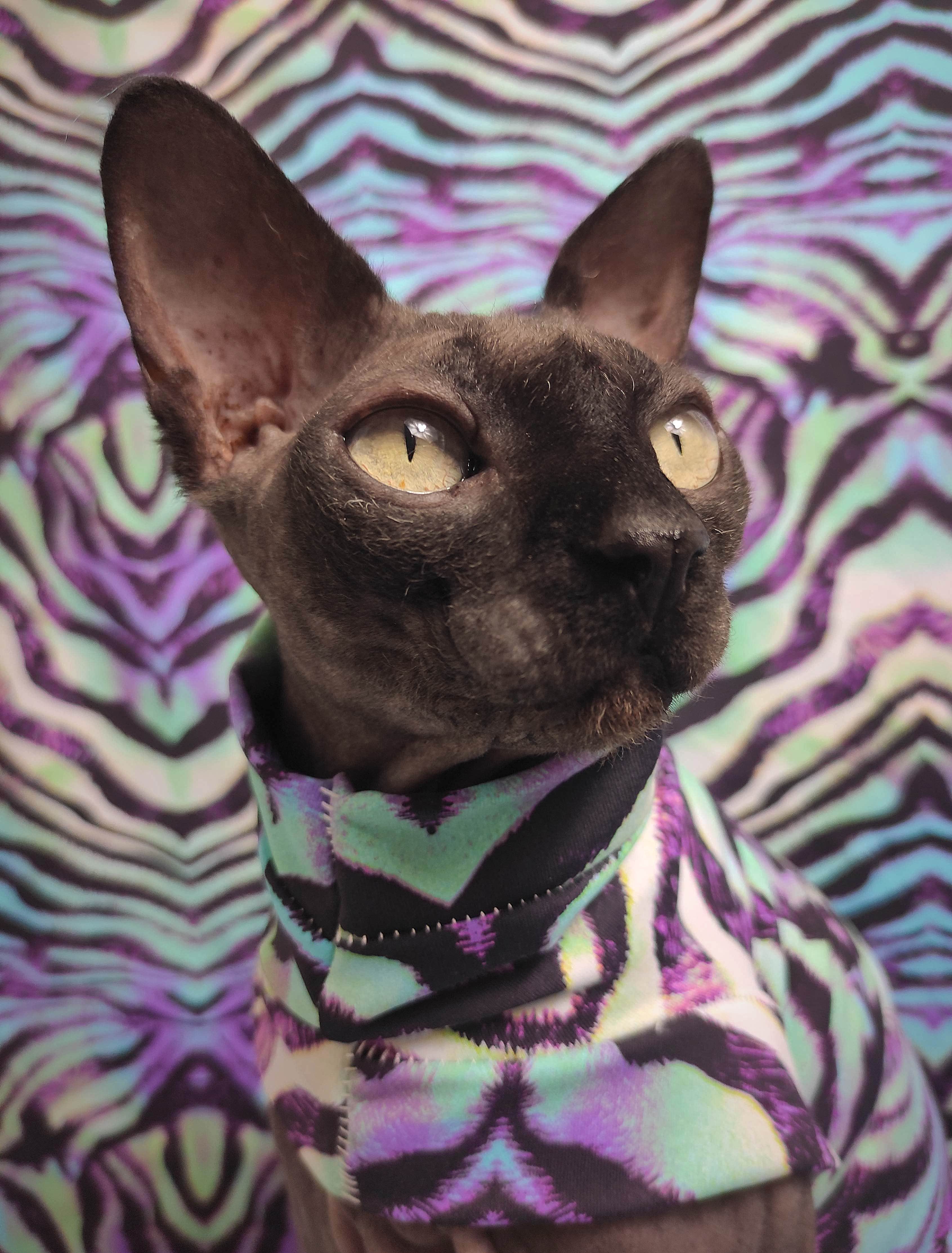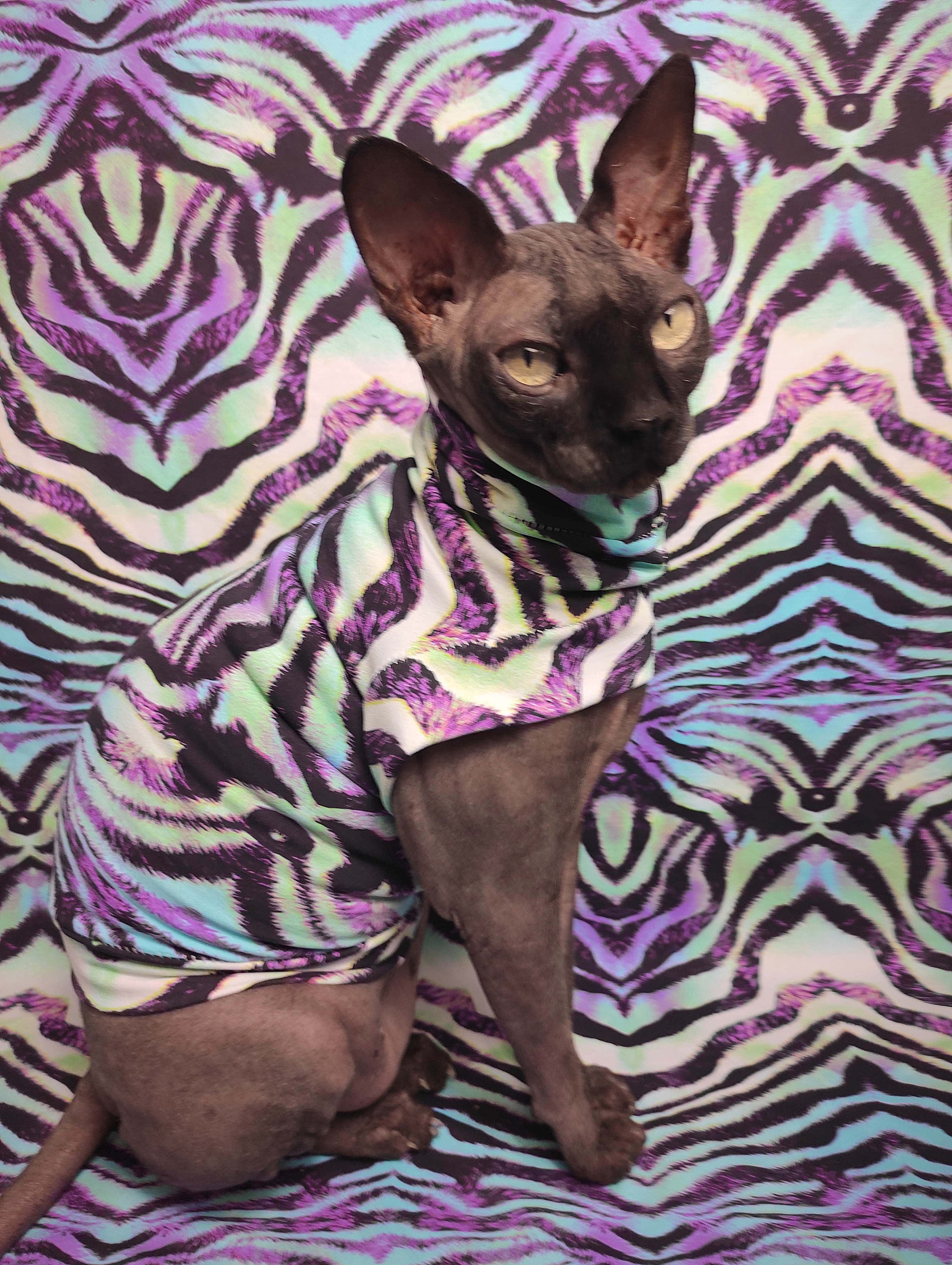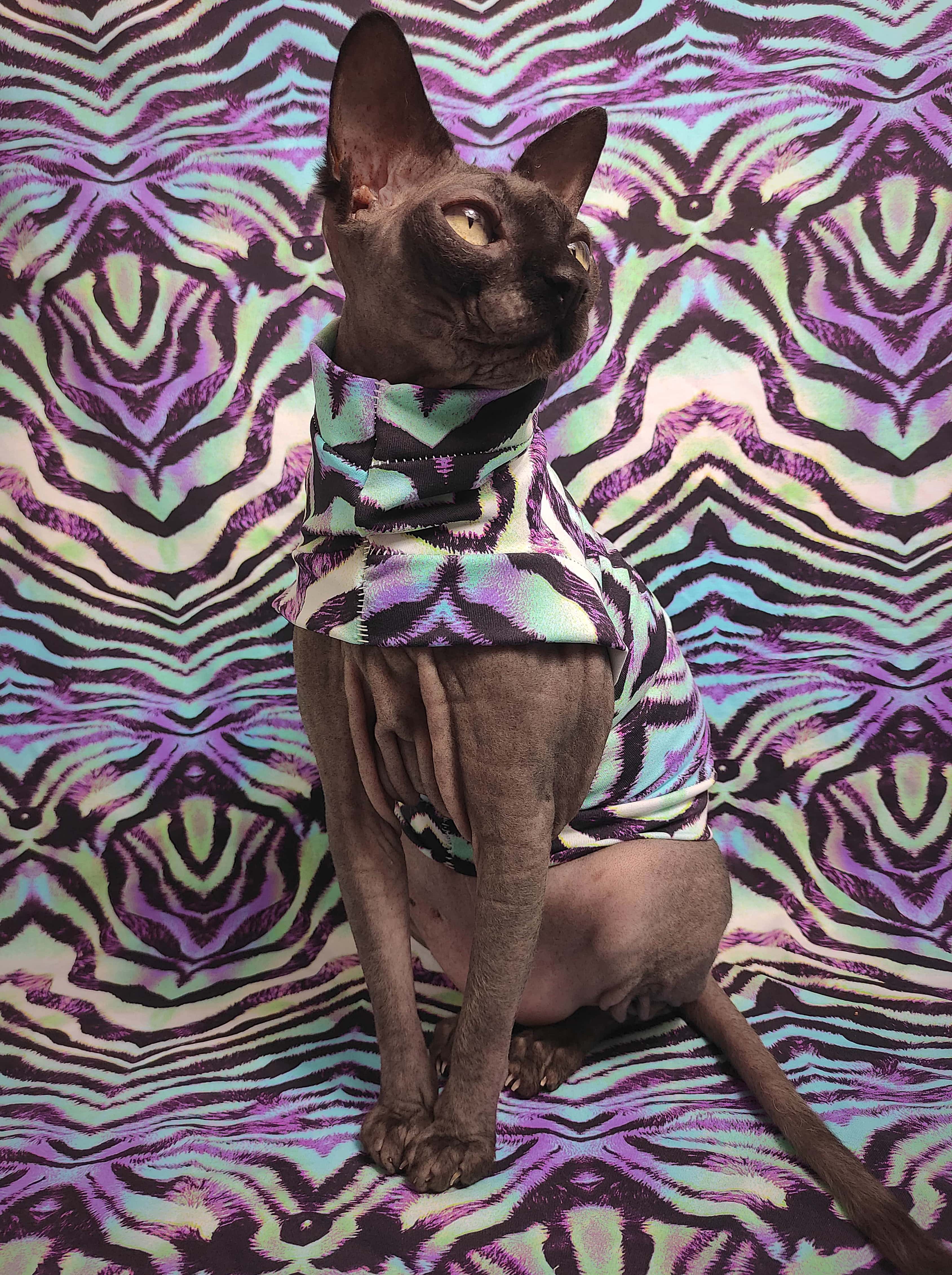 This is a beautiful vibrant sychedelic animal print. Swimwear is made from stretchy spandex fabrics that dry quickly, have a slimmer fit, larger armholes, and smaller trim that provides much needed calm and extra comfort for cats during bath time πΏπ Made with special seams that minimize the seem profile. Regular Size limited to only 8. Bambino Size is limited to only 8, Ankle Biter Size is limited to 3, Lil Nipper Size is limited to 3. No more will be made when they are gone.