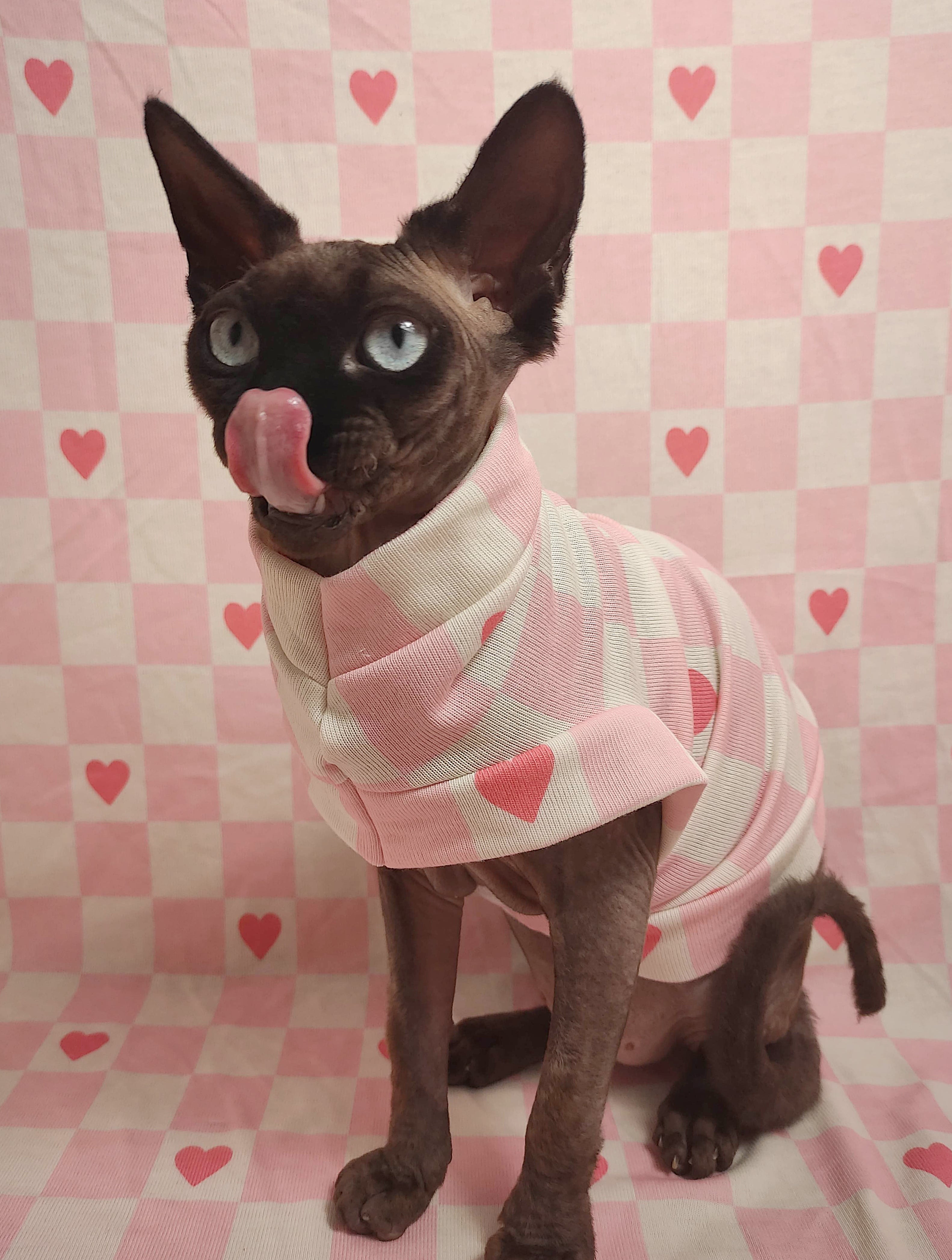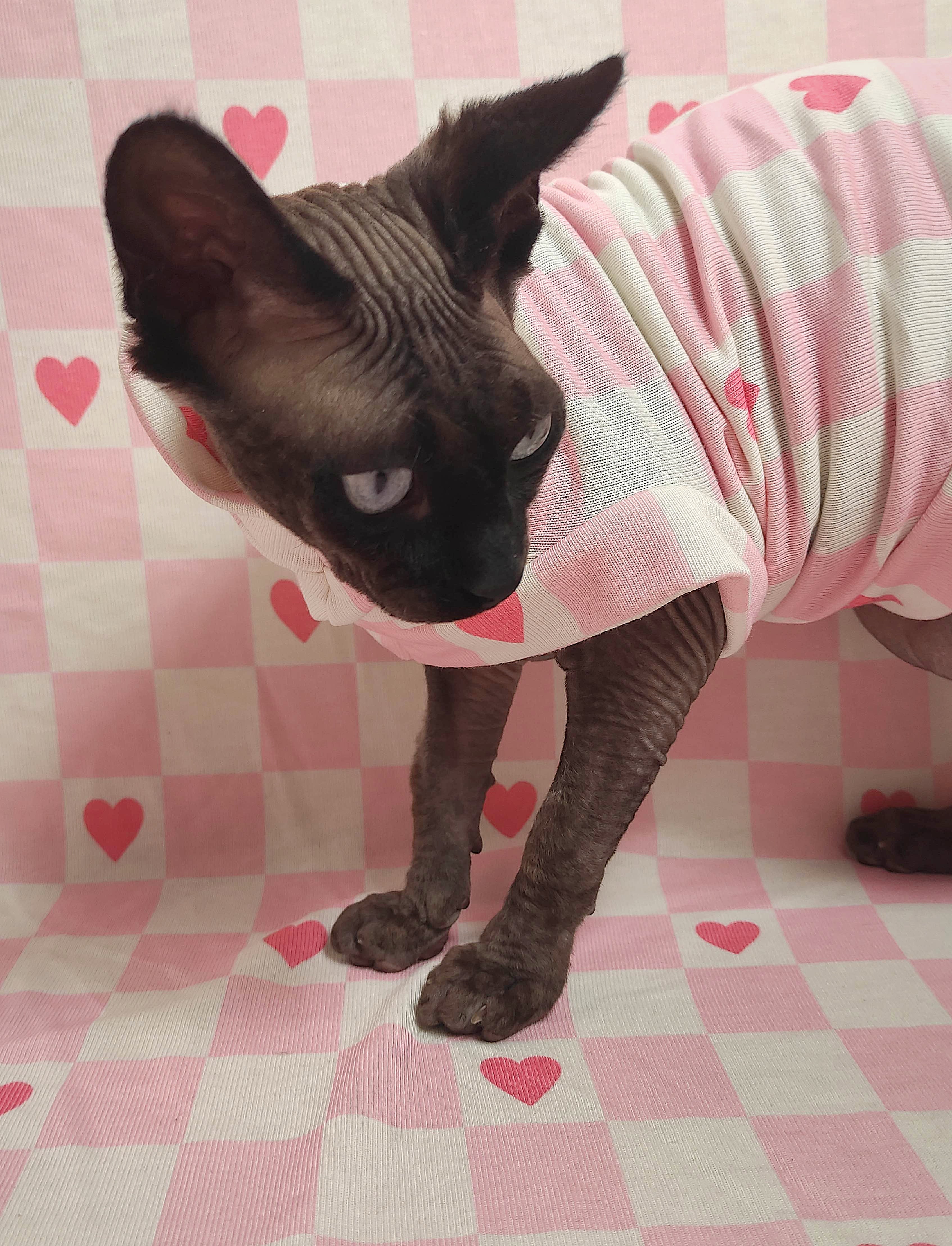 REGULAR size is for most adult hairless cats age 1 to 18. BAMBINO size fits hairless kittens age 6 months to 1 year and smaller adult cats. LIL NIPPER size fits hairless kittens age 8 weeks to 15 week olds for when they are with the breeder or for the trip home. Custom orders are welcome for larger and smaller cats - pricing is the same - $27.50
