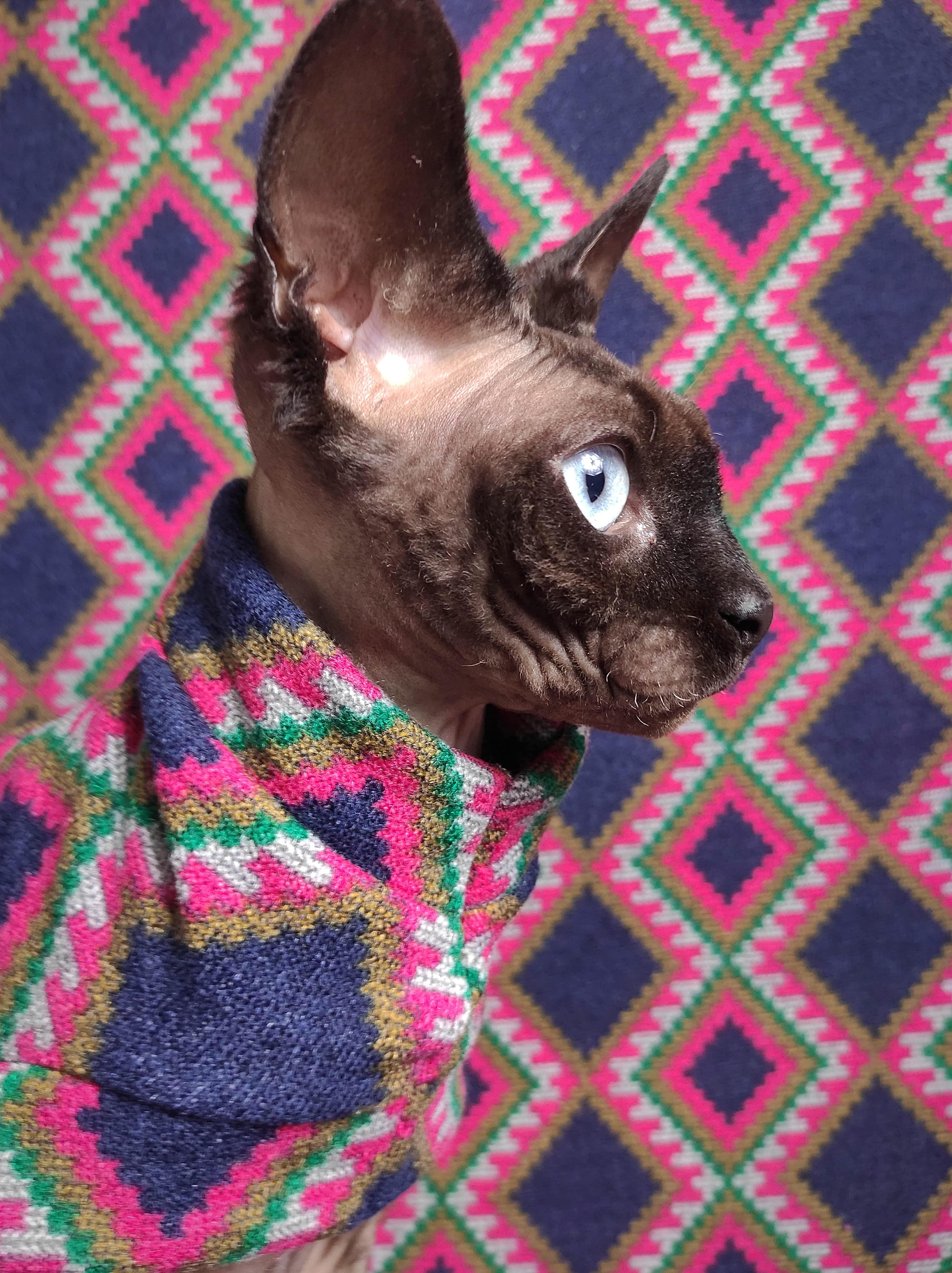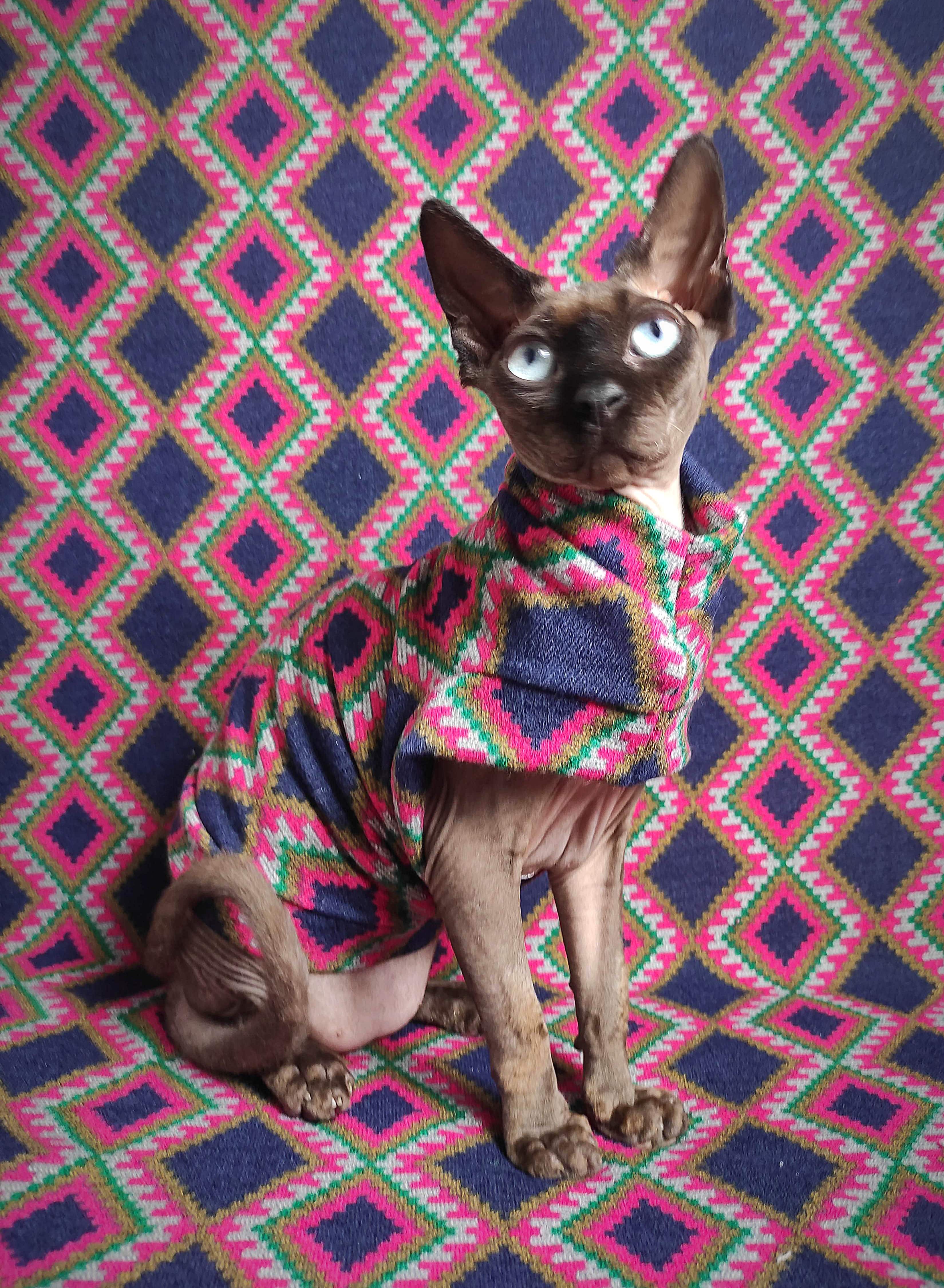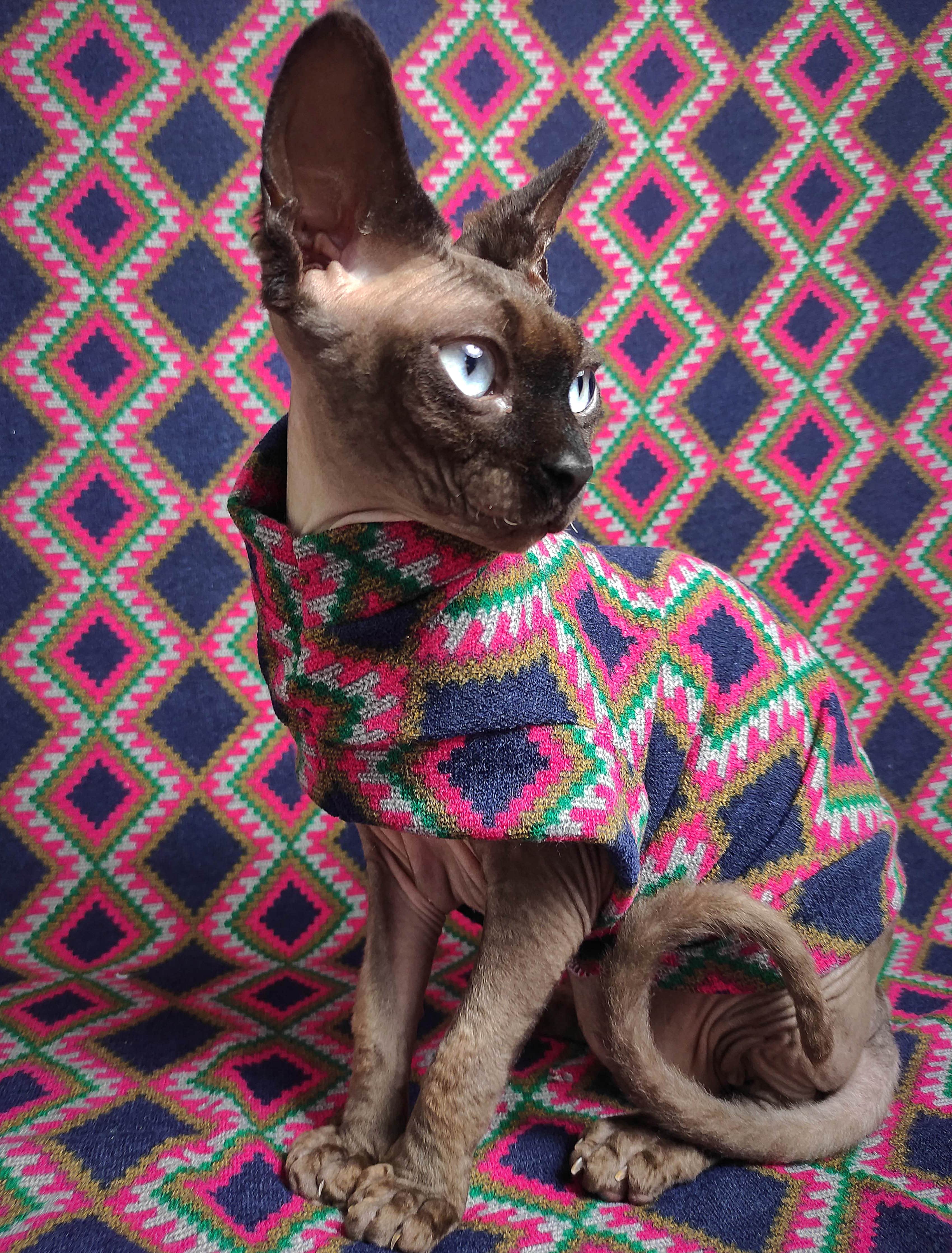 These sweaters fit like no other sweaters. Our original pattern has one hole for both front legs rather than individual holes. The unique design makes it easy to put on and take off, while allowing for improved mobility of your cat. No annoying Velcro anywhere. No awkward walking. All sweaters are machine washable and dryer safe unless specifically mentioned.