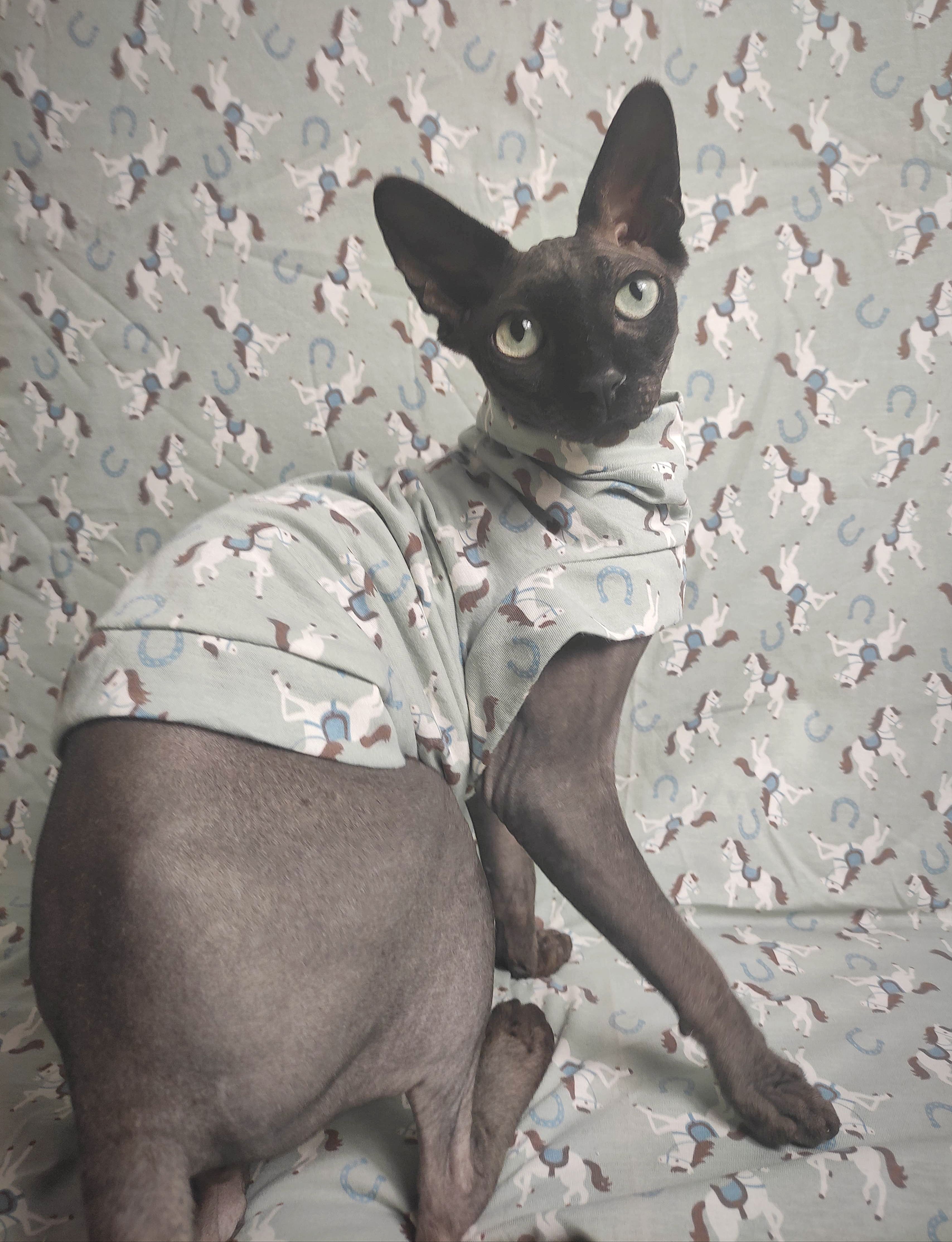 REGULAR size is for most adult hairless cats age 1 to 18. BAMBINO size fits hairless kittens age 6 months to 1 year and smaller adult cats. ANKLE BITER size fits kittens 15 weeks to 6 month olds. LIL NIPPER size fits hairless kittens age 8 weeks to 15 week olds for when they are with the breeder or for the trip home. Custom orders are welcome for larger and smaller cats - pricing is the same - $27.50