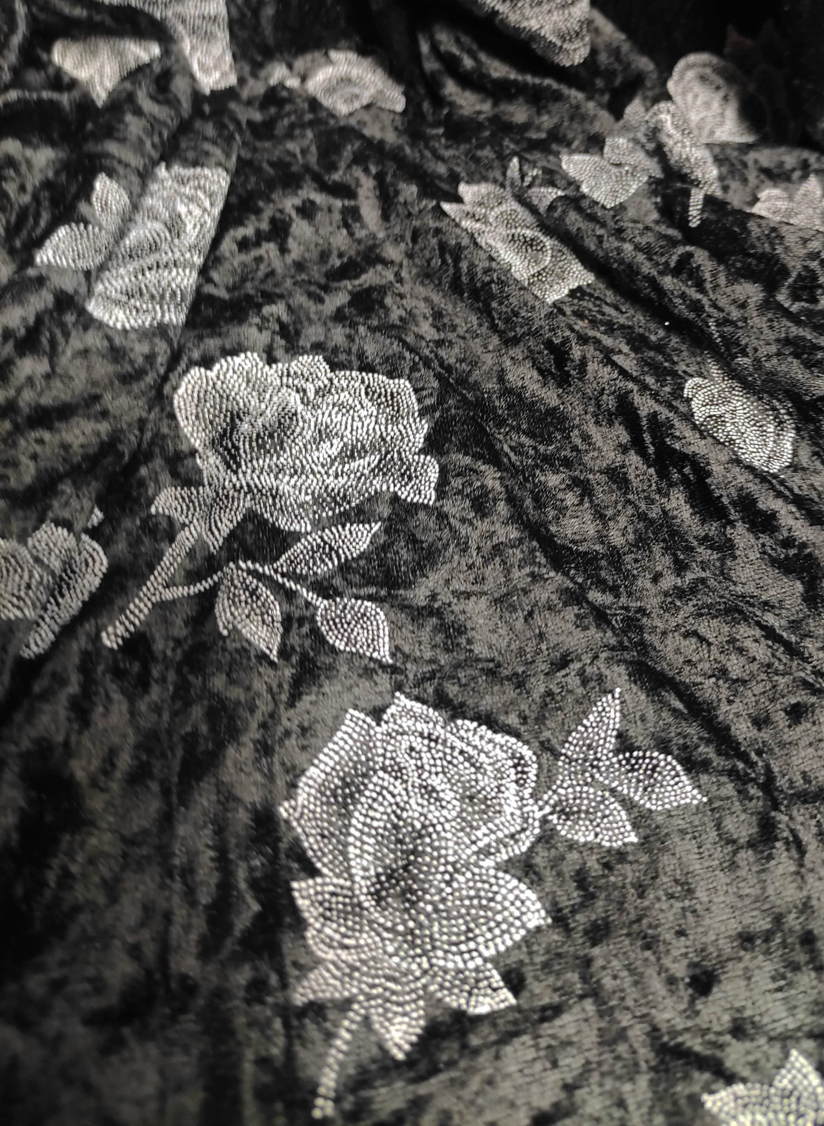 This is a beautiful lightweight stretchy black cruched velvet with printed white roses. Regular Size limited to only 8. Bambino Size is limited to only 7, Ankle Biter Size is limited to 2, Lil Nipper Size is limited to 2. No more will be made when they are gone.