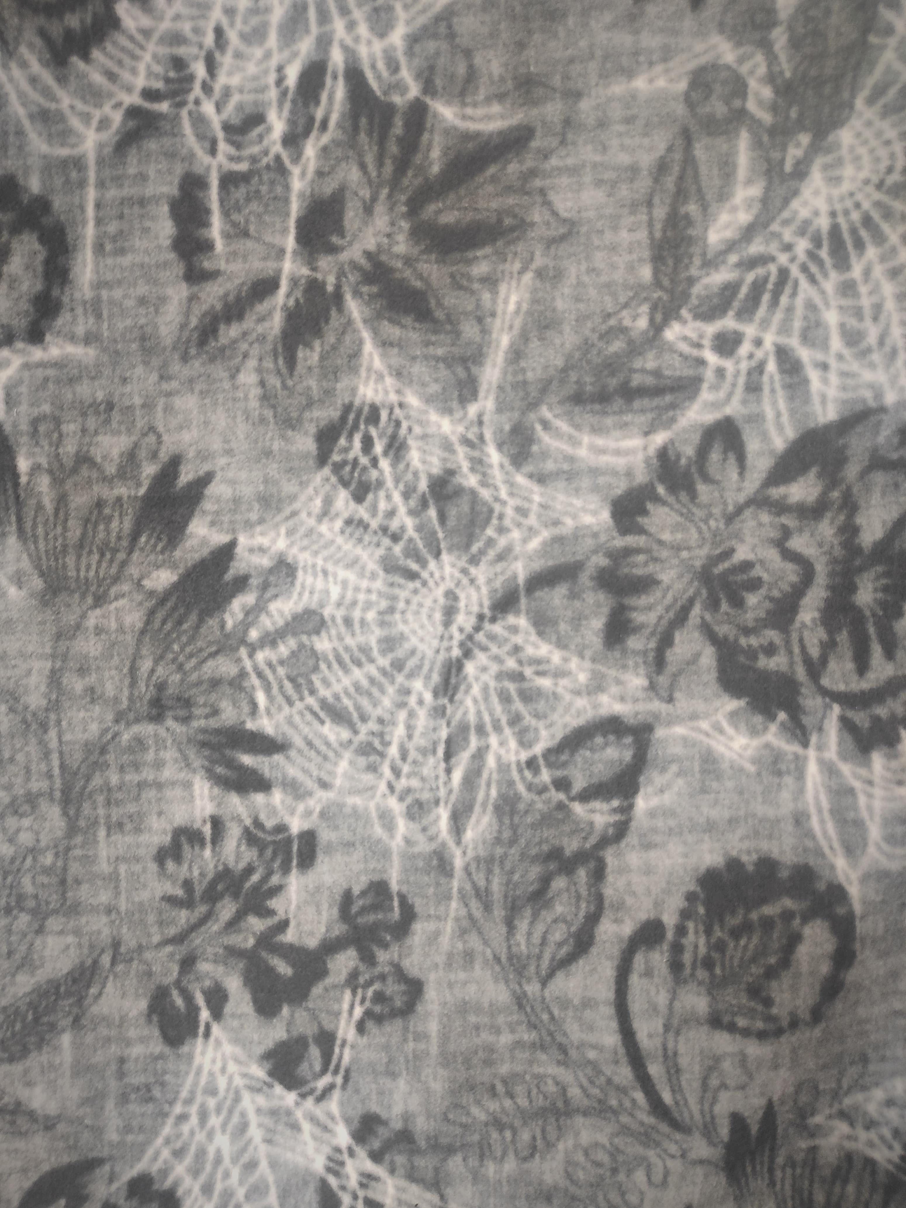 This is a soft medium weight stretchy luxe fleece with flowers and spiderwebs on grey background. Print is large and designs will be random.