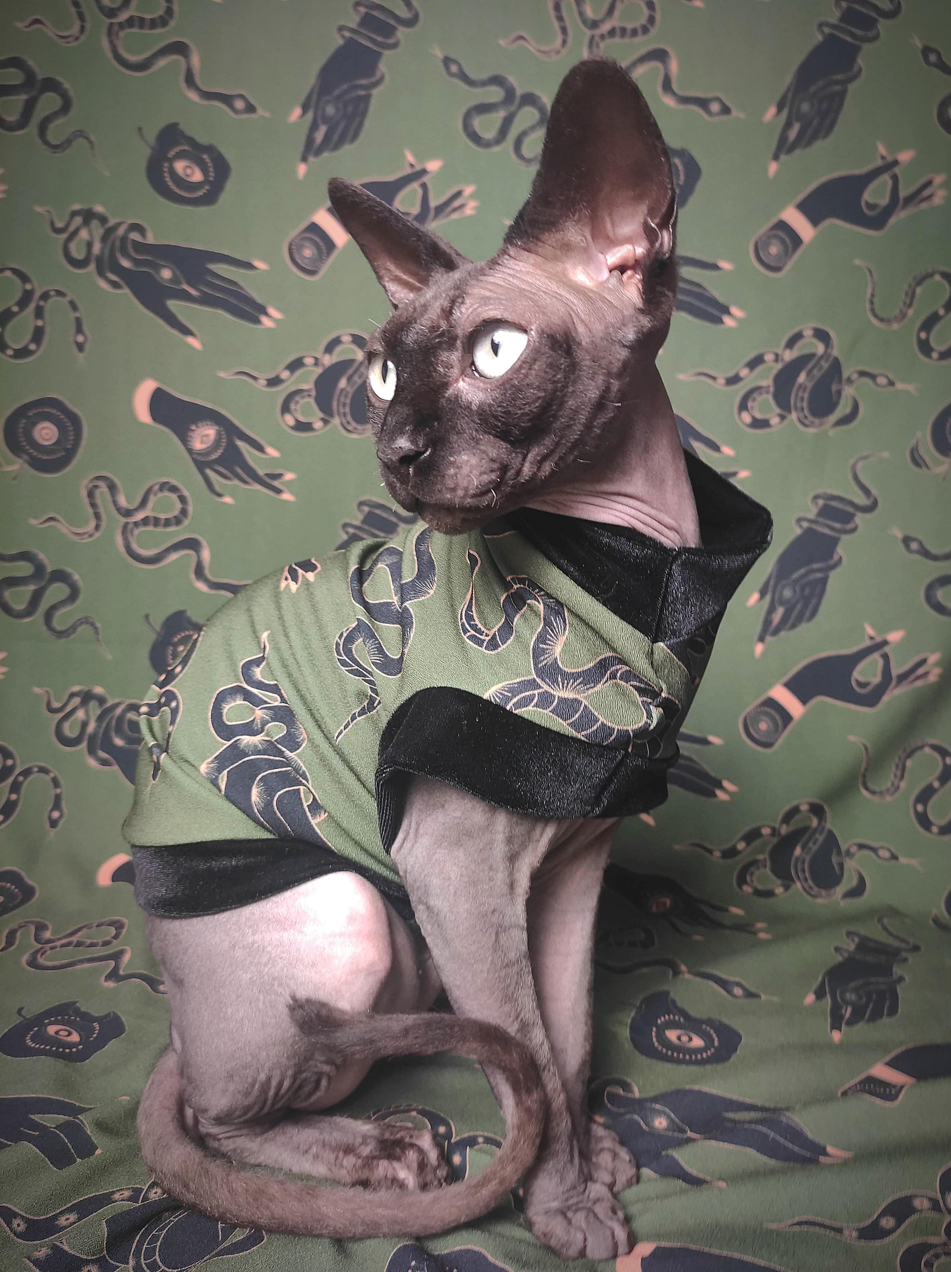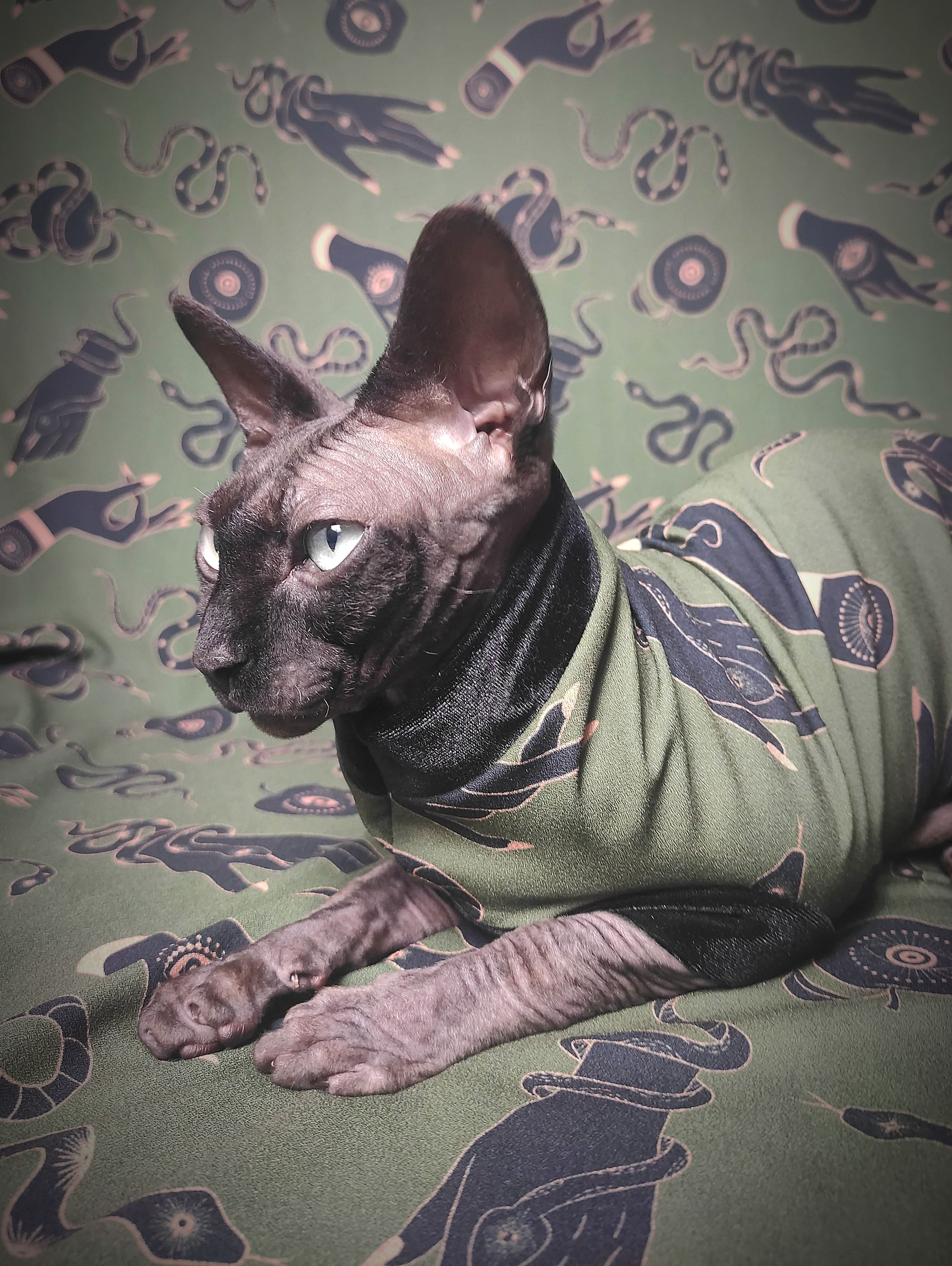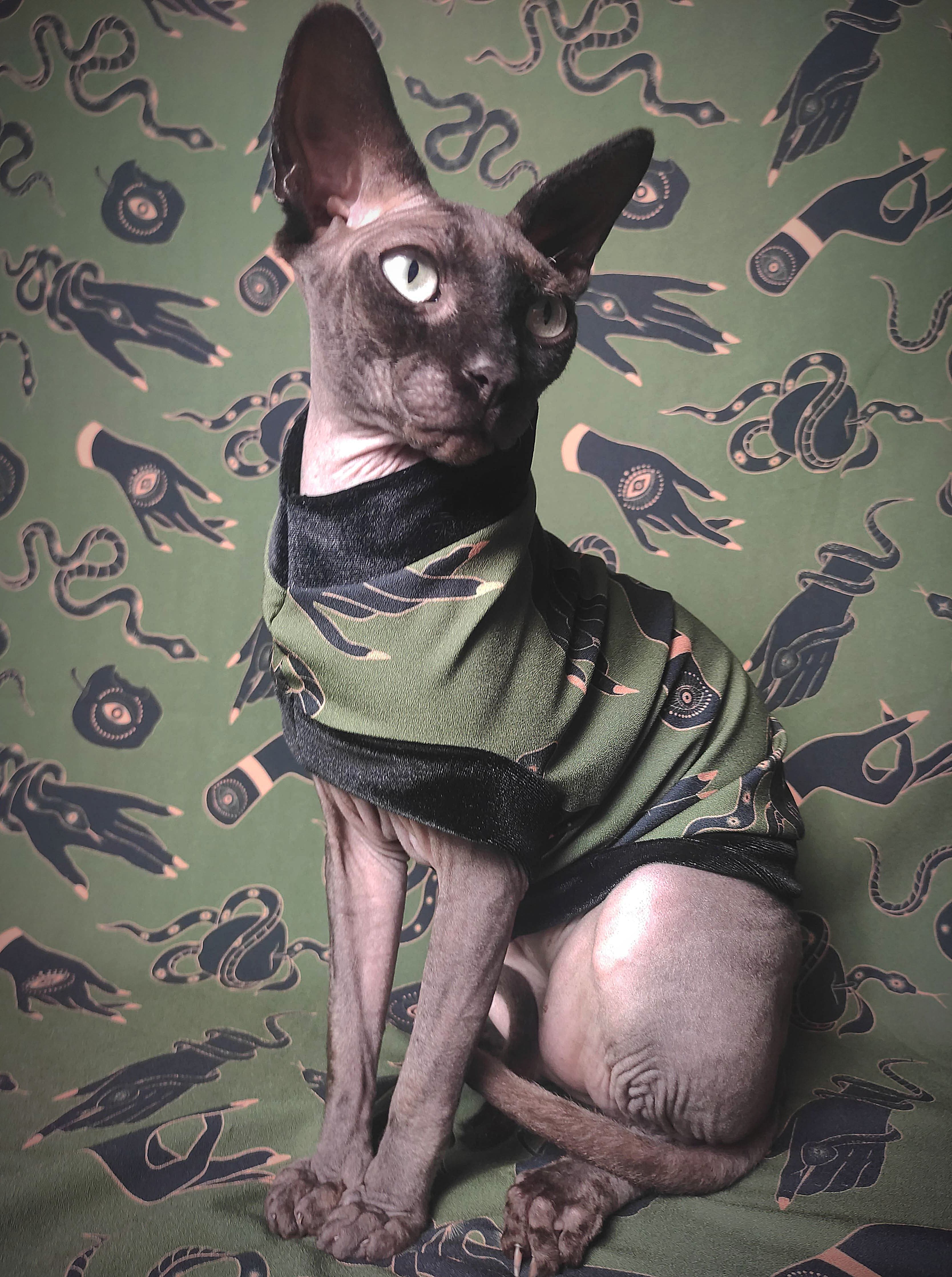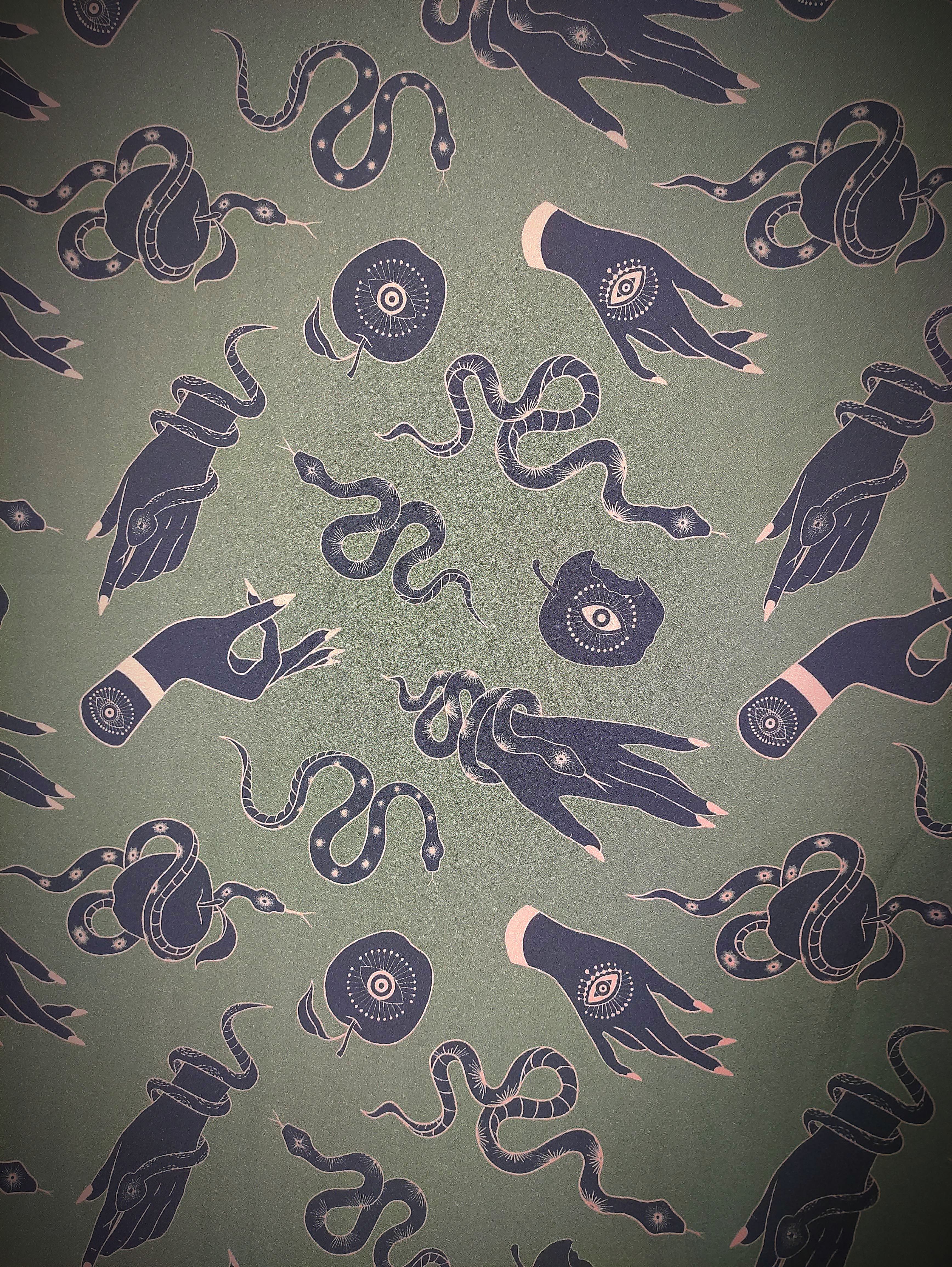 This is an amazing stretchy lightweight poly blend fabric printed with snakes, hands, eyes and apples on dark green background, finished with black velvet trim 😻 Regular Size limited to only 8, Bambino Size is limited to only 7, Ankle Biter Size is limited to 2. Lil Nipper Size is limited to 2. No more will be made when they are gone.