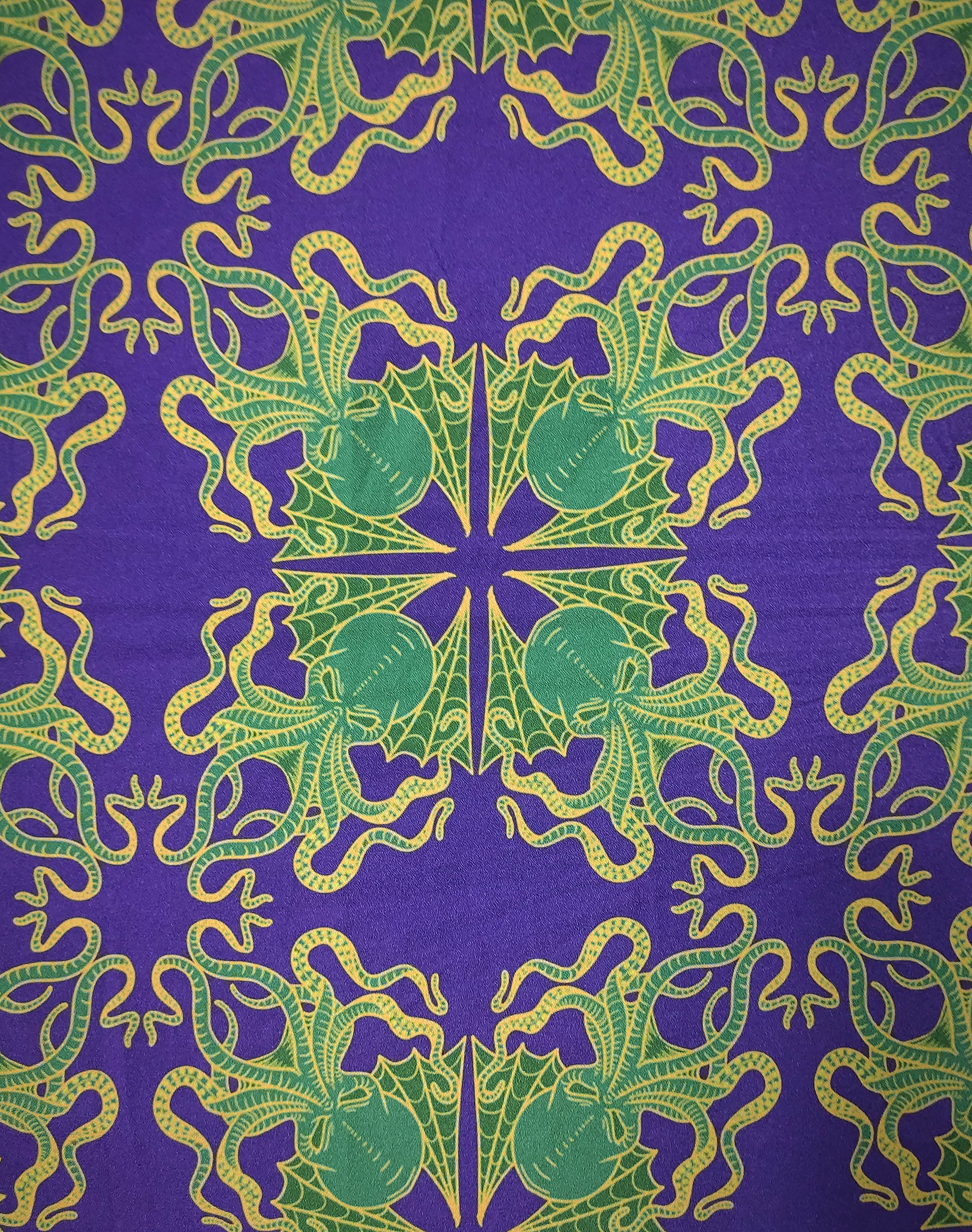 This is an amazing lightweight poly blend fabric printed with octopus bats on dark purple background, finished with gold velvet trim 😻 Regular Size limited to only 8, Bambino Size is limited to only 7, Ankle Biter Size is limited to 2. Lil Nipper Size is limited to 2. No more will be made when they are gone.