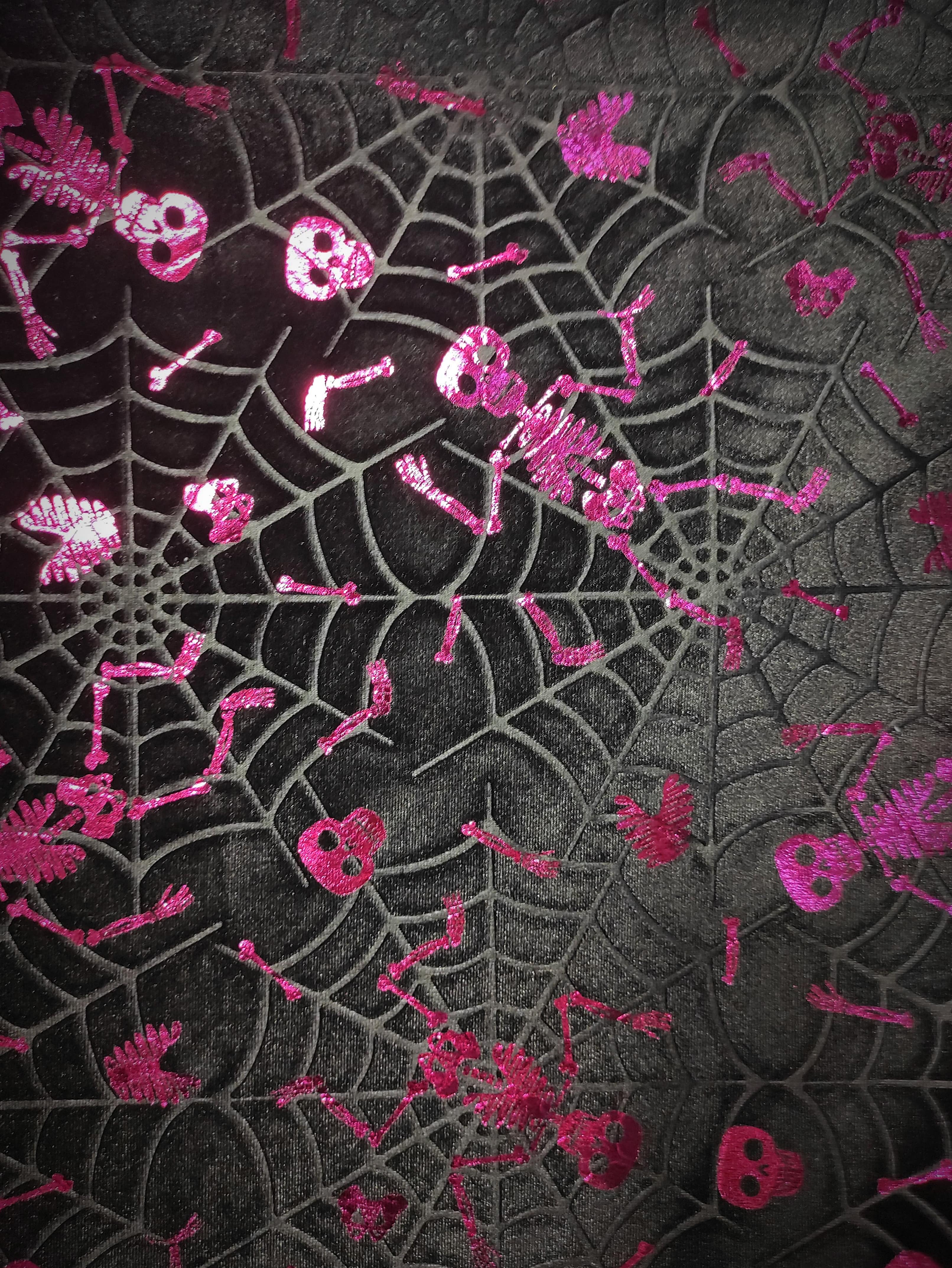 This is a midweight stretchy black velvet with embossed pink mirror skeletons and black spiderwebs, featuring solid black velvet trim.