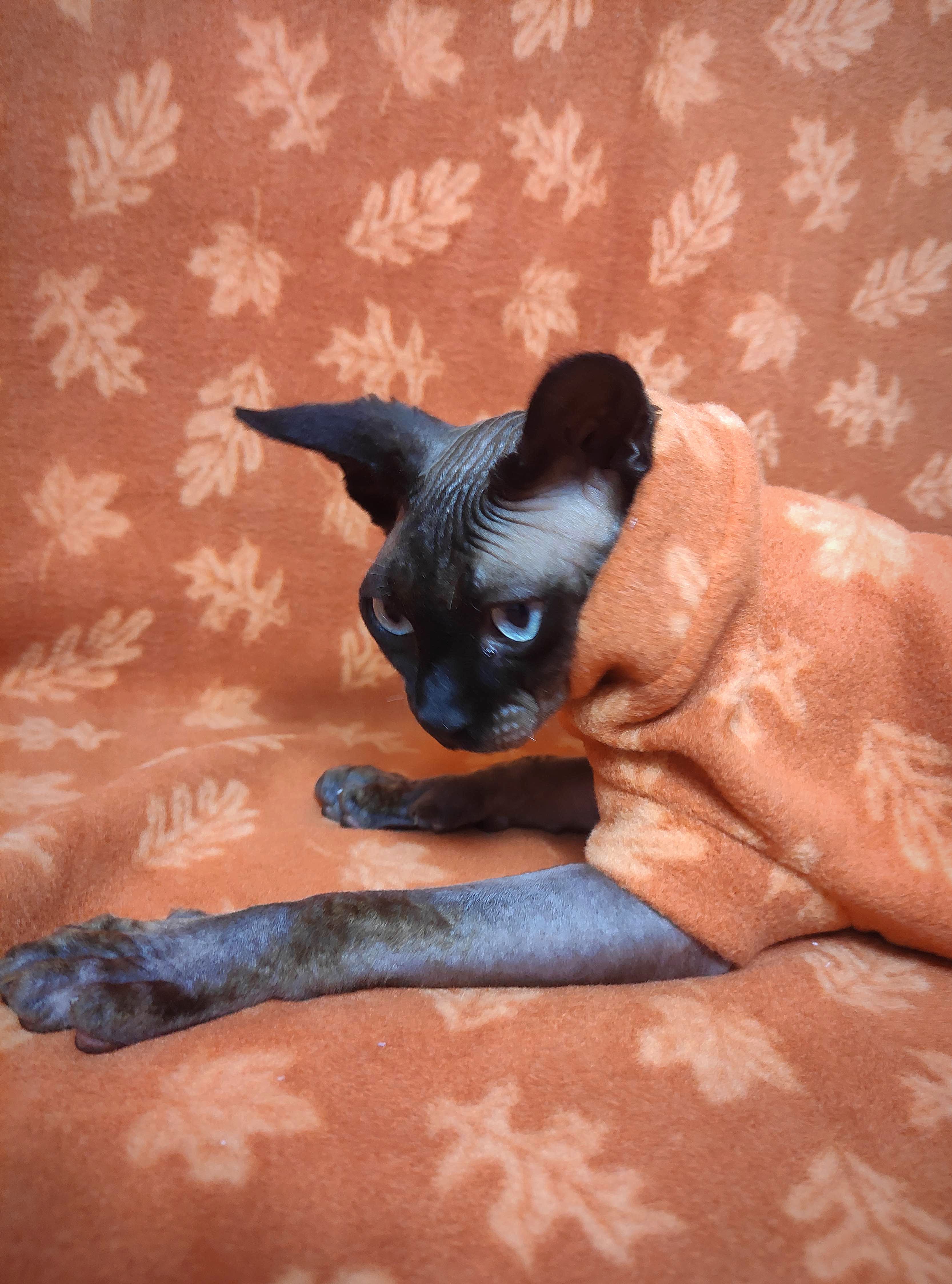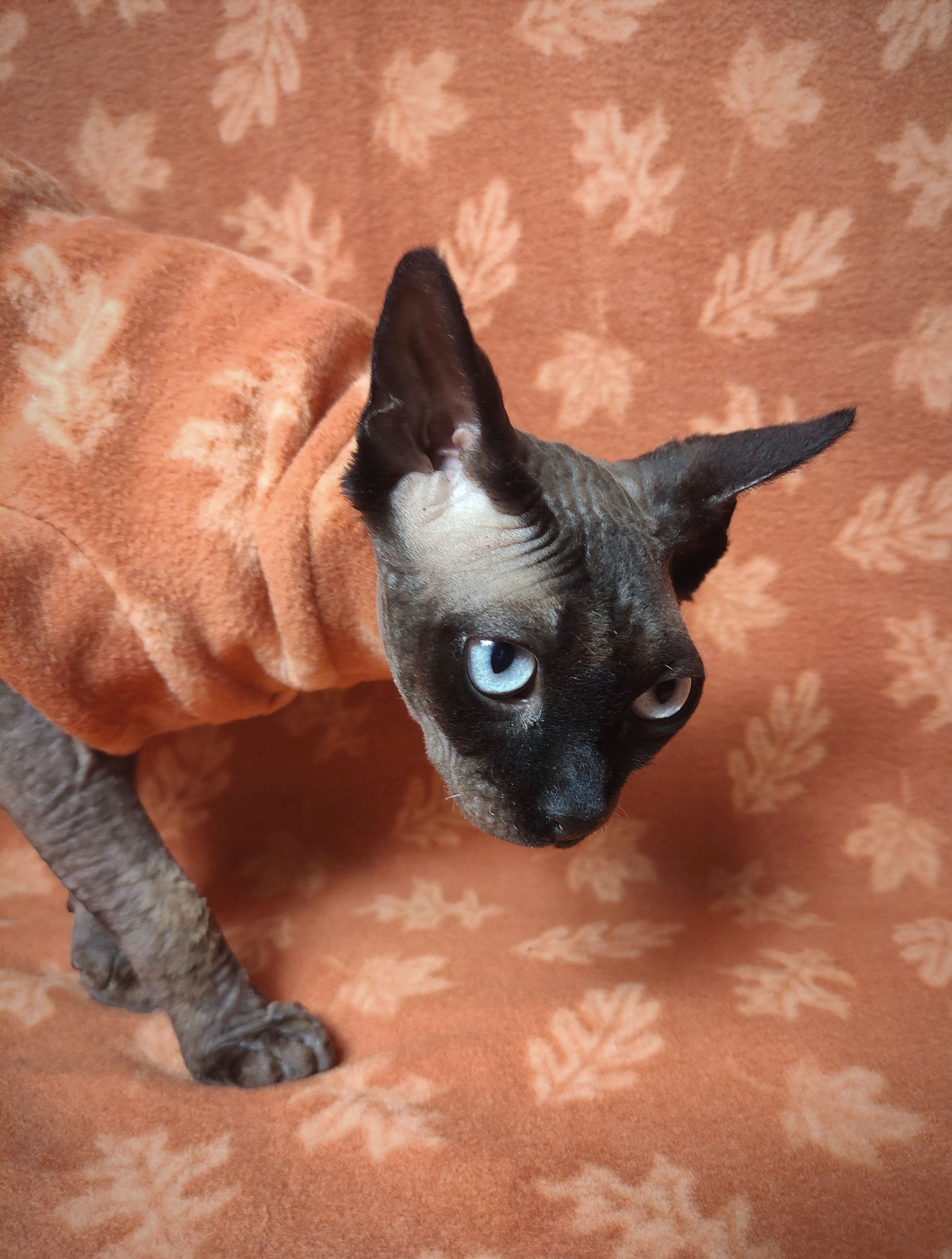 REGULAR size is for most adult hairless cats age 1 to 18. BAMBINO size fits hairless kittens age 6 months to 1 year and smaller adult cats. LIL NIPPER size fits hairless kittens age 8 weeks to 15 week olds for when they are with the breeder or for the trip home. Custom orders are welcome for larger and smaller cats - pricing is the same - $27.50